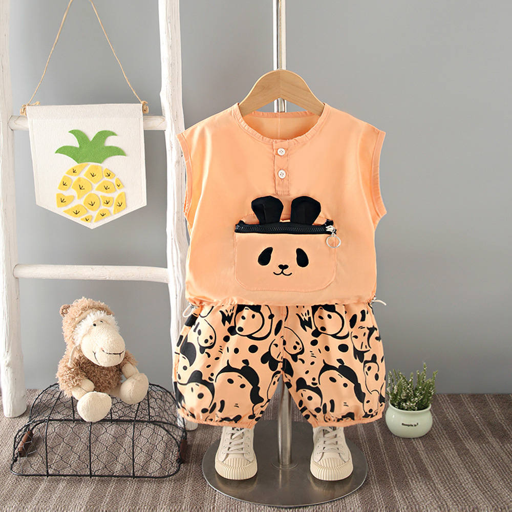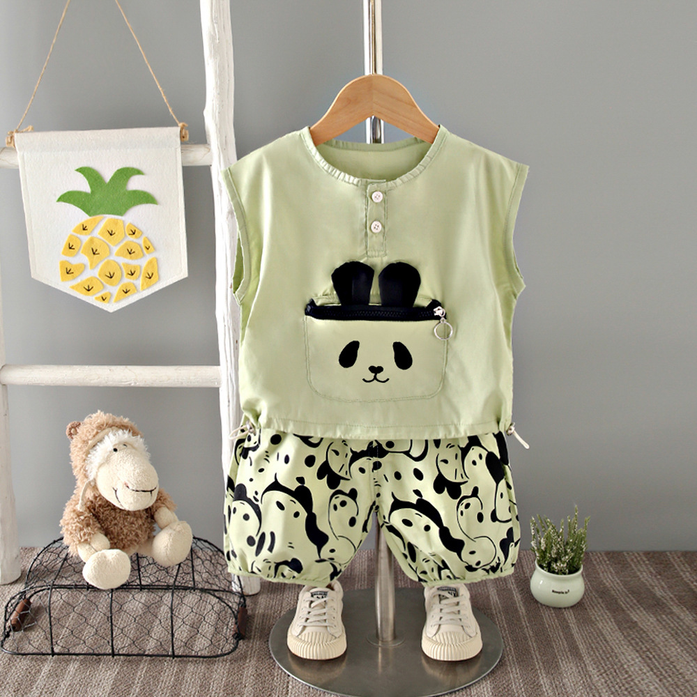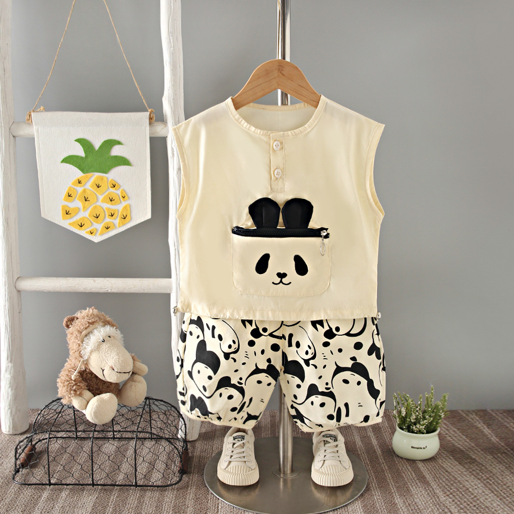 2024 년 여름 새로운 한국 아동복 포켓 팬더 조끼 투피스 민소매 여름 어린이 세트 세대 헤어