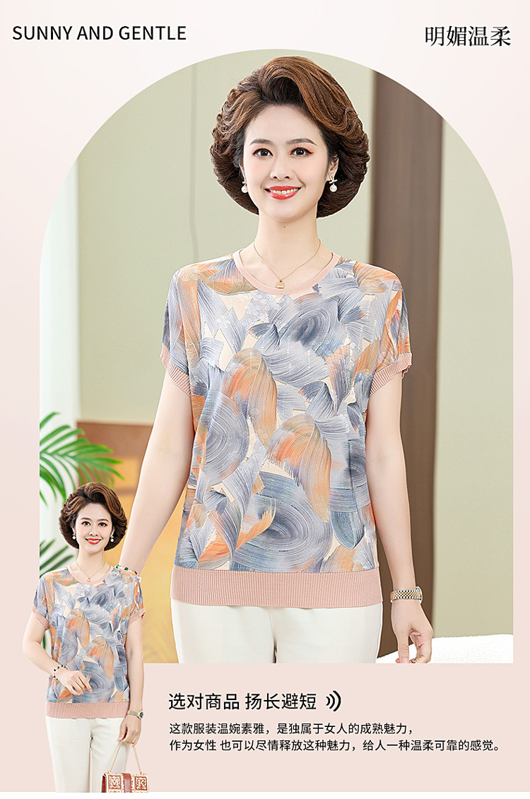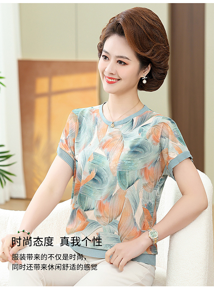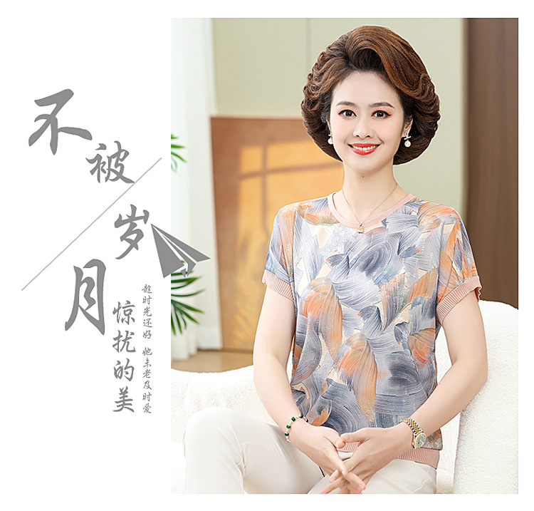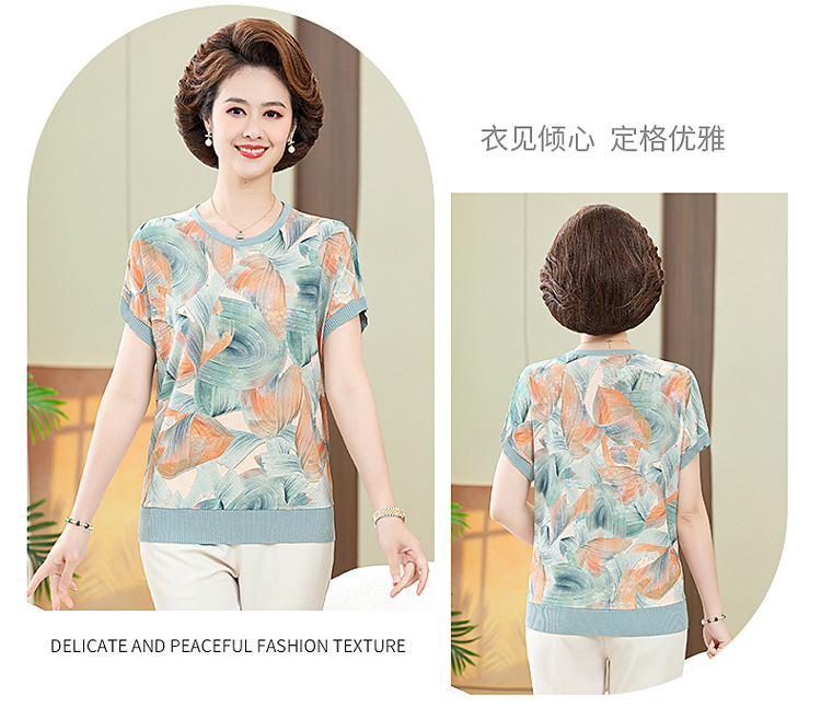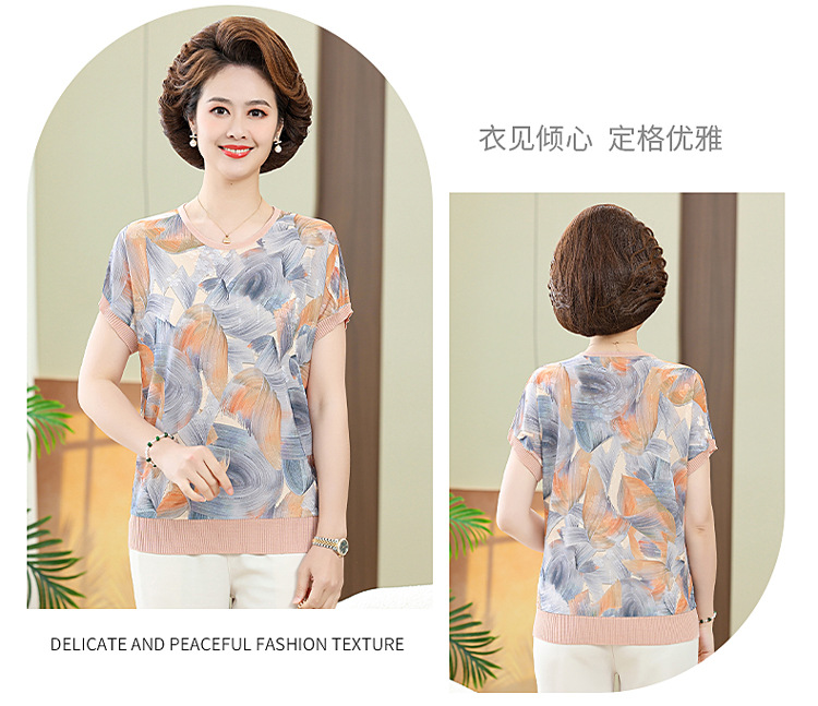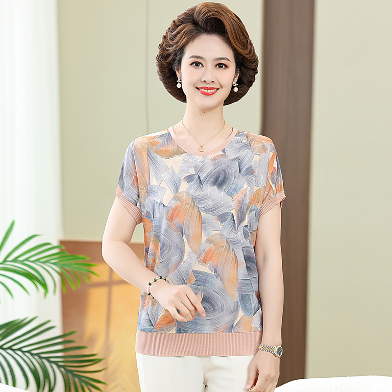 어머니의 새로운 스타일 여성의 중년 및 노인 유행 반팔 티셔츠 둥근 목 인쇄 40 세 50 세 여름 아이스 실크 탑