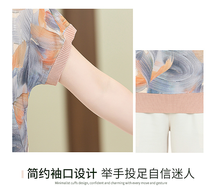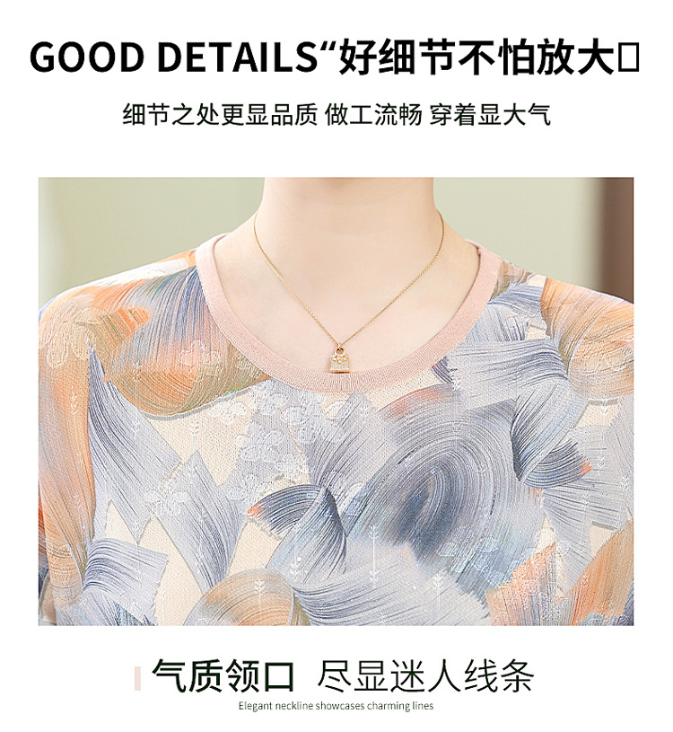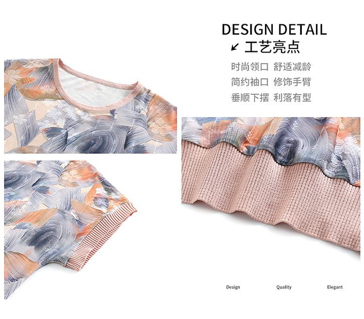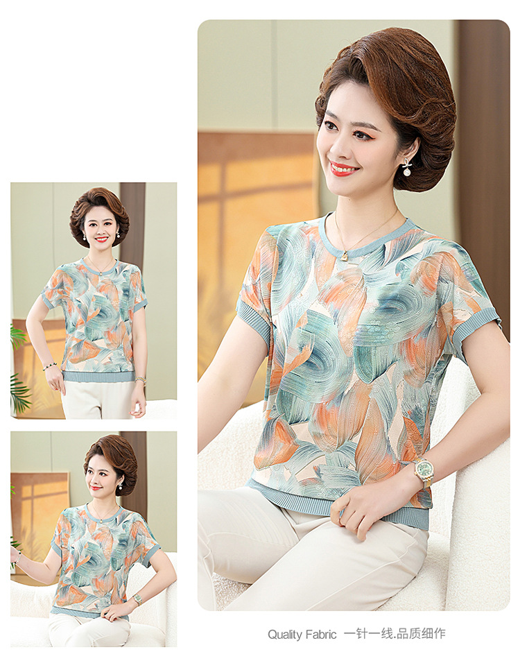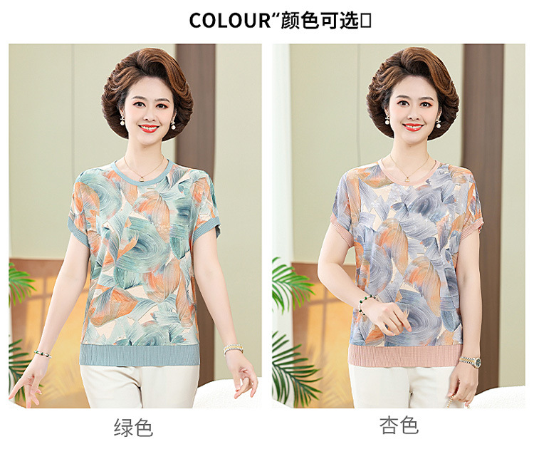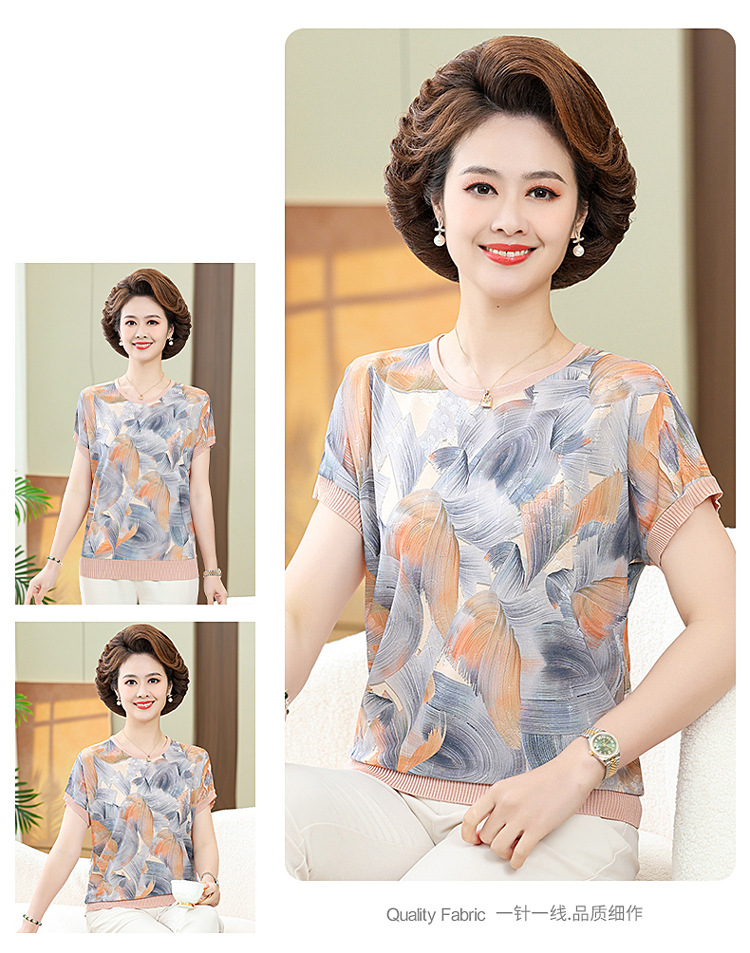 어머니의 새로운 스타일 여성의 중년 및 노인 유행 반팔 티셔츠 둥근 목 인쇄 40 세 50 세 여름 아이스 실크 탑