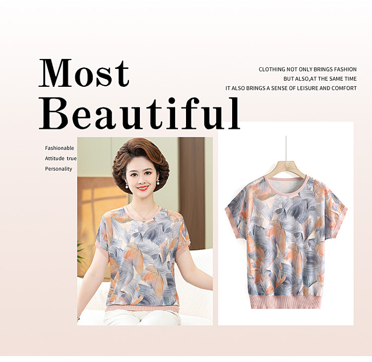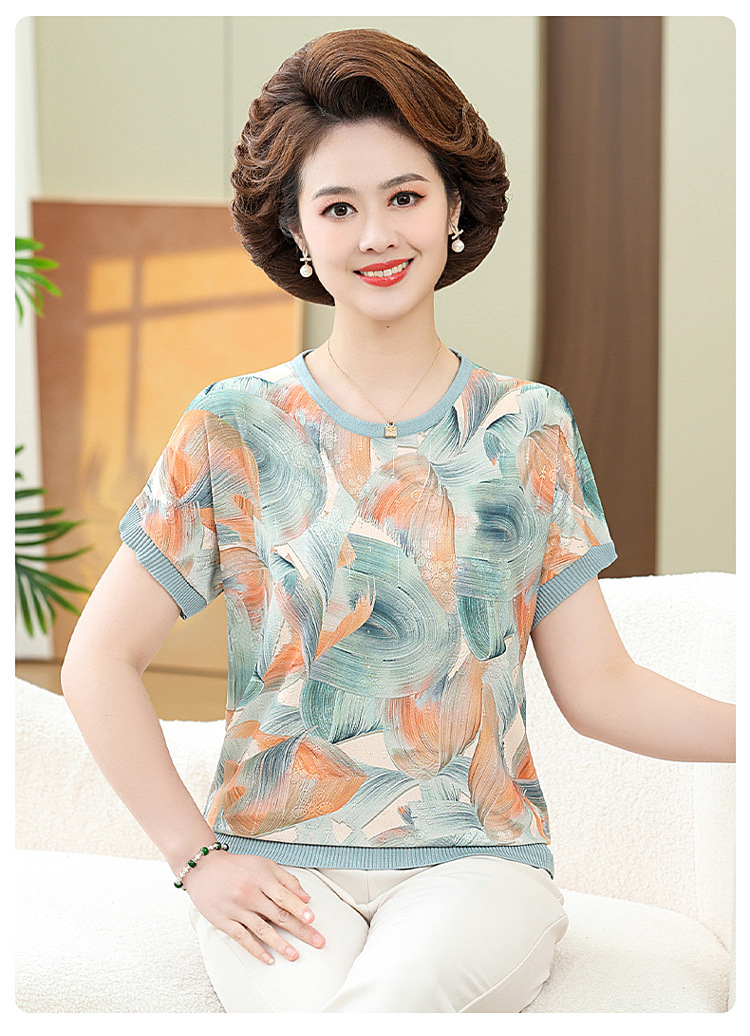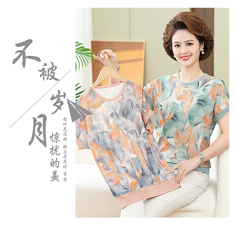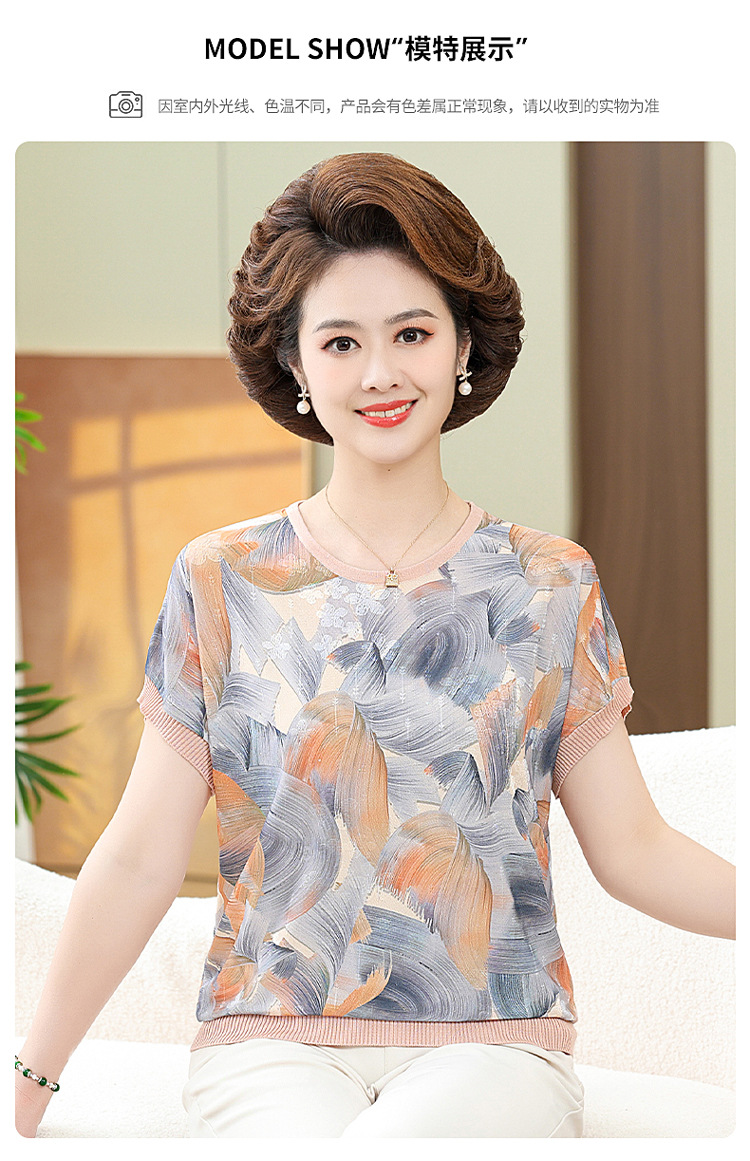 어머니의 새로운 스타일 여성의 중년 및 노인 유행 반팔 티셔츠 둥근 목 인쇄 40 세 50 세 여름 아이스 실크 탑스토어 가기