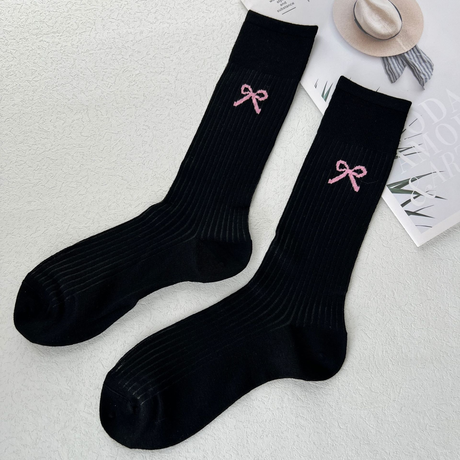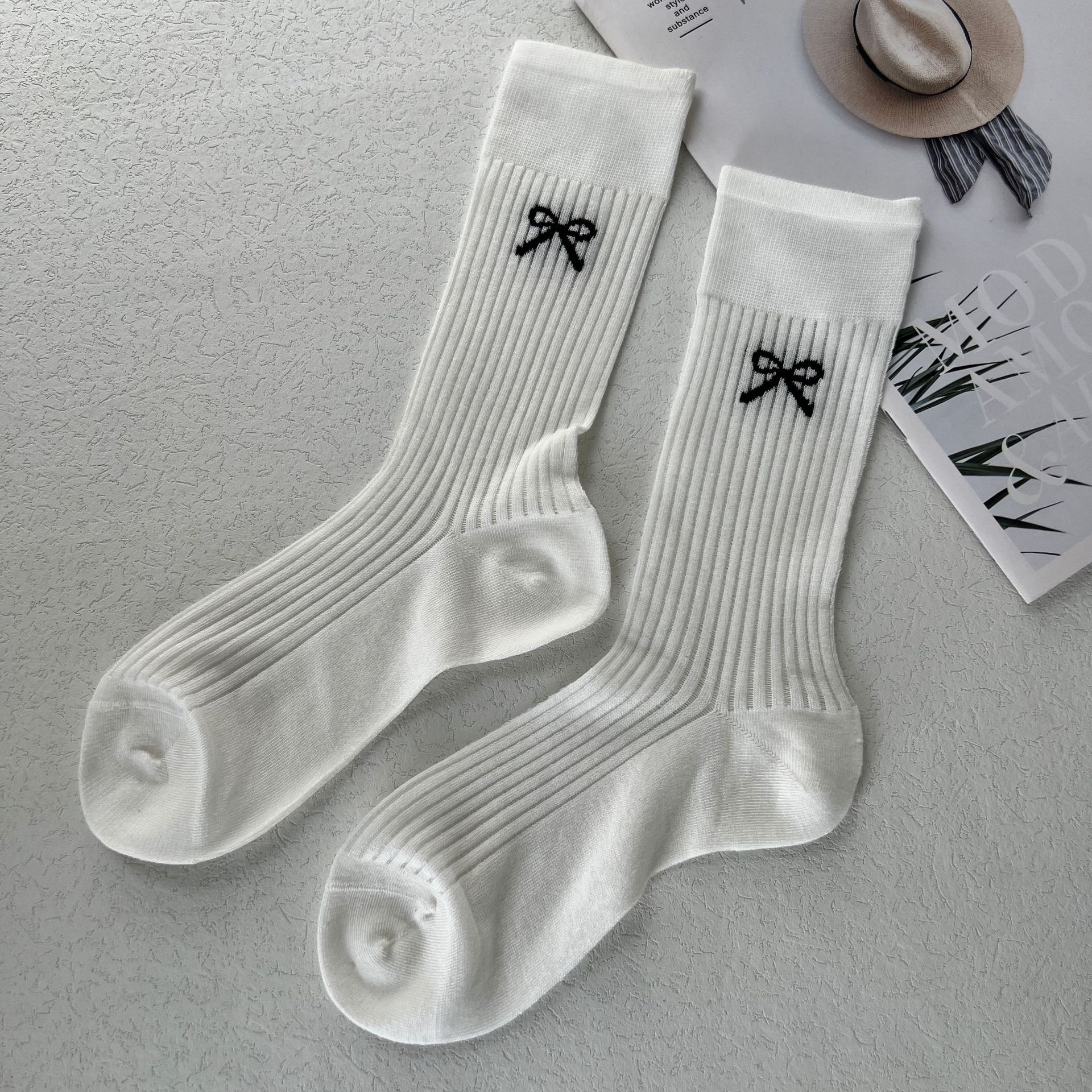 미우 보우 중간 길이의 양말 여성용 스택 양말 봄과 여름 얇은 뼈없는 양말 한국 유행 양말