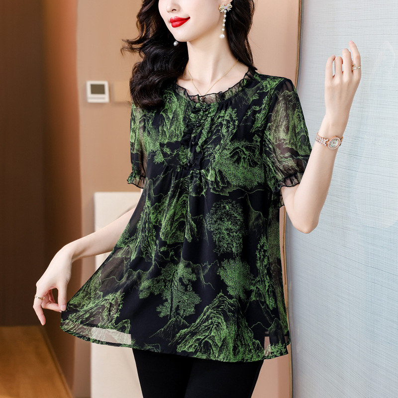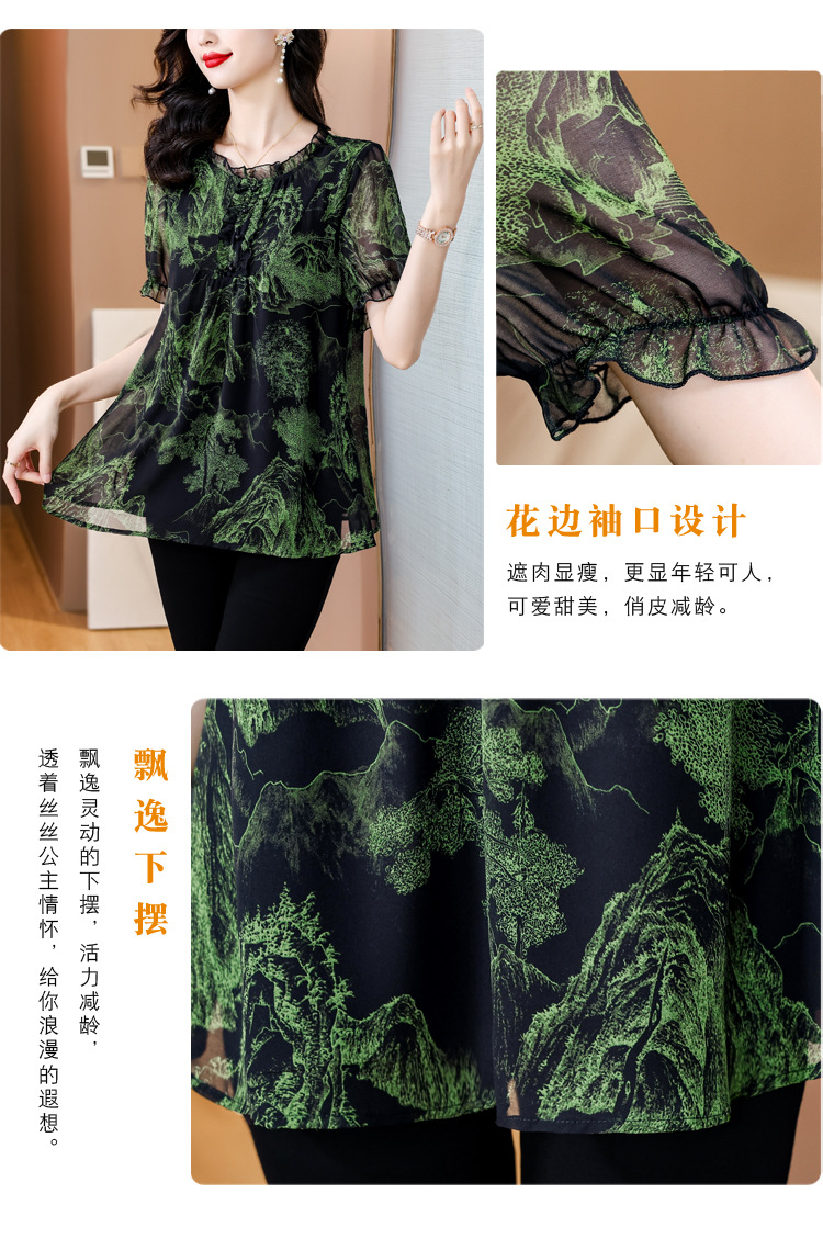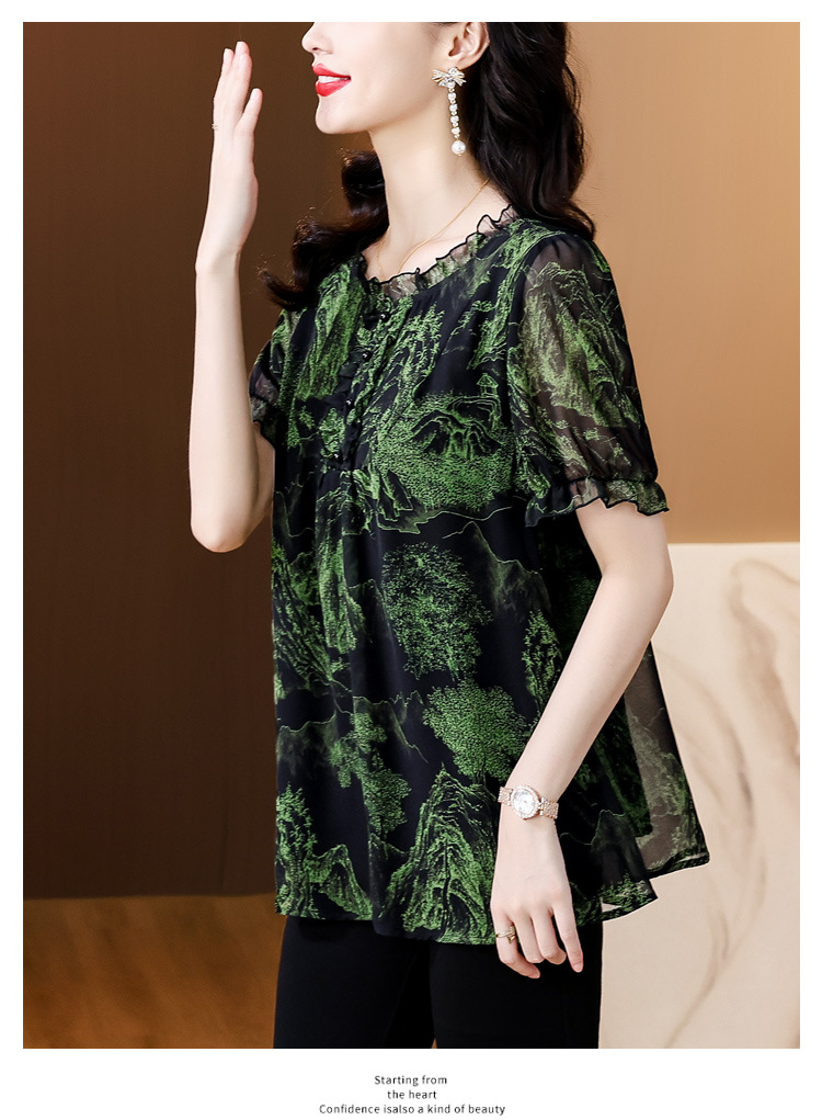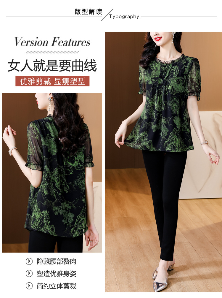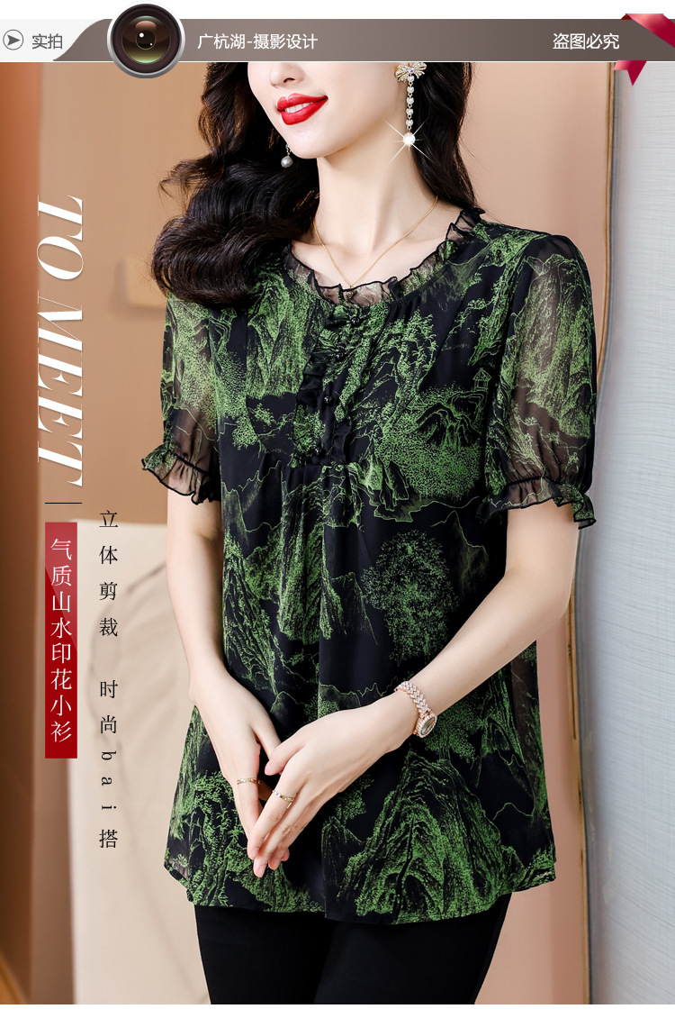 실제 촬영 2024 여름 새로운 슬리밍 꽃 쉬폰 셔츠 반팔 티셔츠 플러스 사이즈 여성스토어 가기
