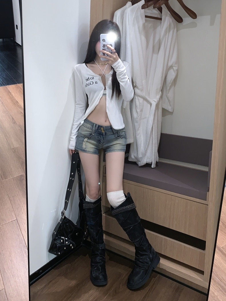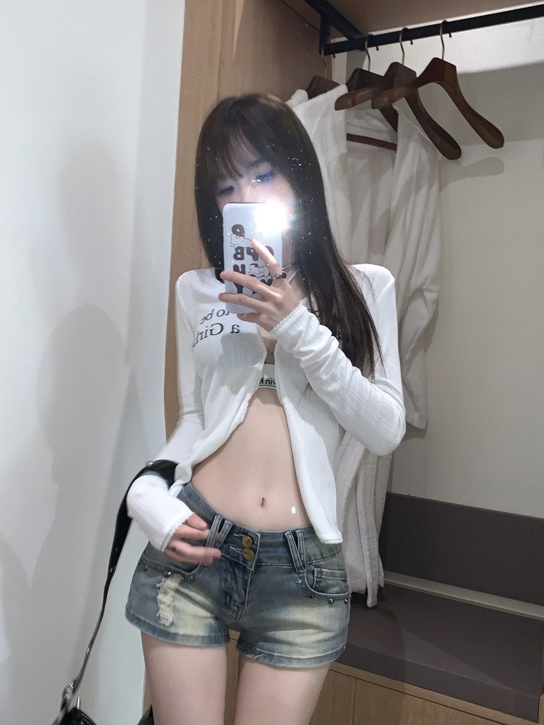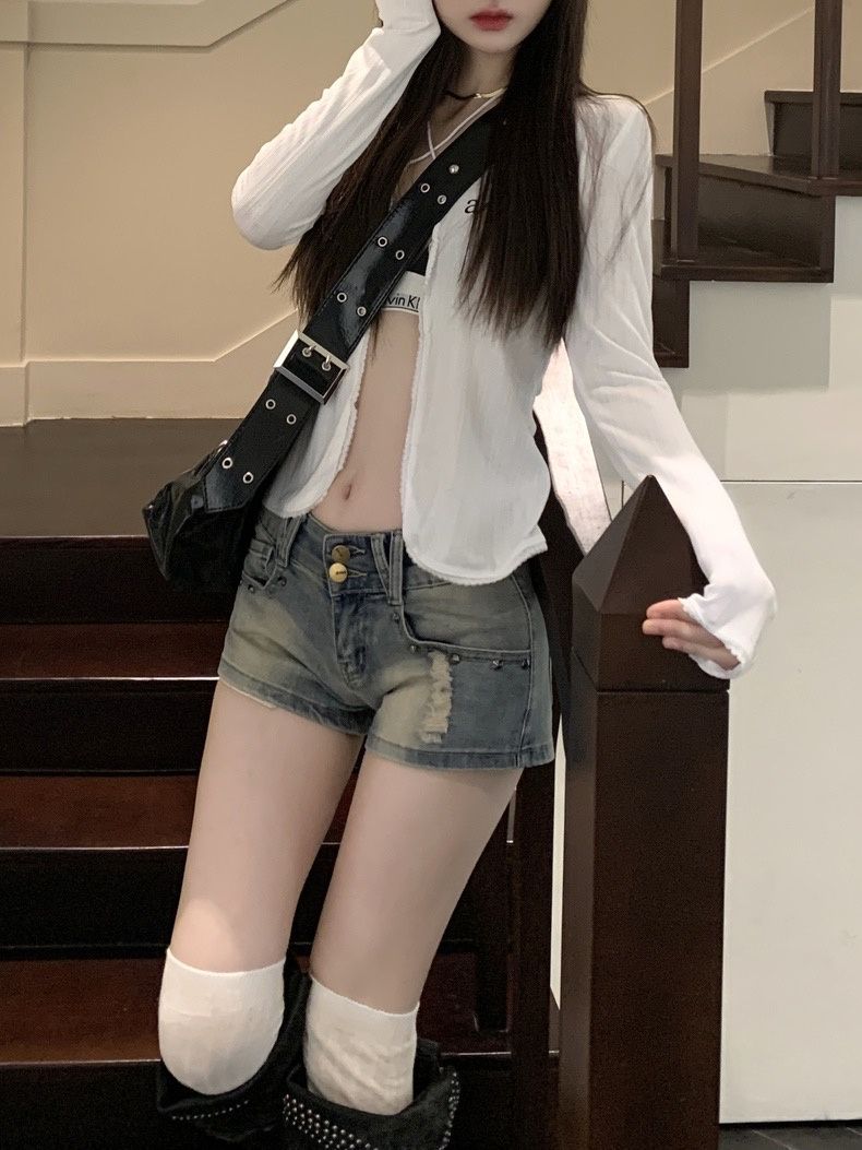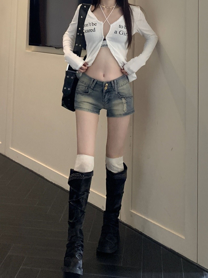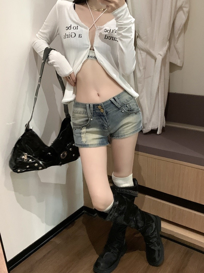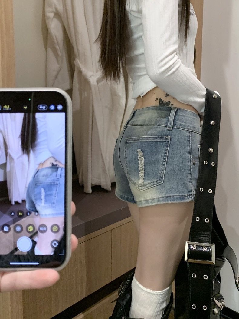데님 반바지 여성의 2024 새로운 여름 리벳은 넓은 다리 바지를 찢었습니다.스토어 가기