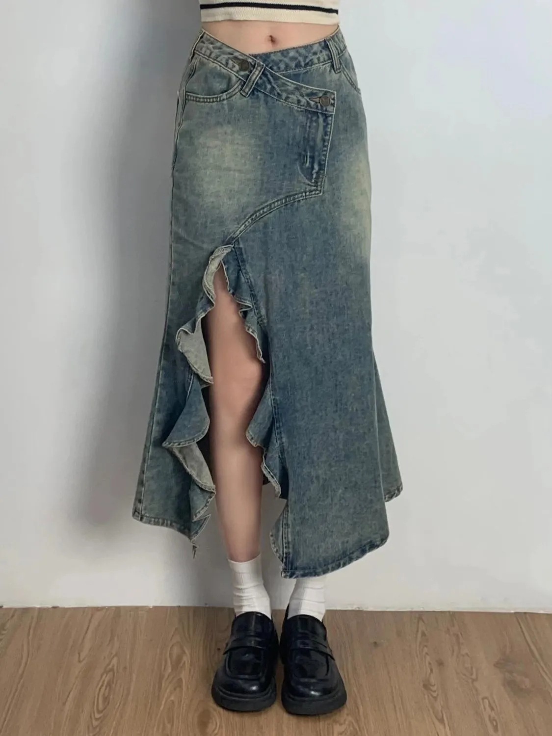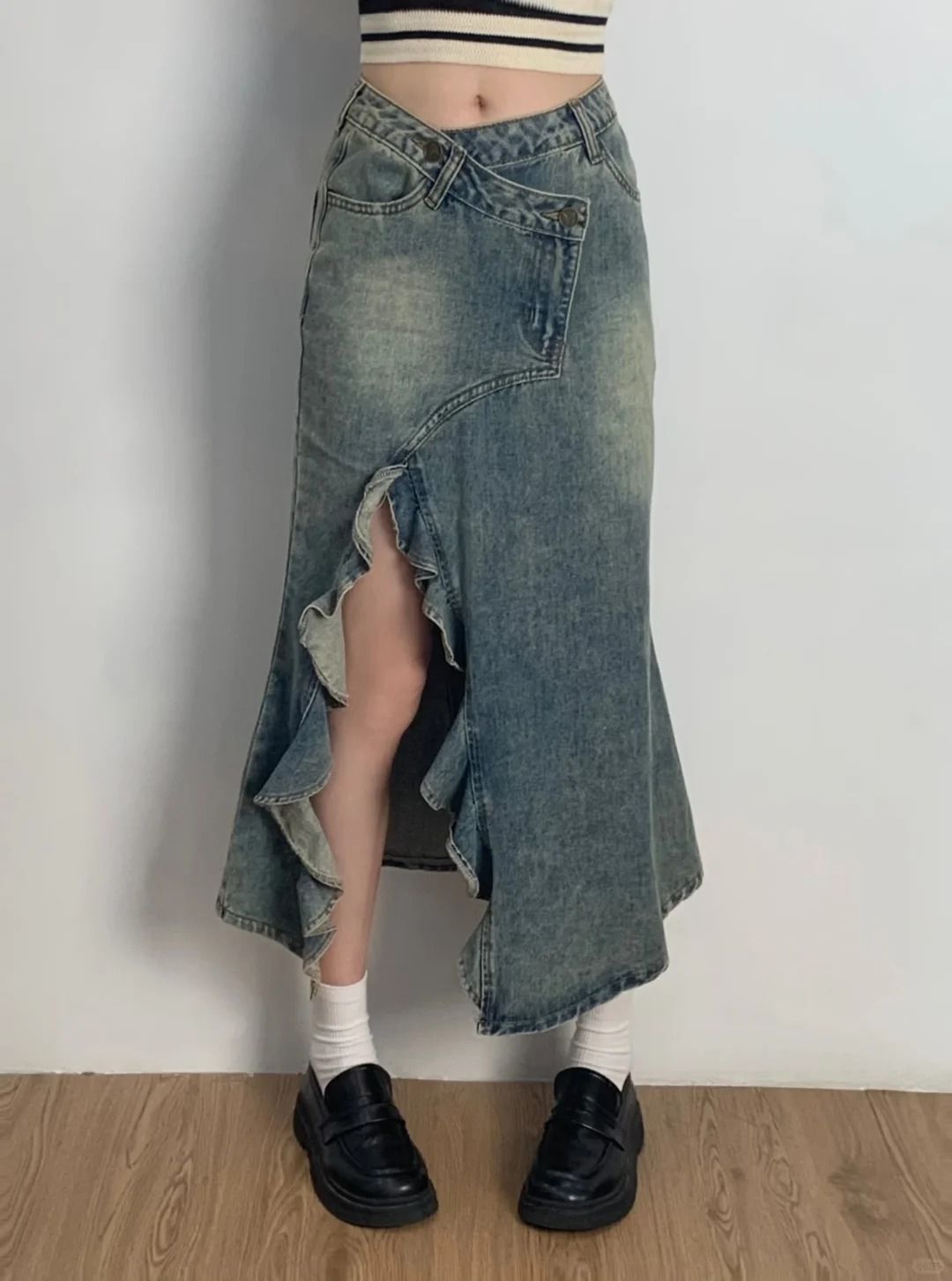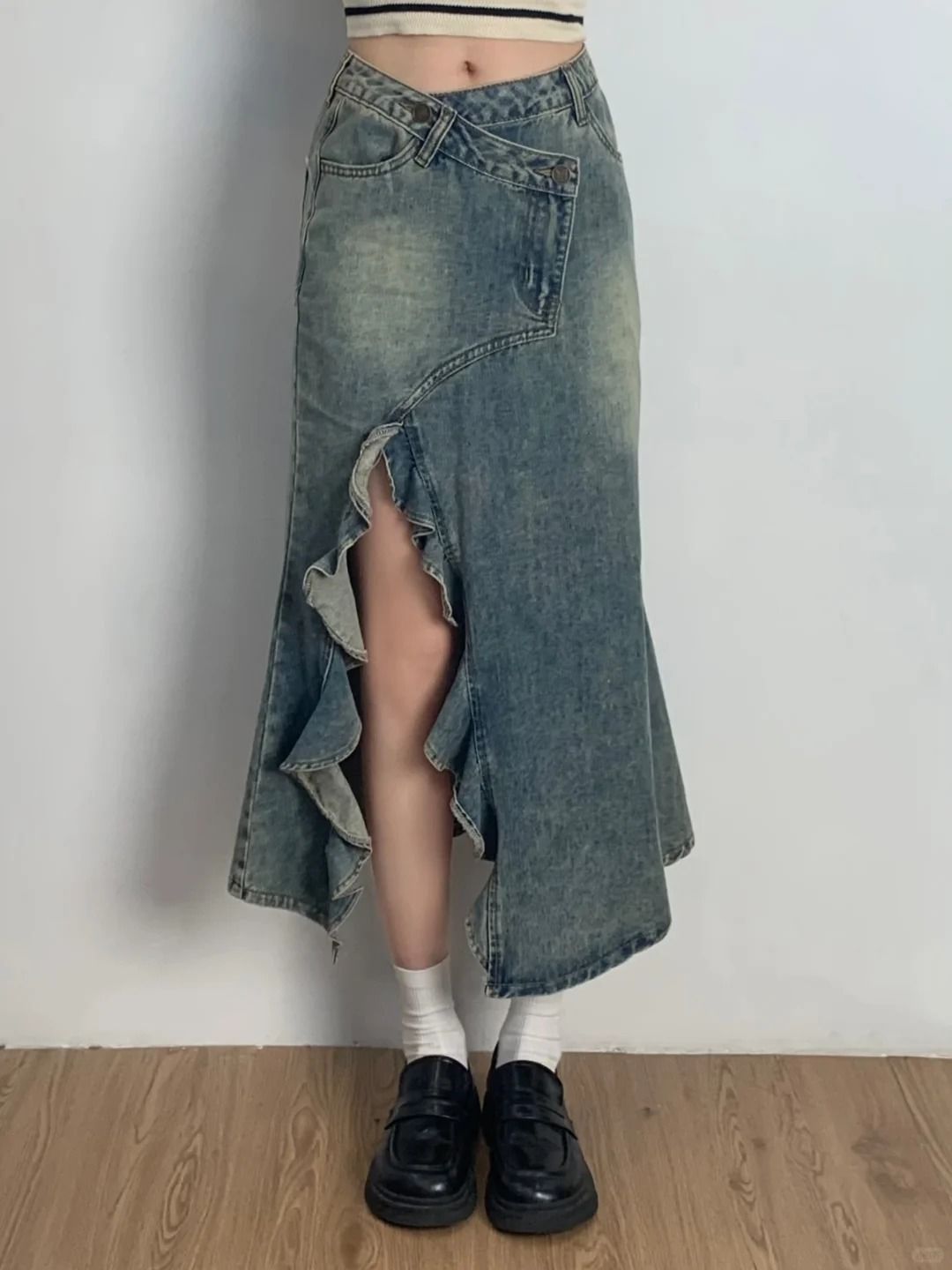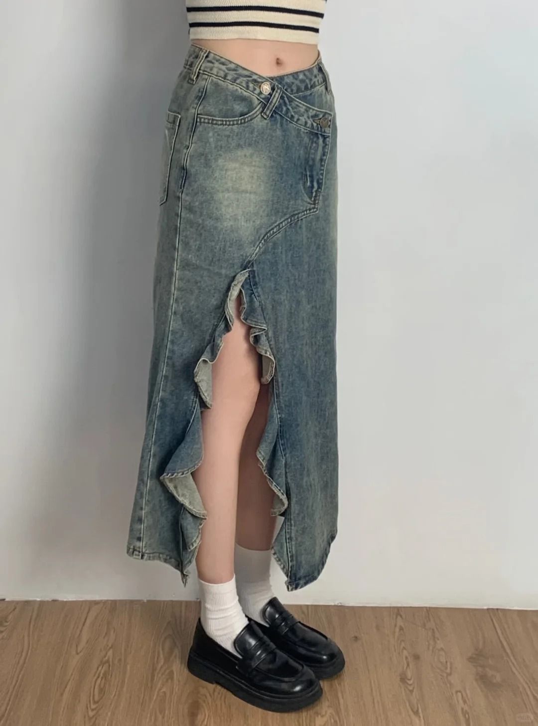 빈티지 올드 데님 스커트 여성 2024 년 여름 새로운 높은 허리 슬리밍 중간 길이 분할 된 엉덩이 물고기스토어 가기