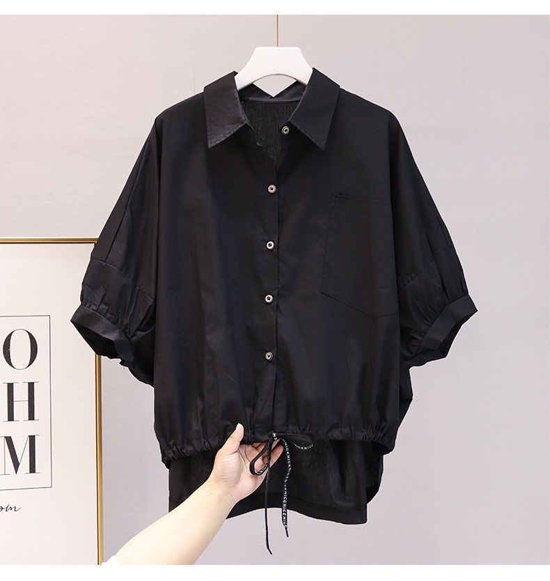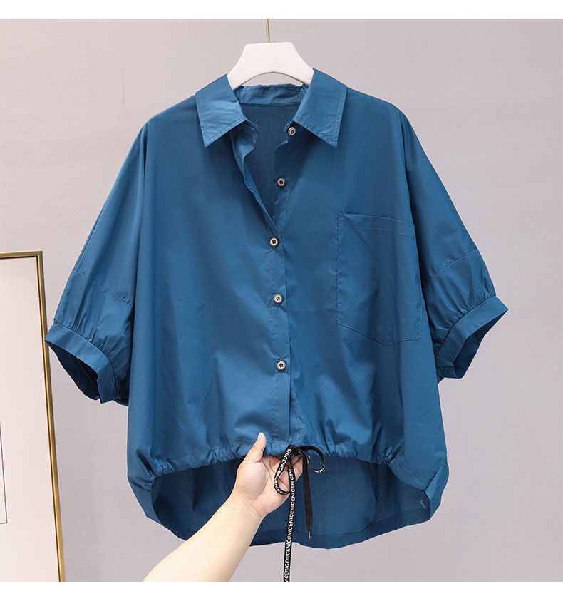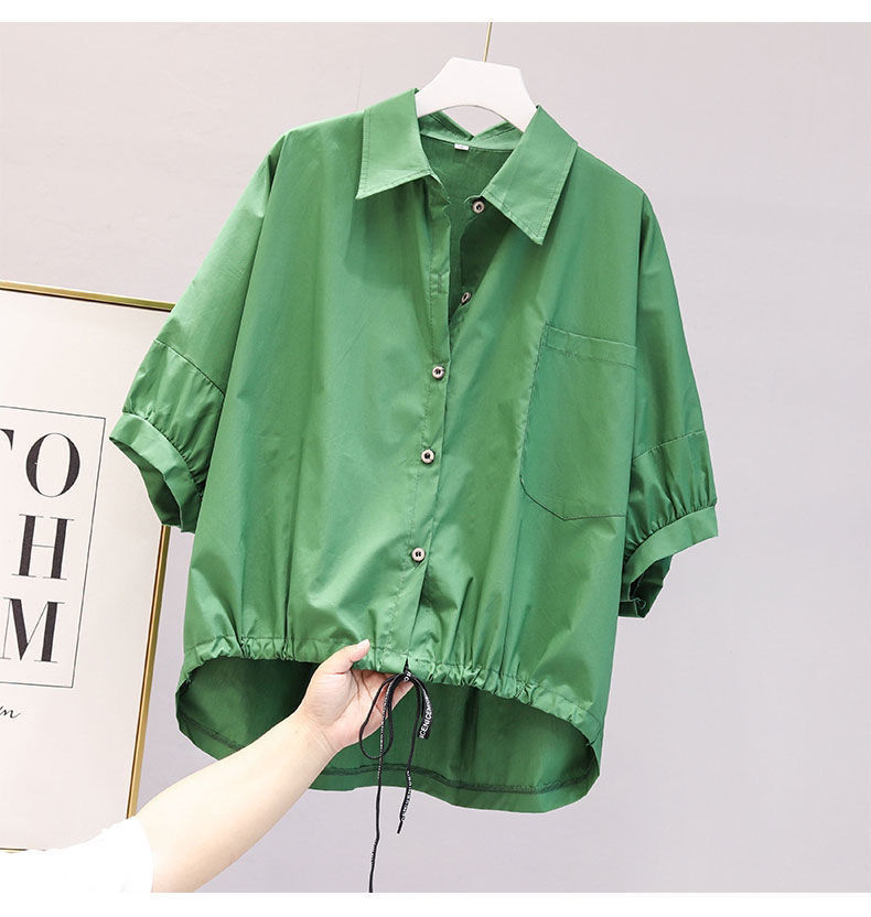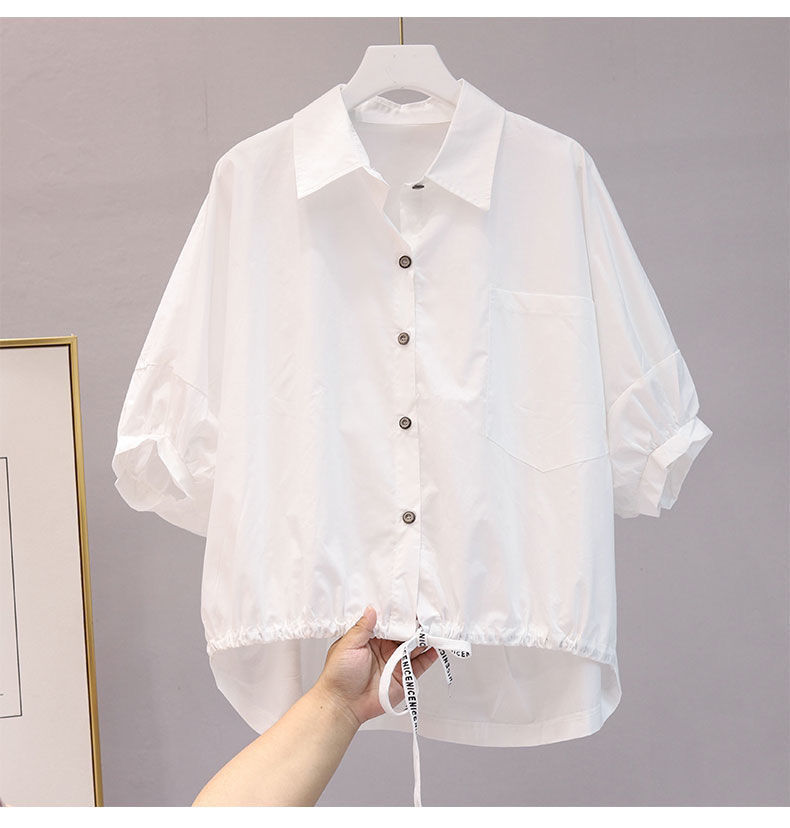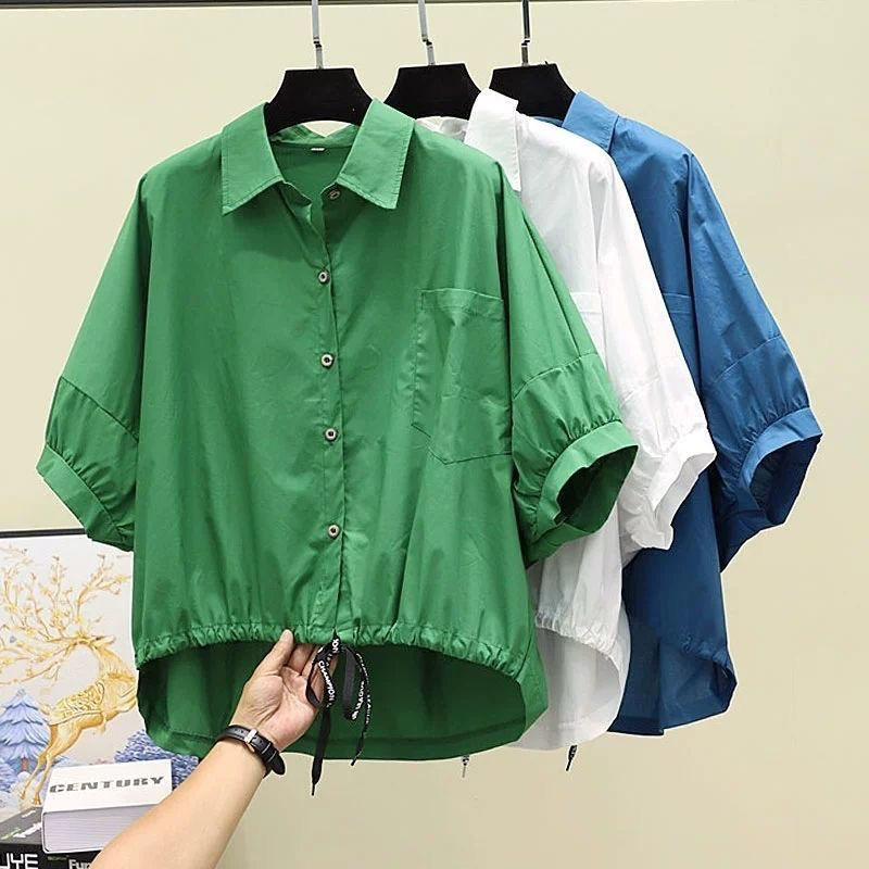셔츠 여자 2024 년 여름 새로운 한국식 느슨한 캐주얼 시대 감소 드로우 스트링 패션 올매치 반팔 불규칙한 탑