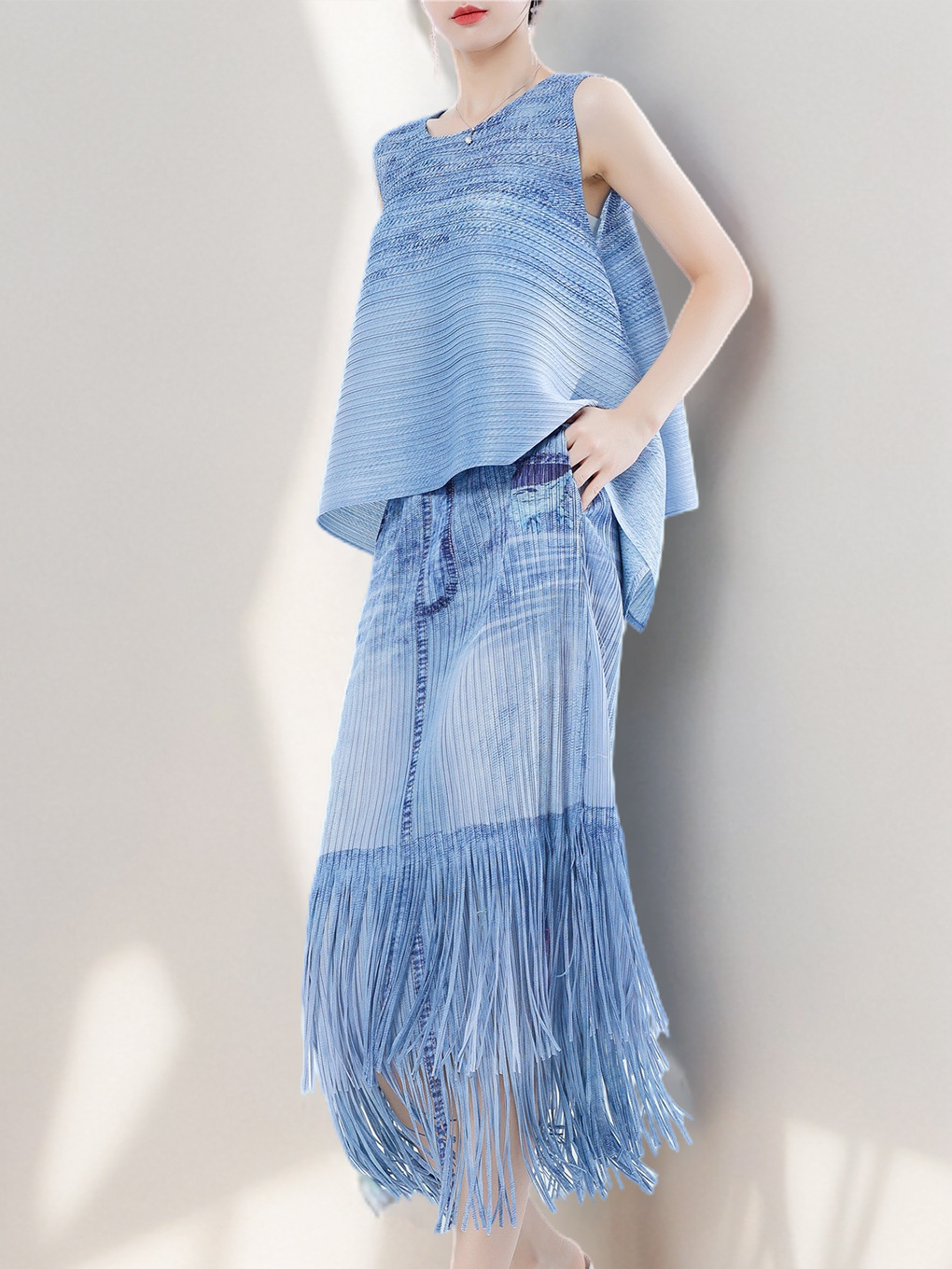 데님 정장 여름 투피스 세트 여성 패션 새로운 불규칙한 느슨한 티셔츠 탑 술 엉덩이 덮는 스커트 유행