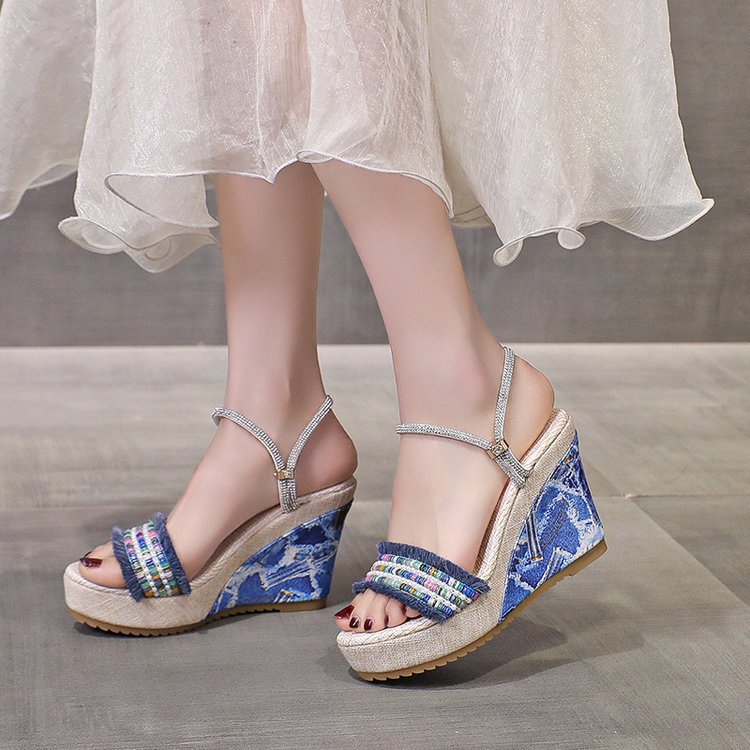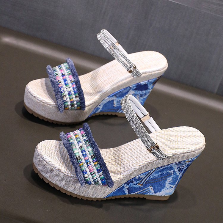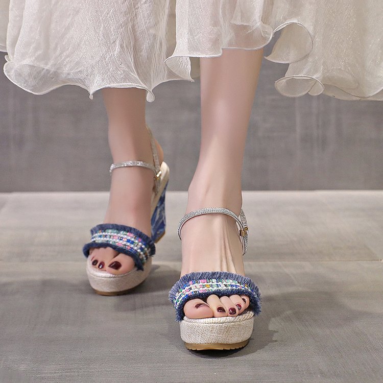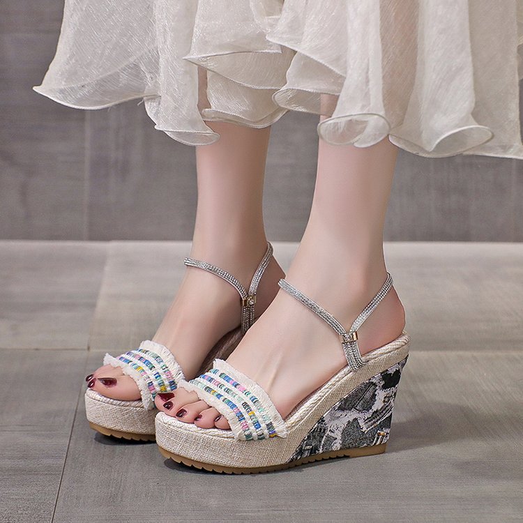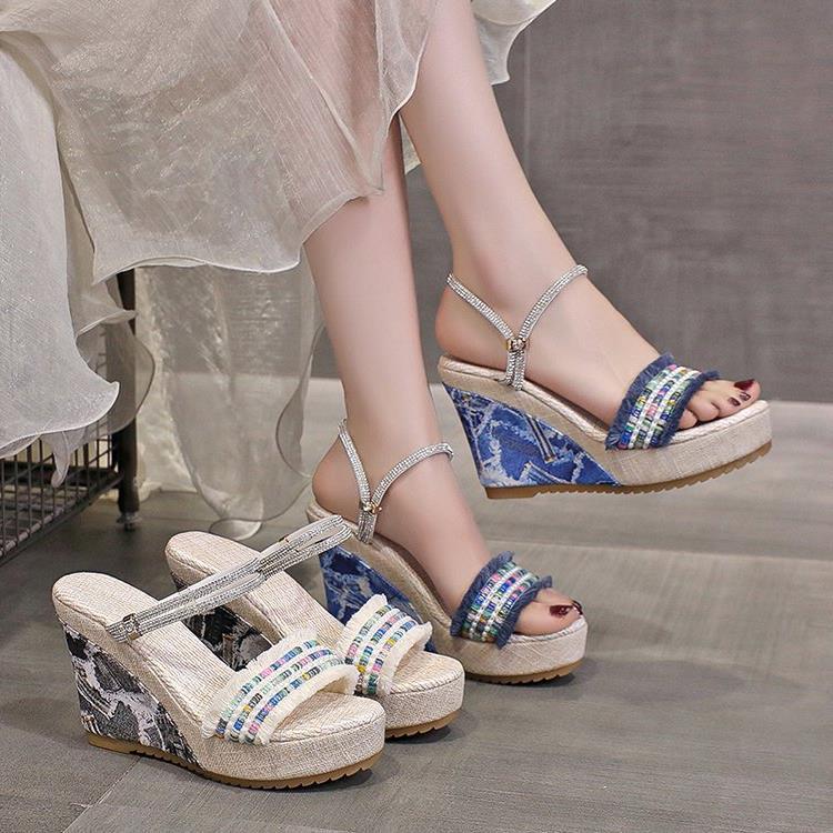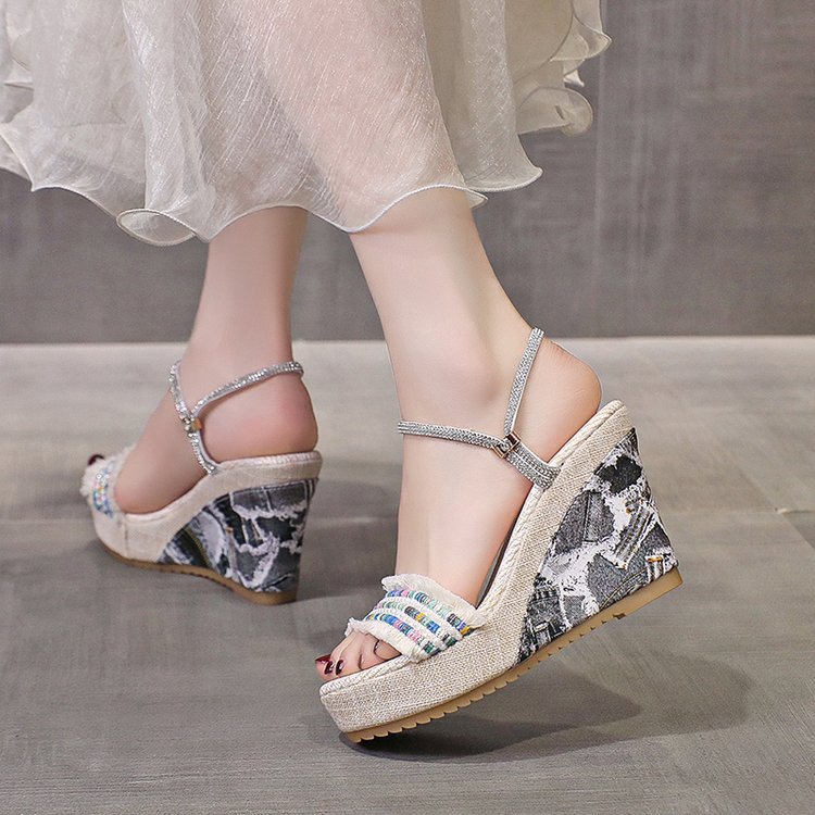 요정 스타일 웨지 샌들 2024 새로운 여름 패션 두꺼운 단독 하이힐 라인스톤 펄 플러스 사이즈스토어 가기