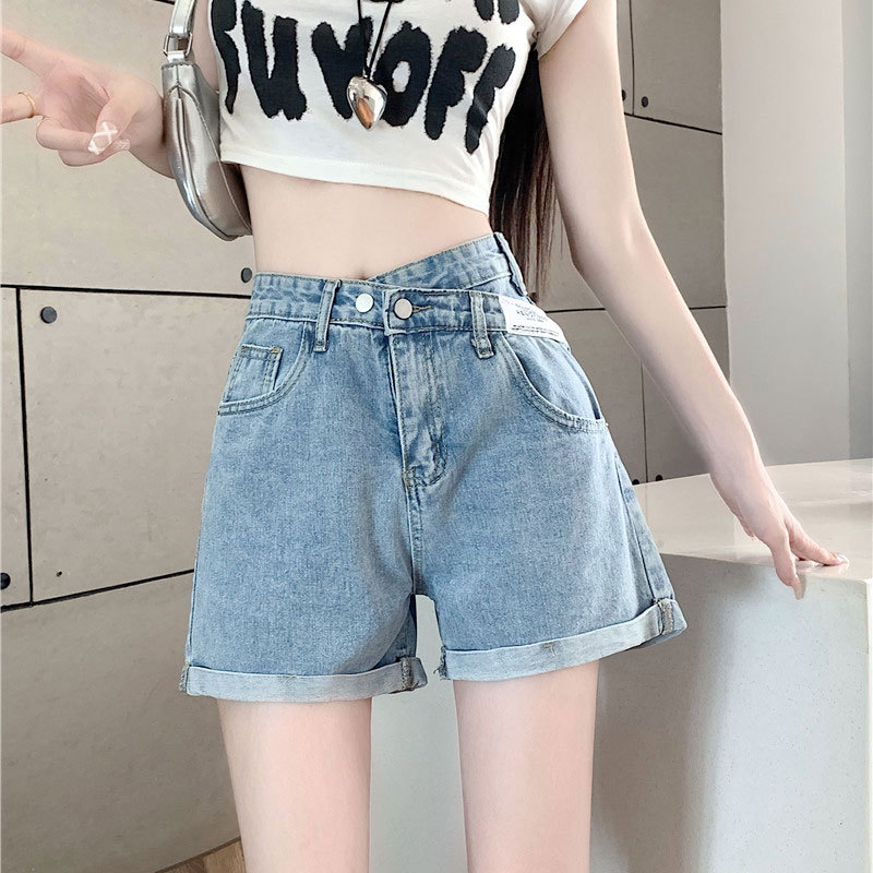 여름 Ins 스타일 Slant 버튼 반바지 여성의 얇은 불규칙한 크로스 높은 허리 넓은 다리 스트레이트 A-라인 컬링 데님 핫 바지