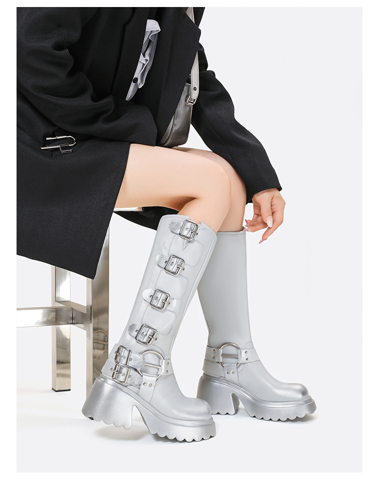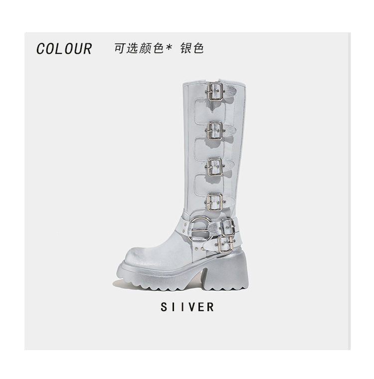 웨스턴 데님 라이더 부츠 여름 2024 새로운 슈퍼 하이힐 실버 부츠 두꺼운 하단 레트로 오토바이 부츠 여성용 부츠