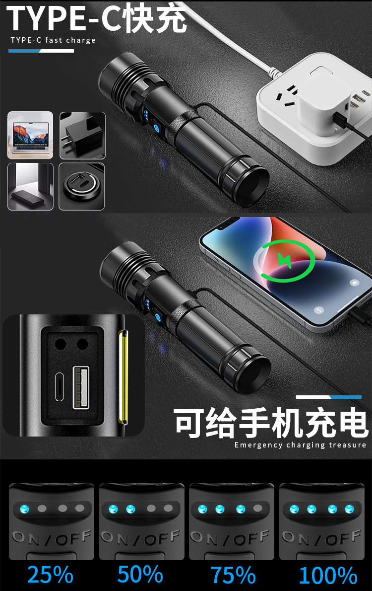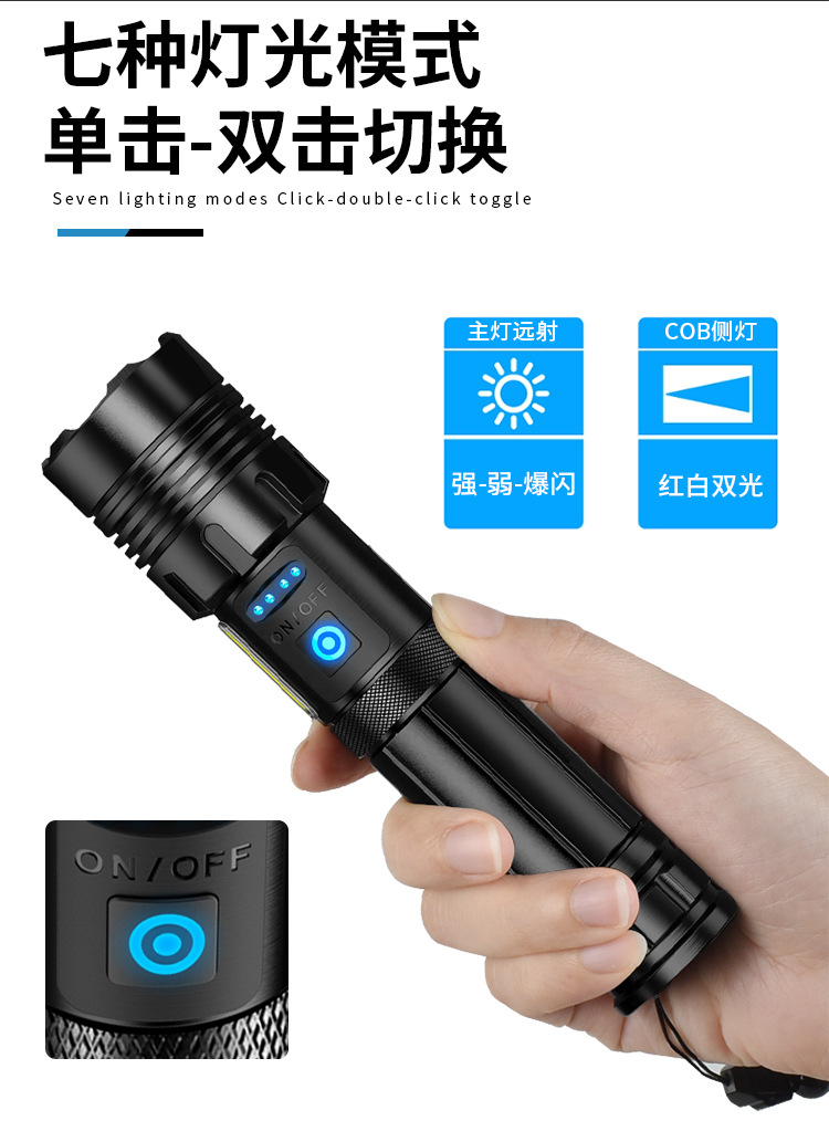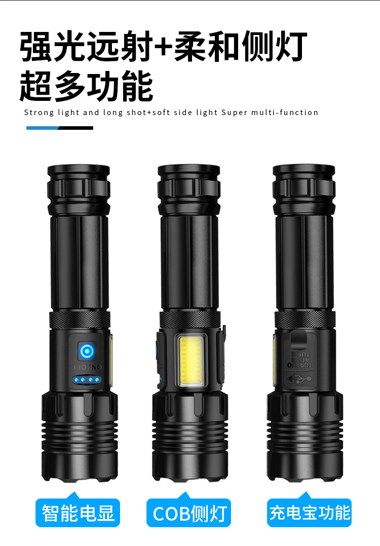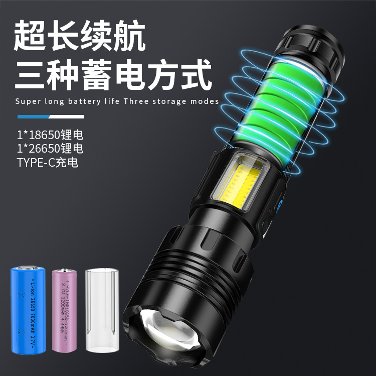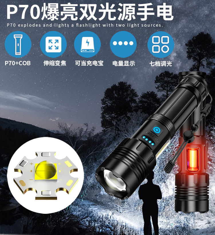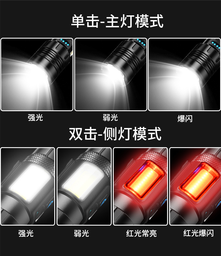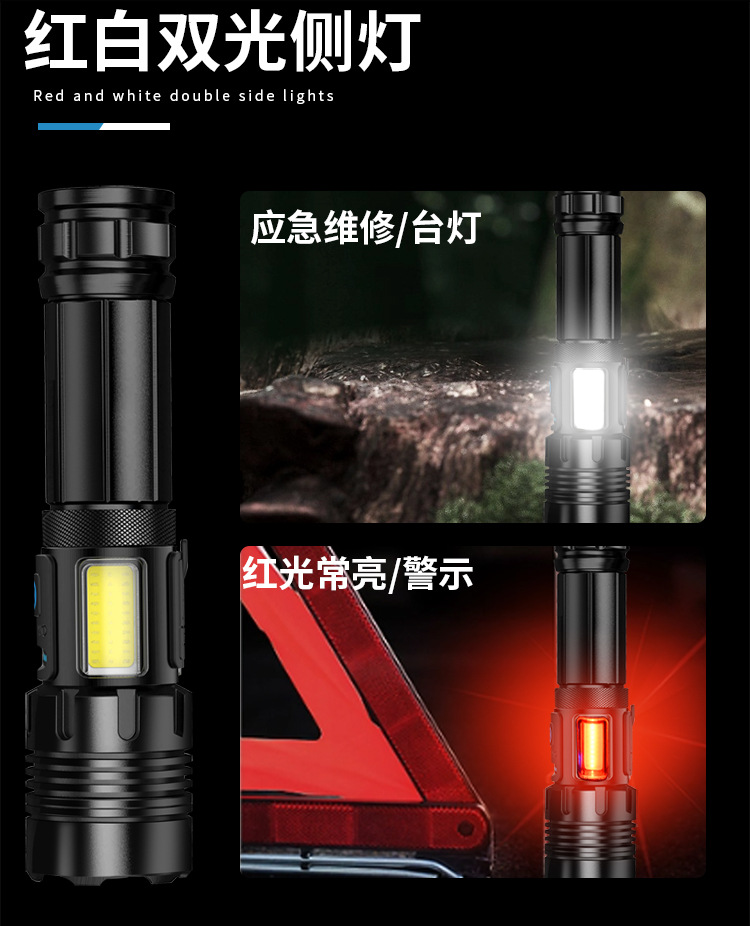 P70 빨간색과 흰색 COB 다기능 유형-C 충전 스트레치 줌 사이드 라이트 LED 손전등 강한 빛 슈퍼 밝은 야외