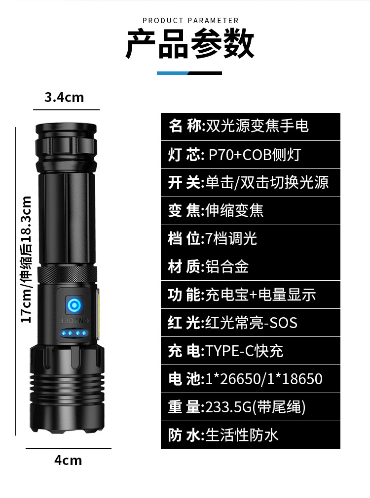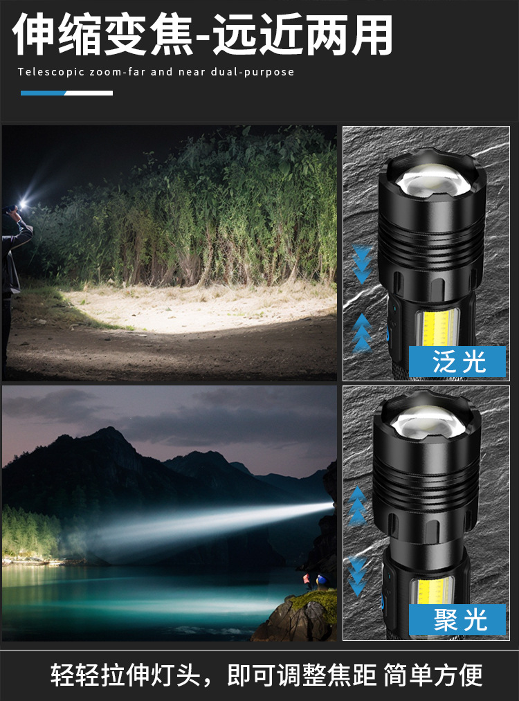 P70 빨간색과 흰색 COB 다기능 유형-C 충전 스트레치 줌 사이드 라이트 LED 손전등 강한 빛 슈퍼 밝은 야외스토어 가기