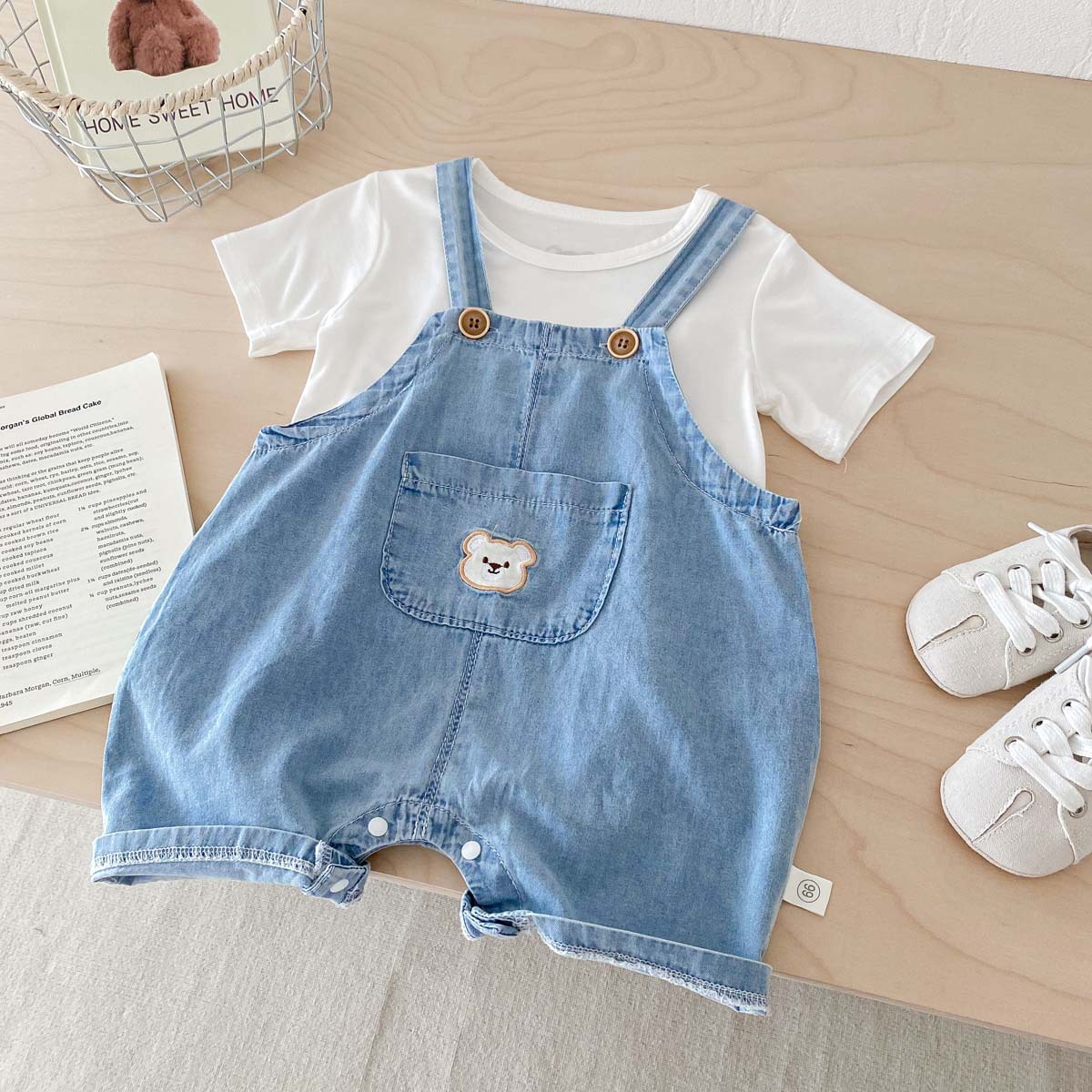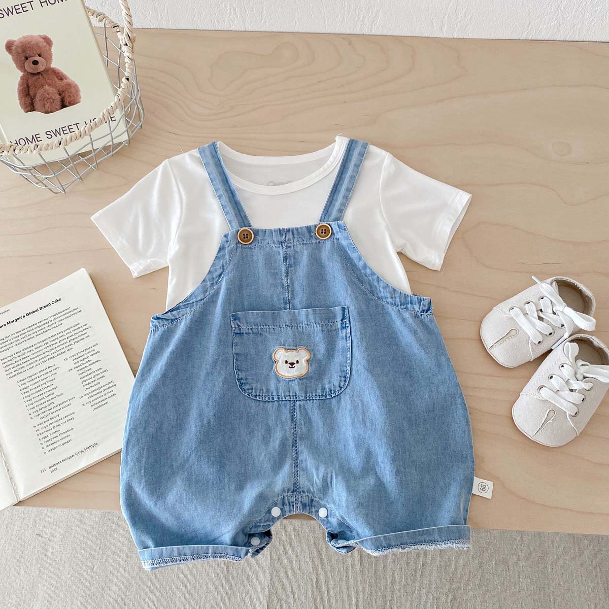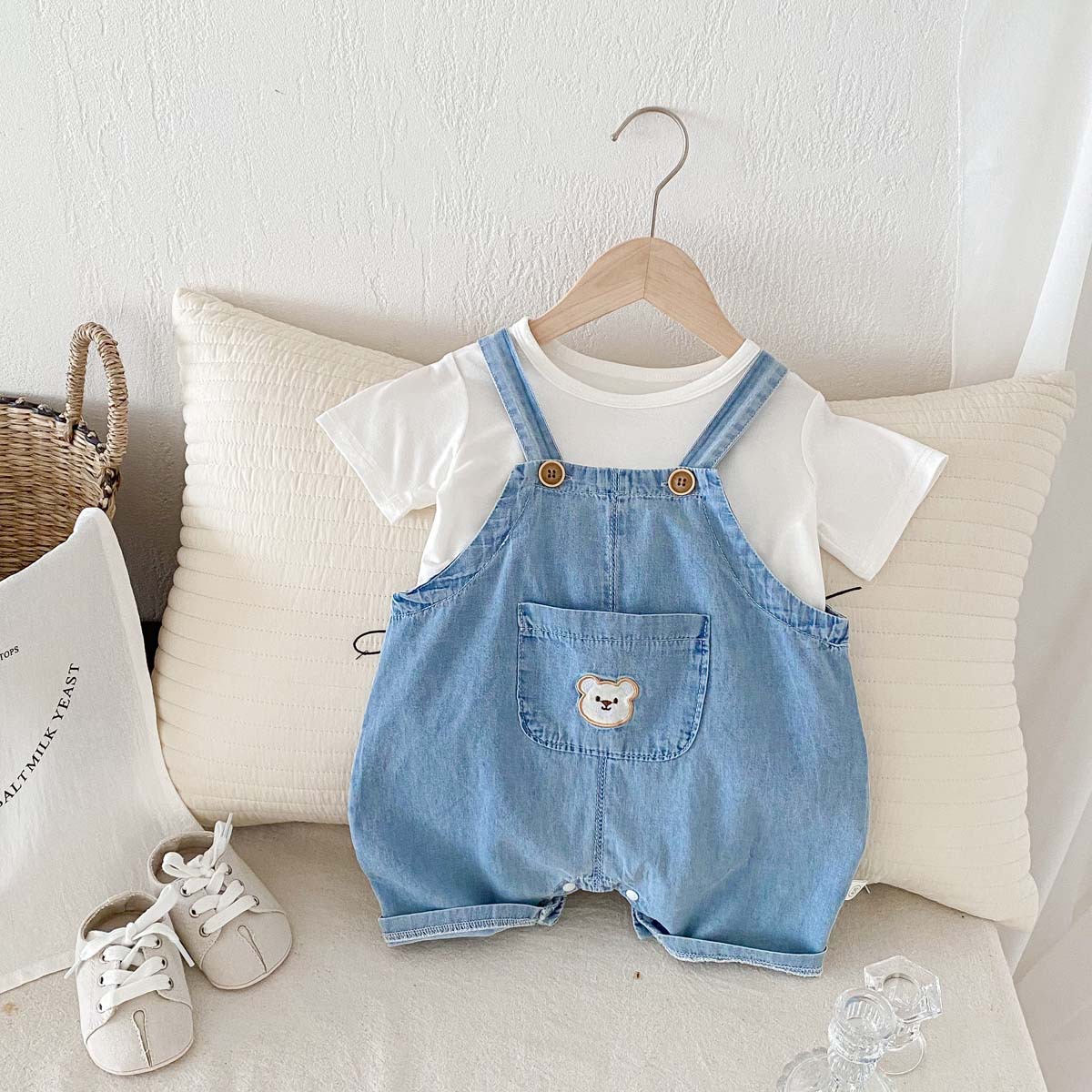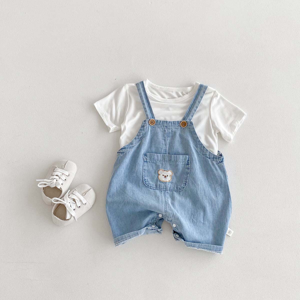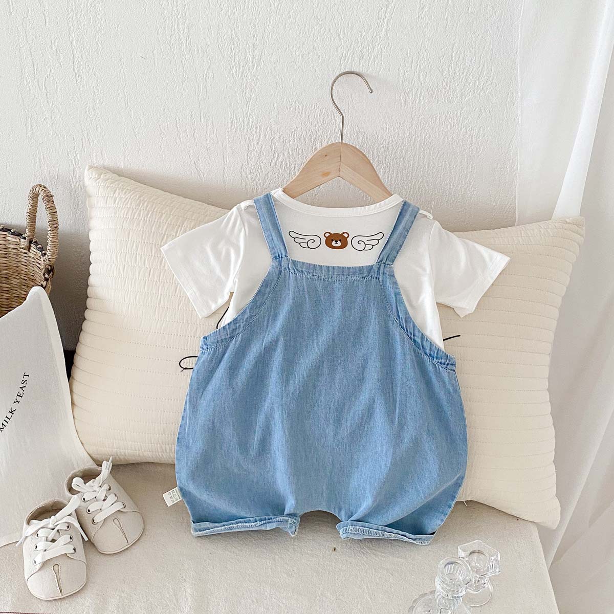 2025 새로운 아기 여름 정장 아기 옷 여름 얇은 티셔츠 데님 작업복 점프 슈트 2 개스토어 가기