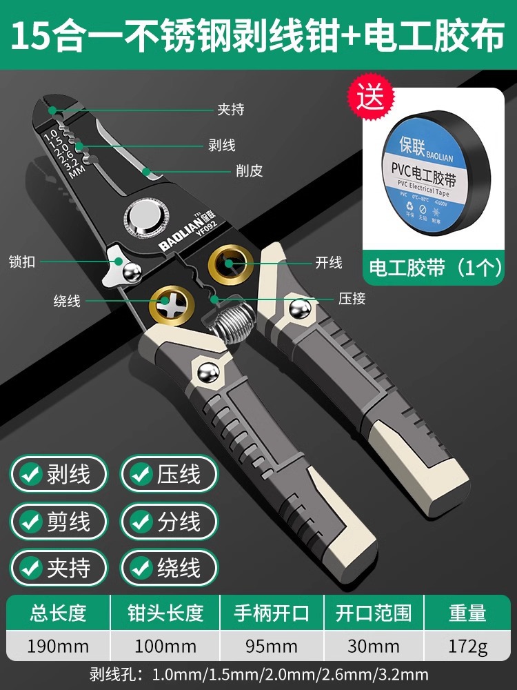 • [다기능] 16-in-1 스테인레스 스틸 와이어 스트리퍼 + 전기 테이프 (1개)