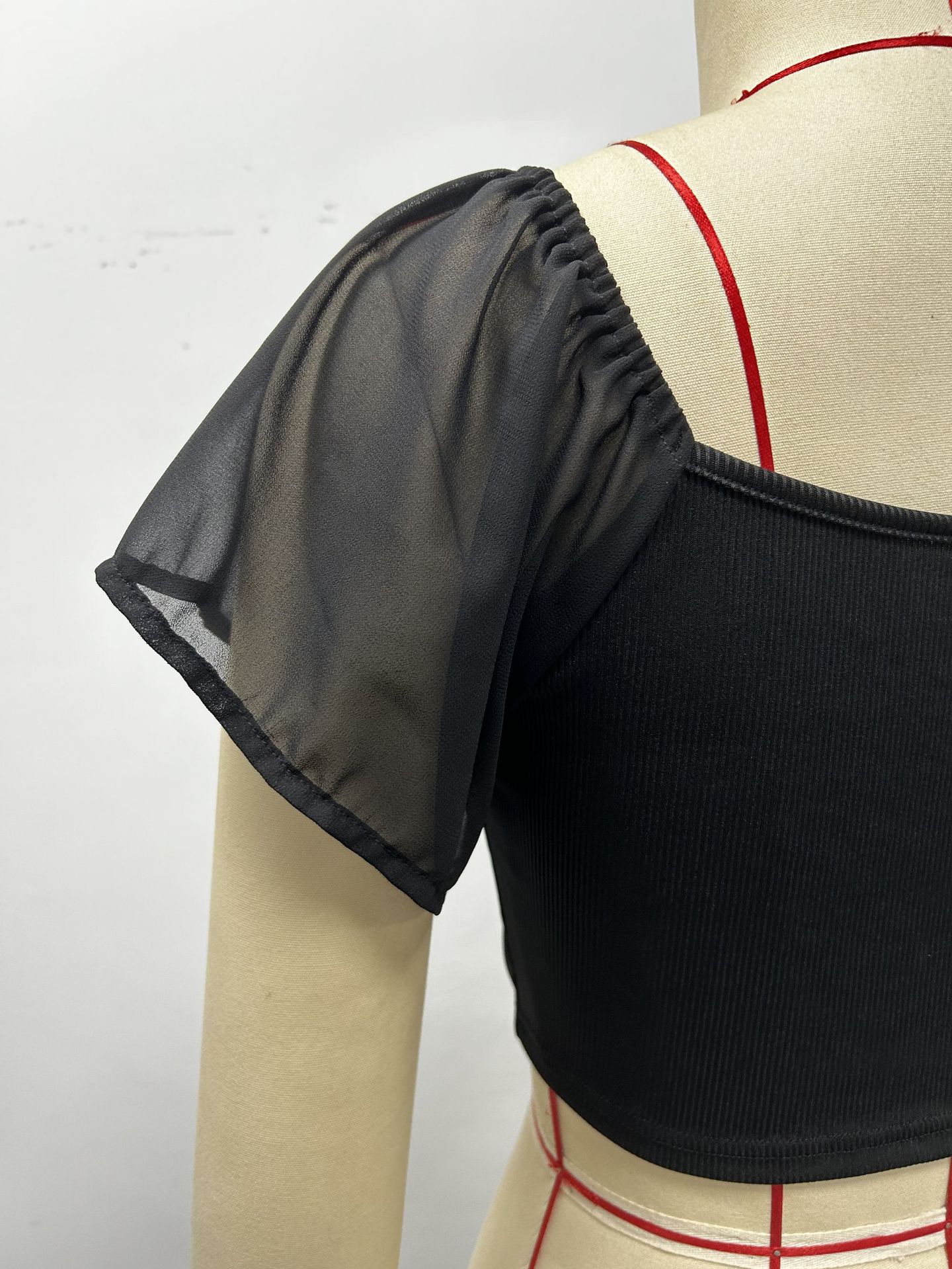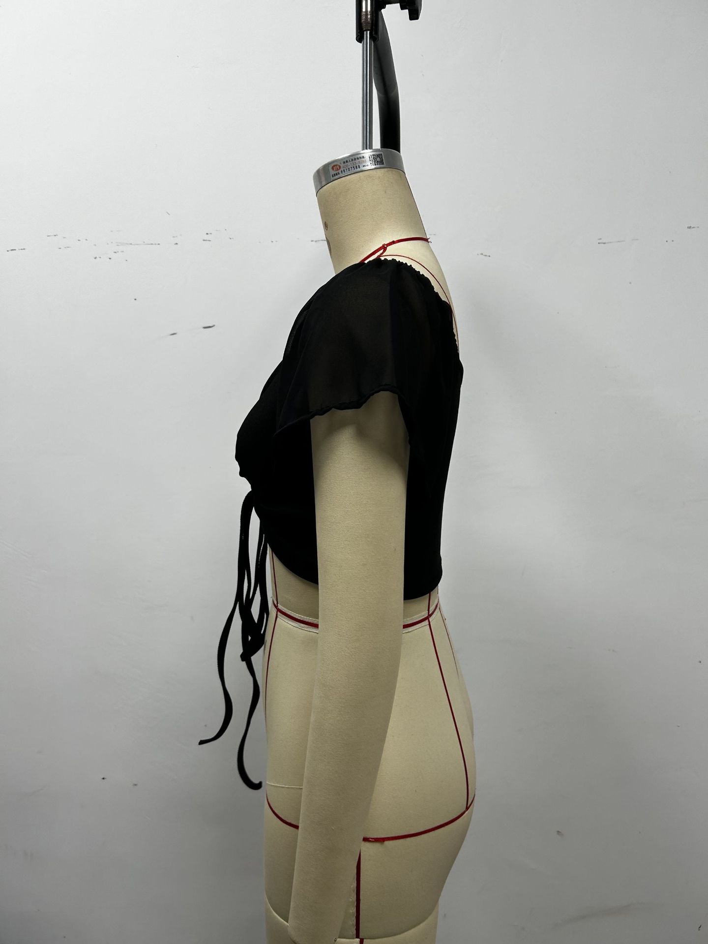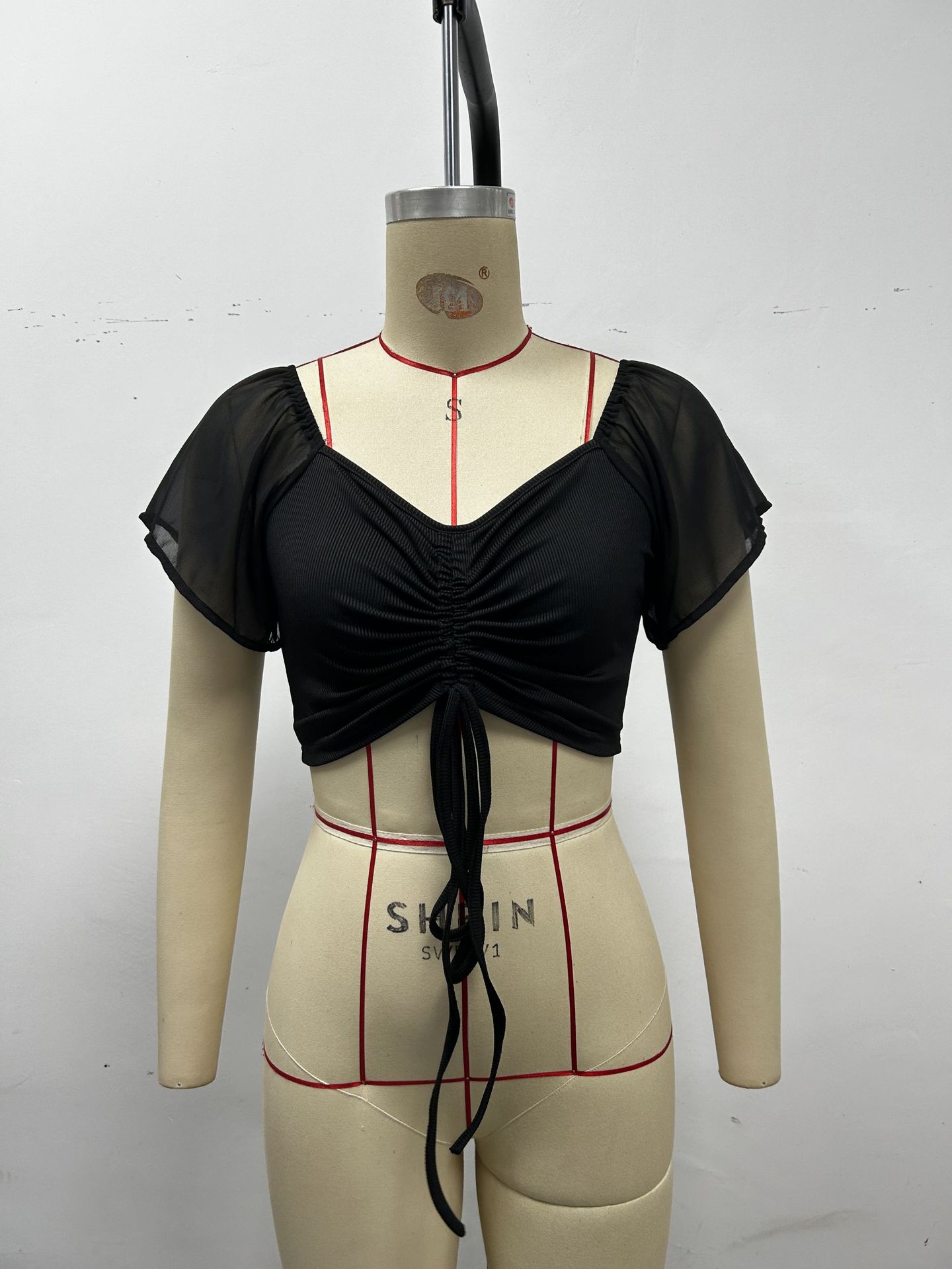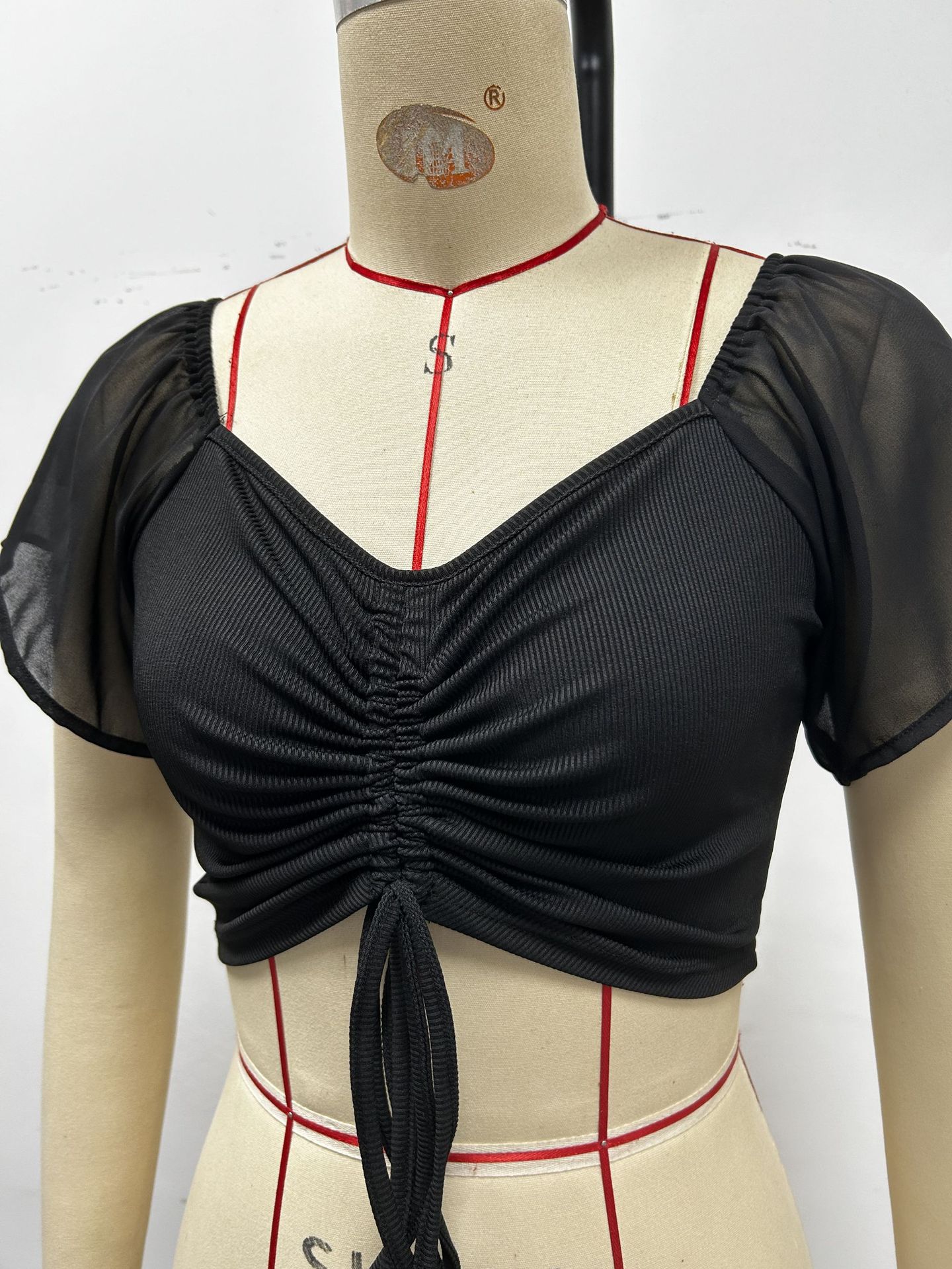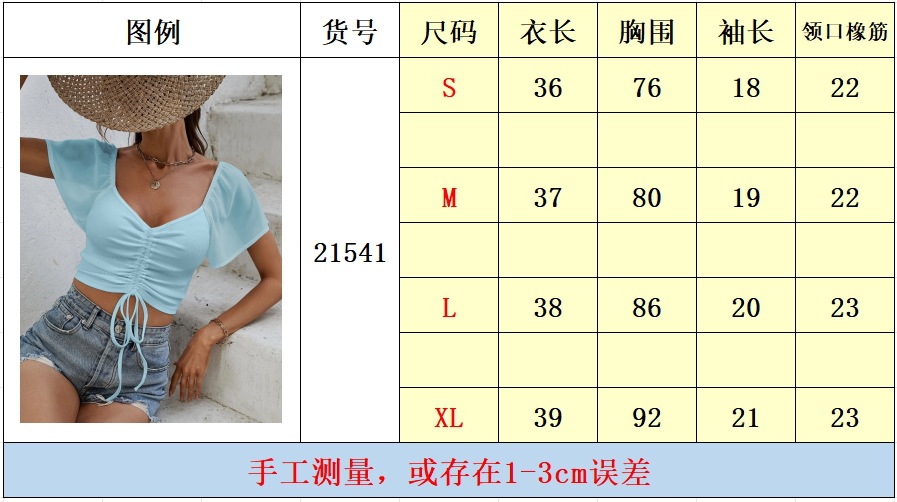 여름 새로운 AliExpress 국경 기질 반팔 쉬폰 탑 로우 컷 섹시 드로우 스트링 스트랩 슬림베이스 셔츠
