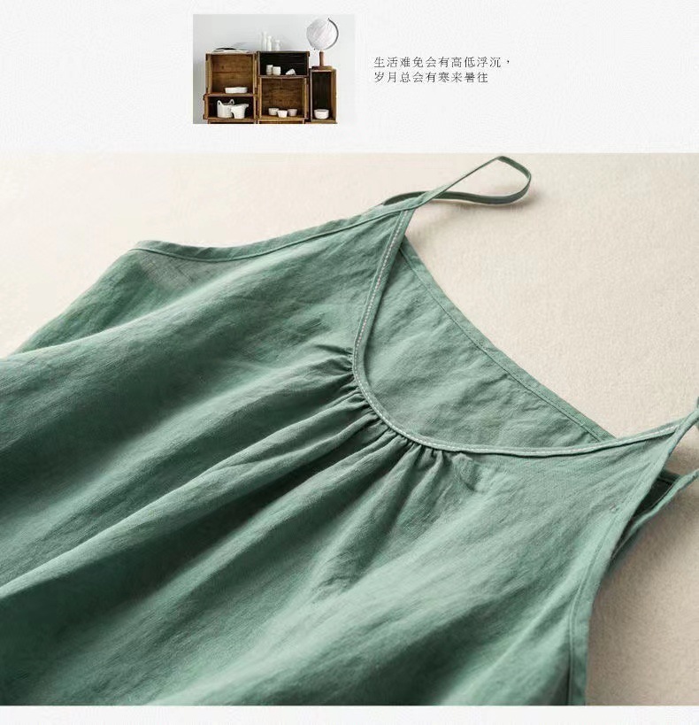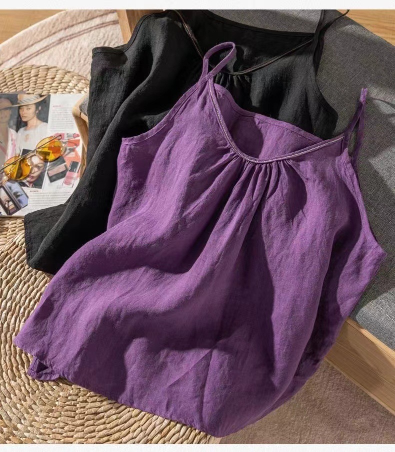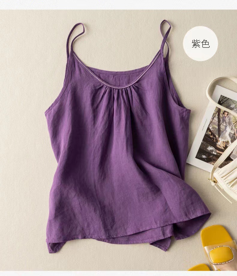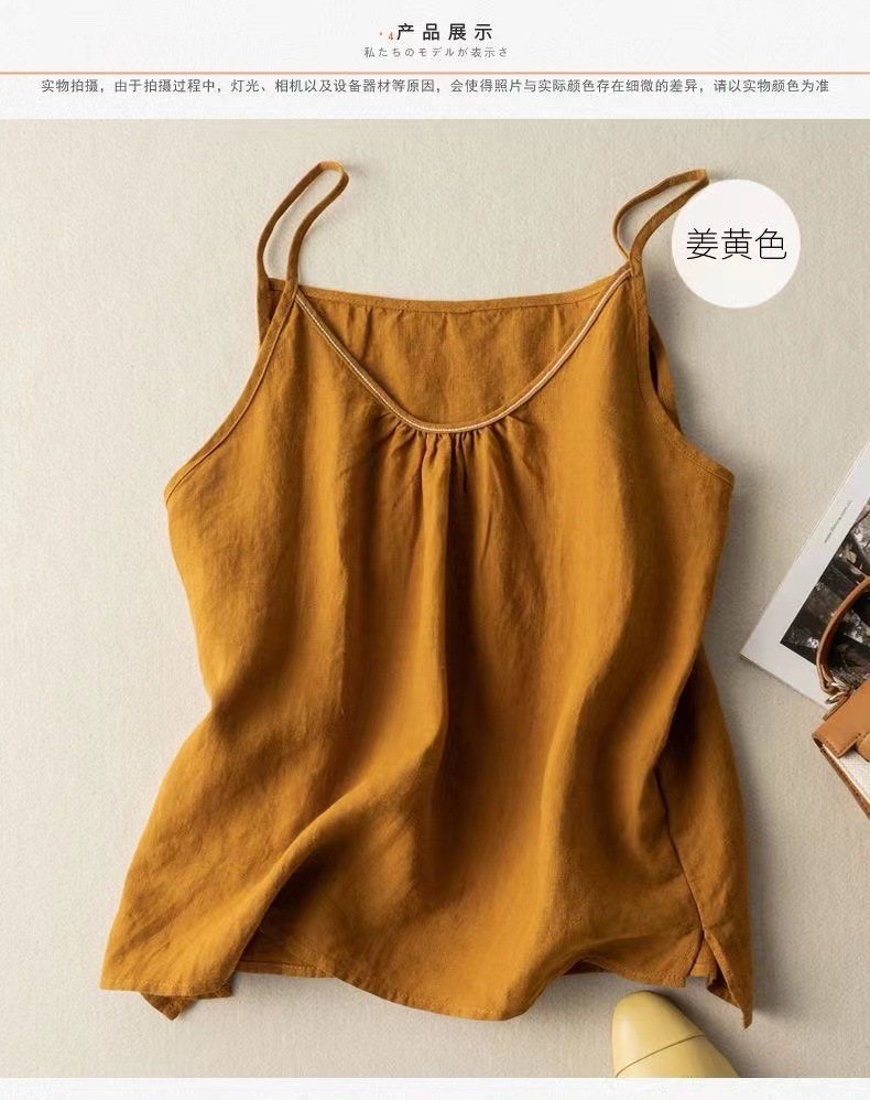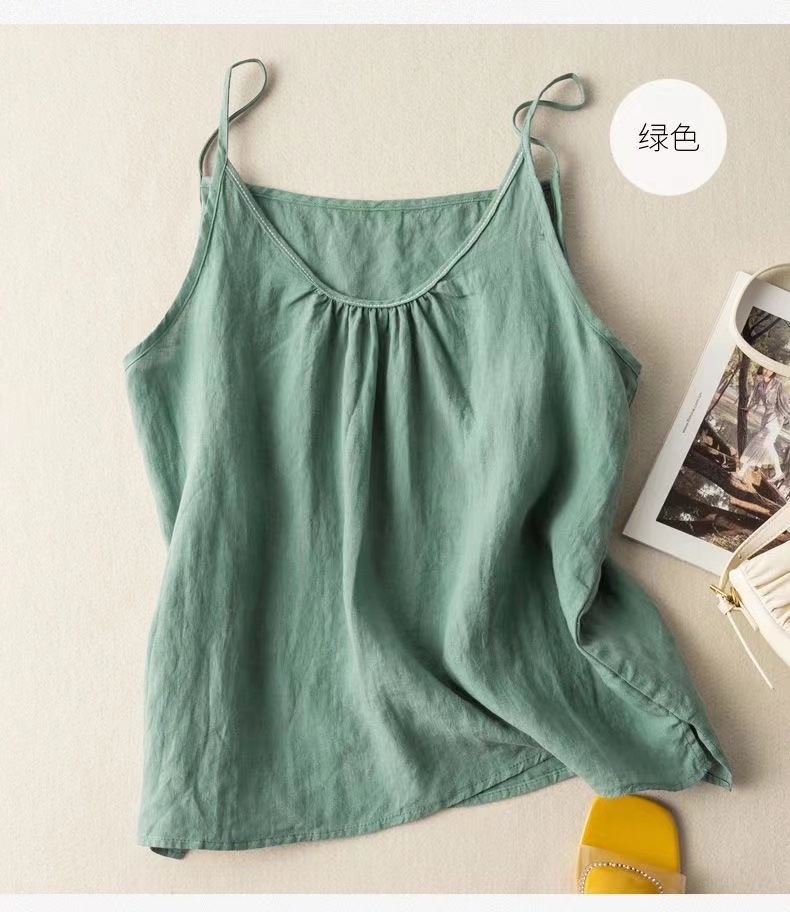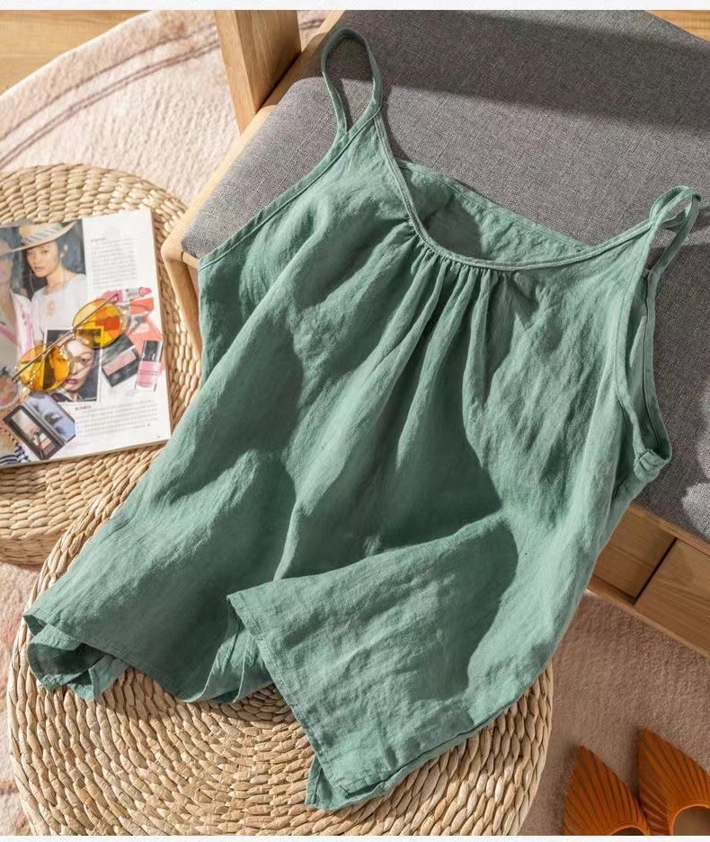 새로운 여름 코튼 카미 솔 여성용 코튼 및 리넨 솔리드 컬러 베이스 외부 착용 예술적 레트로 얇은 루즈 탑