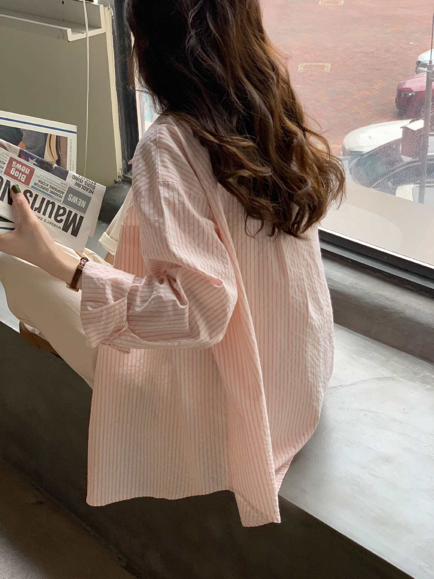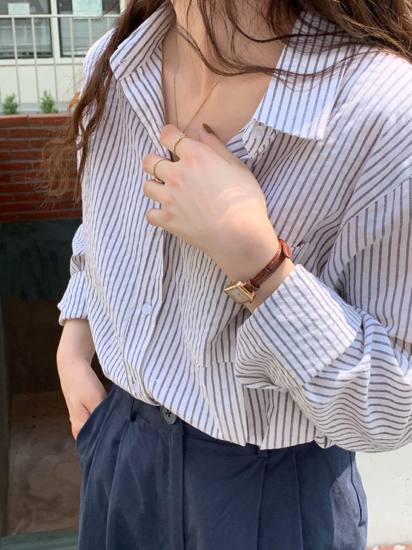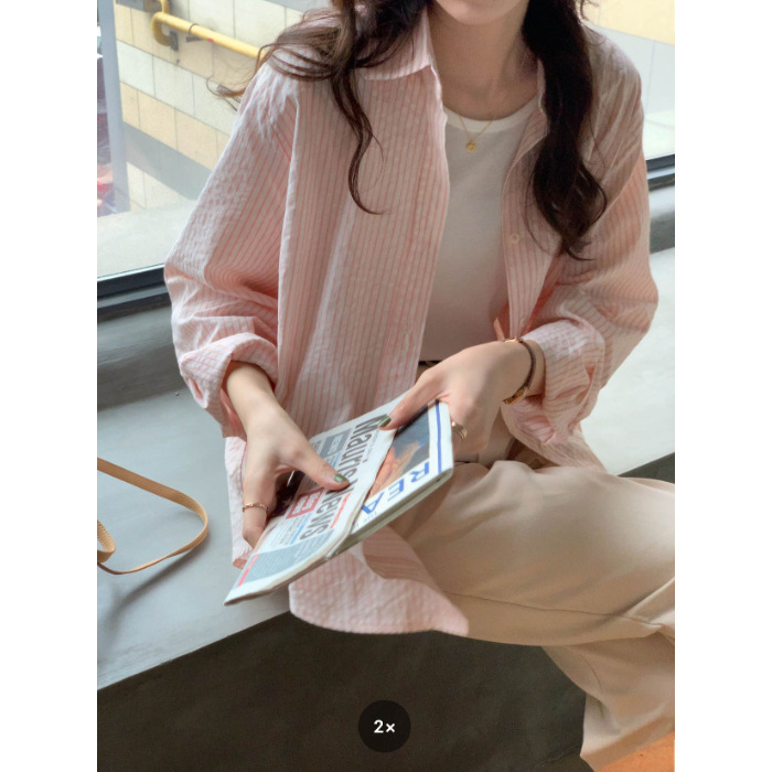 줄무늬 셔츠 여성의 2024 여름 새로운 스타일 탑 게으른 느슨한 홍콩 스타일 긴팔 셔츠 캐주얼 태양 보호 옷스토어 가기
