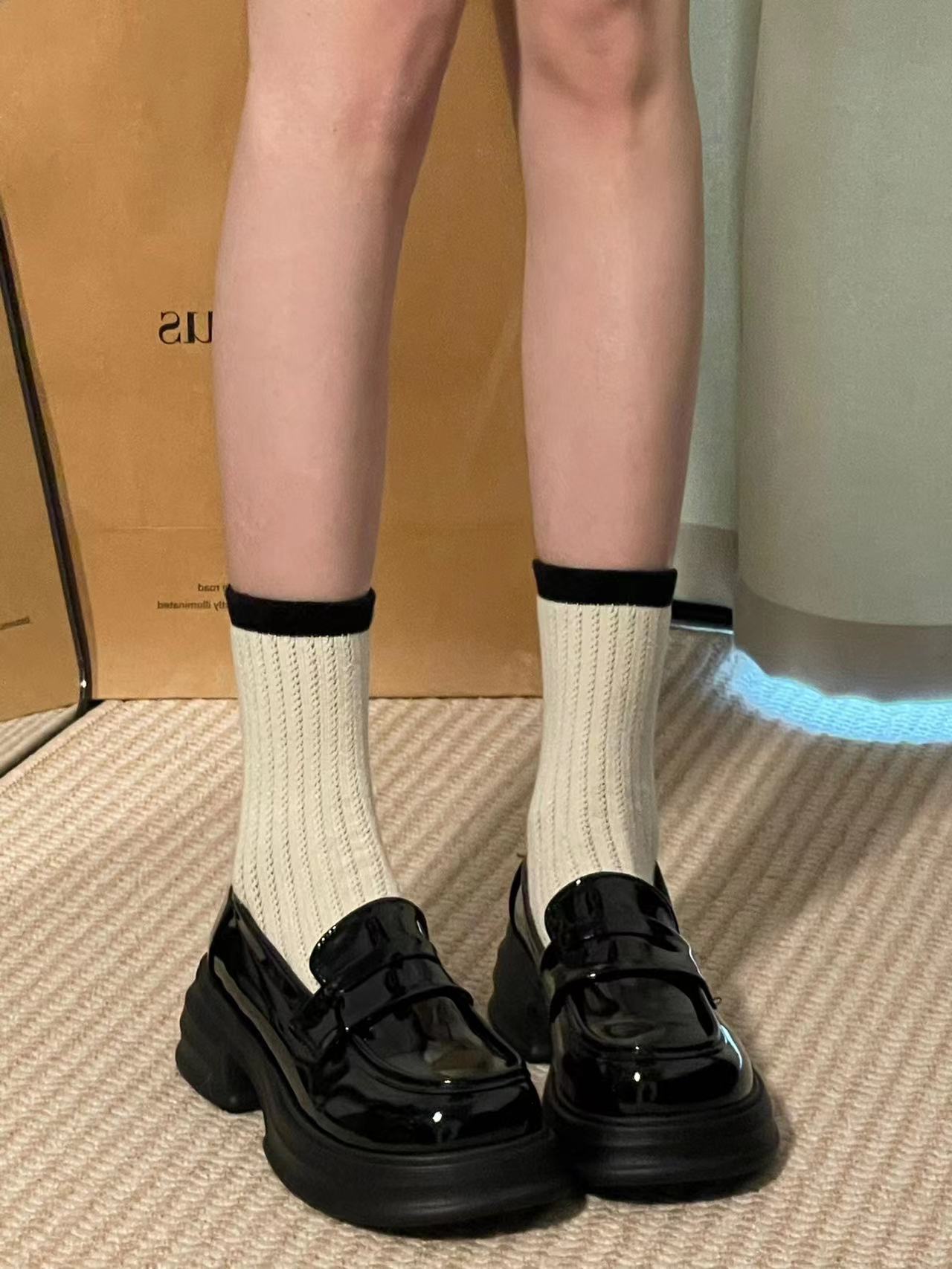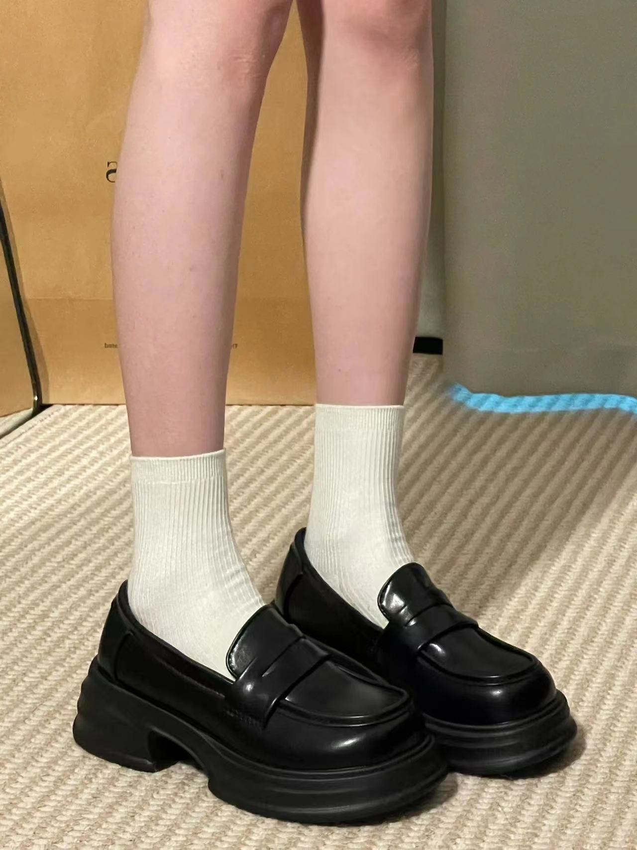 검은 두꺼운 밑창 로퍼 여성의 2024 새로운 레트로 영국 스타일의 높이 증가 JK 작은 가죽 신발 슬립 온 플랫폼 신발스토어 가기