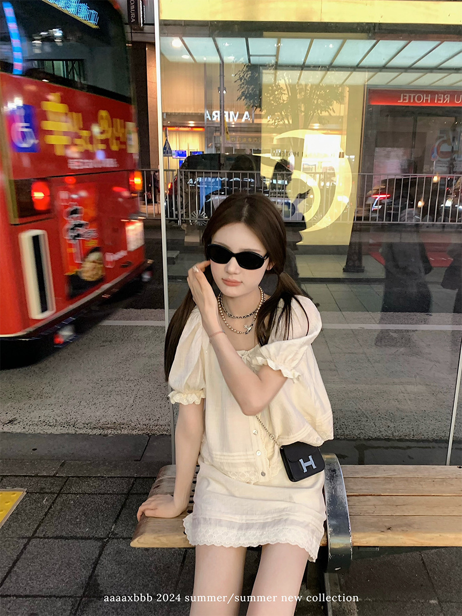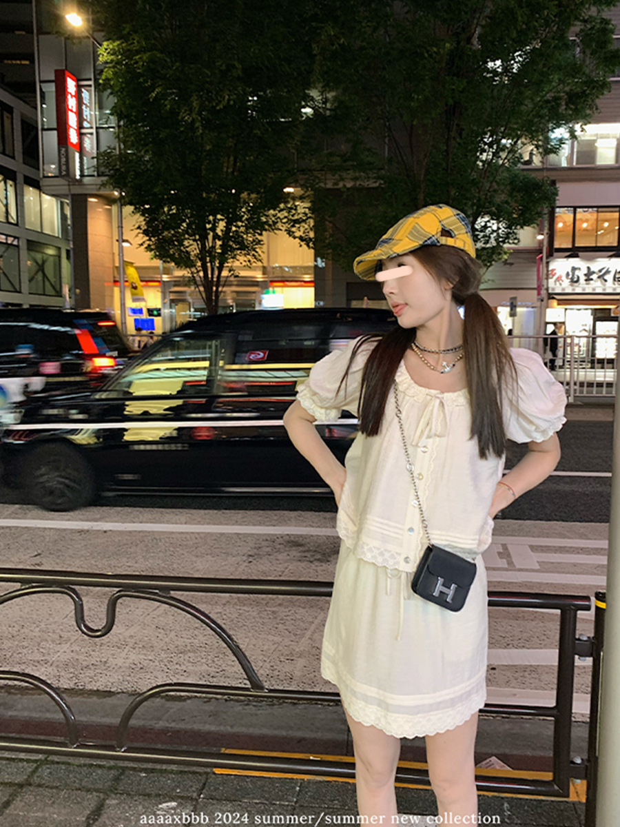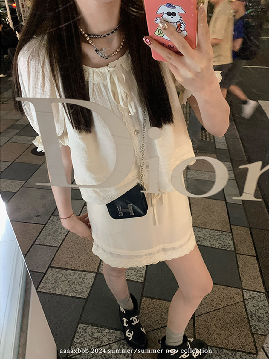 Aaaaxbb 개인 황혼 순수 레이스 세트 2 색 버블 슬리브 탑 드로우 스트링 스커트 투피스 세트