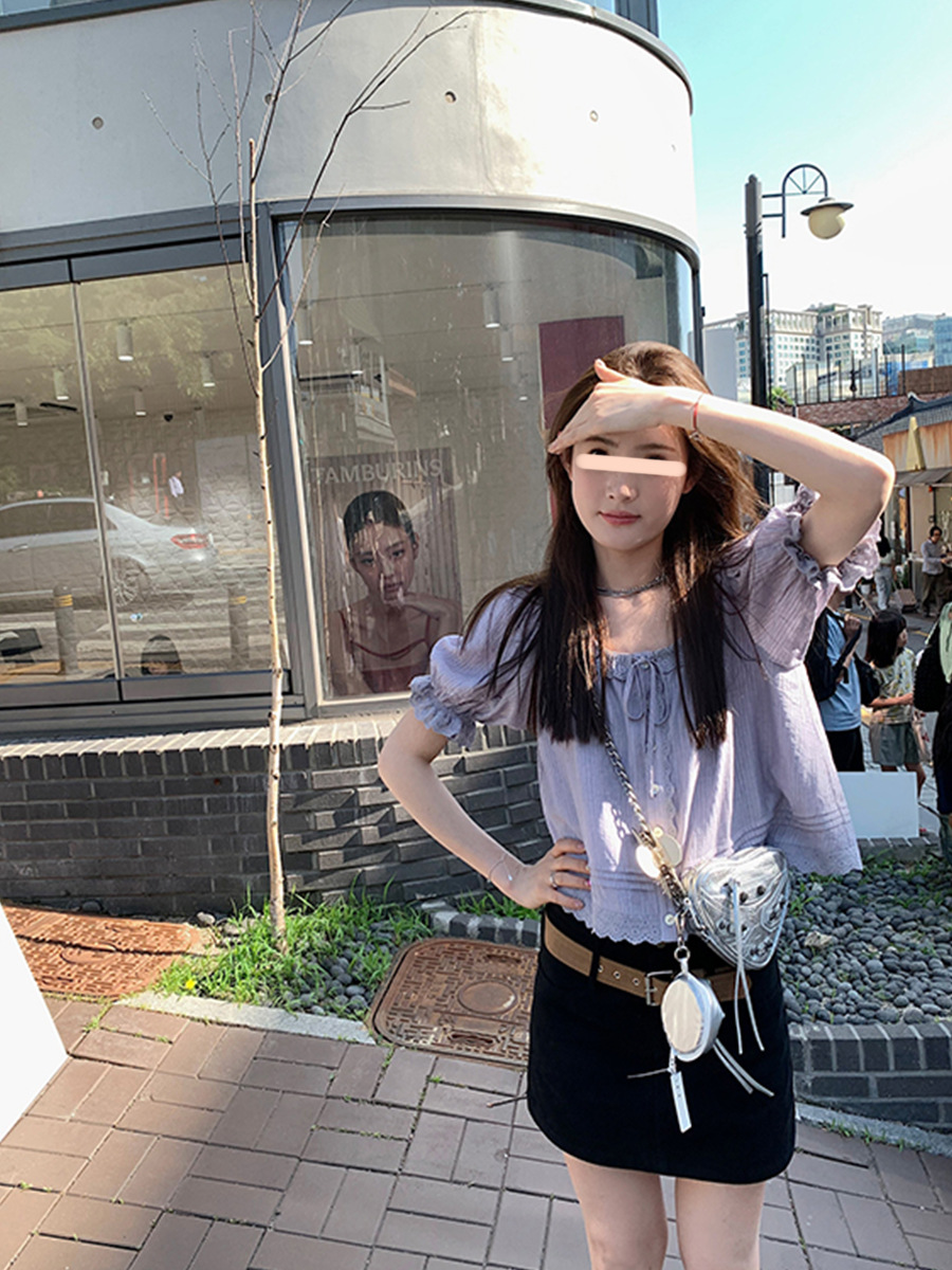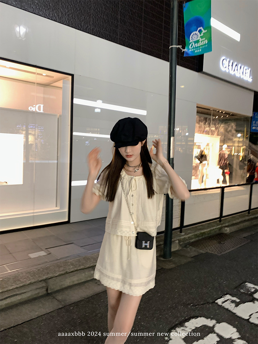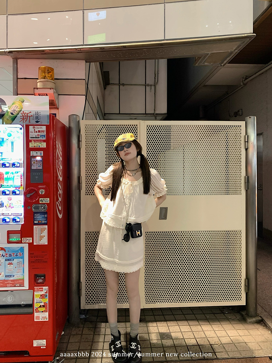 Aaaaxbb 개인 황혼 순수 레이스 세트 2 색 버블 슬리브 탑 드로우 스트링 스커트 투피스 세트