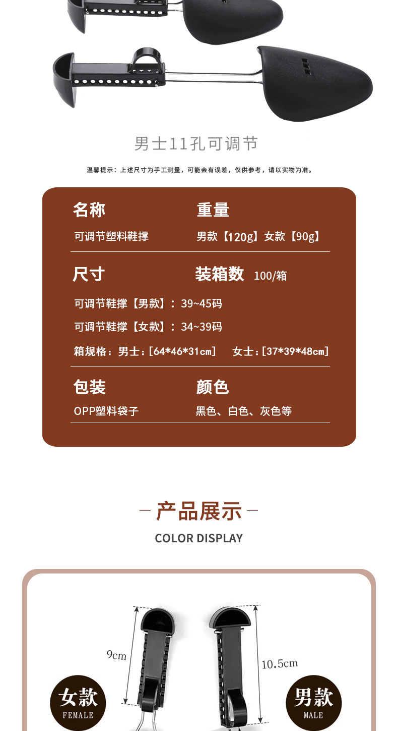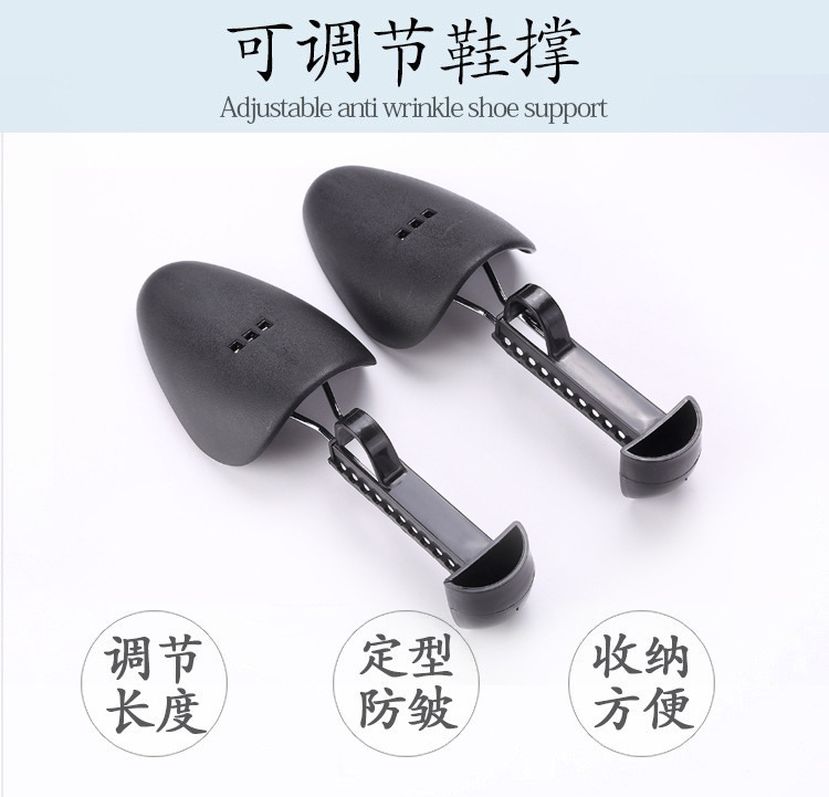 用途:鞋子定形、保护。鞋头稍紧的软皮鞋布鞋,可以调节鞋撑大小,适合多种鞋使用。此款鞋撑利用调解前后长度,使鞋撑前端顶紧鞋腔前脸,后撑紧抵鞋的后帮,保持鞋撑恒定的支撑力,对皮鞋鞋底和鞋面进行有支撑,使用方便能鞋子的使用寿命了!