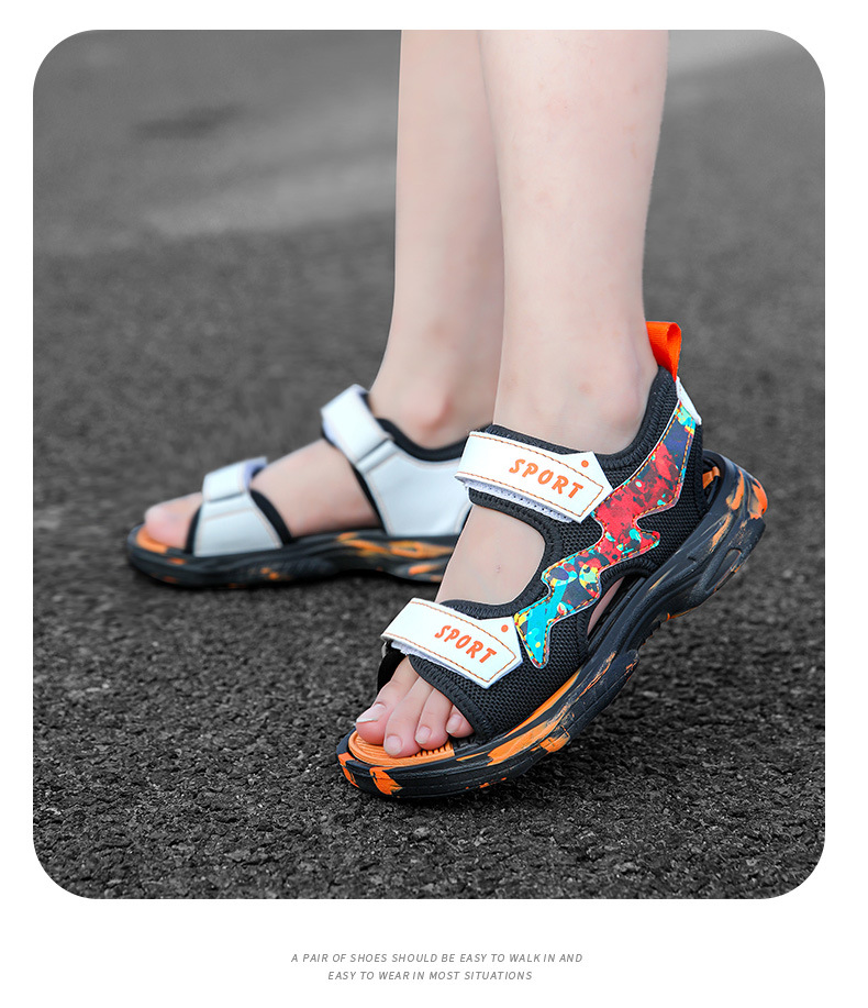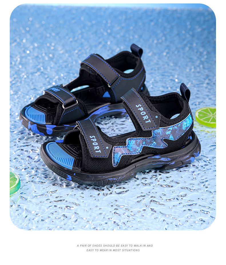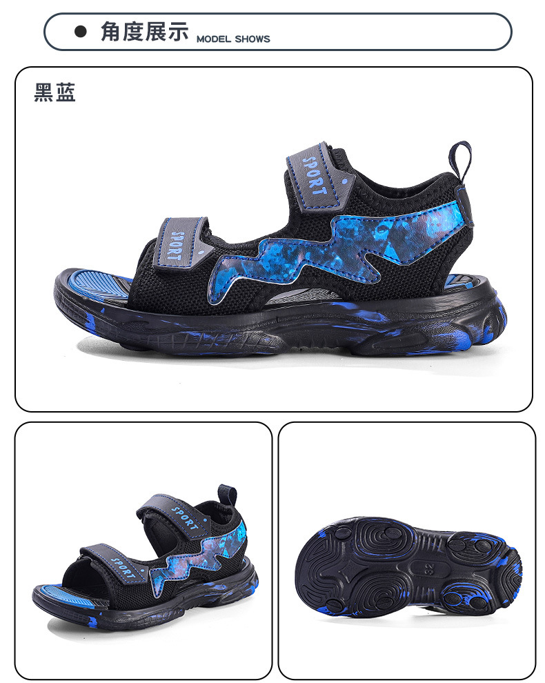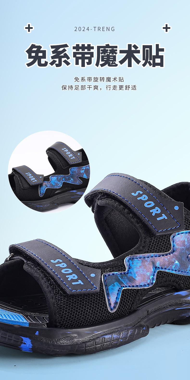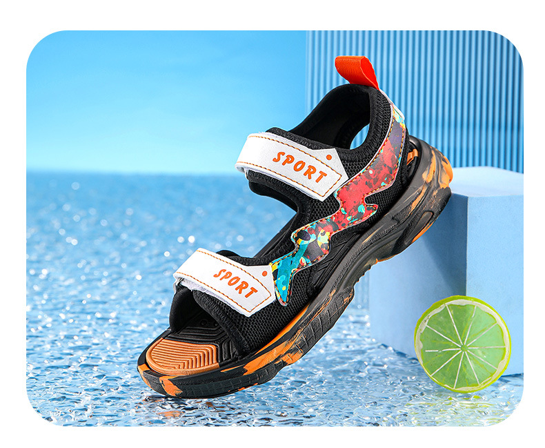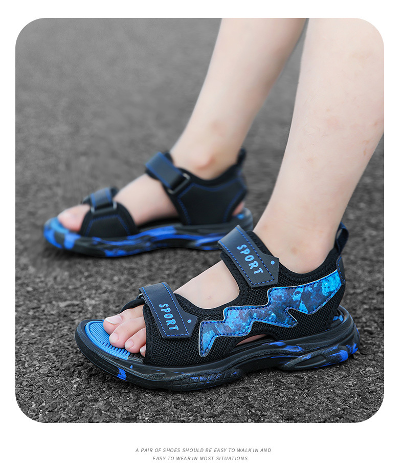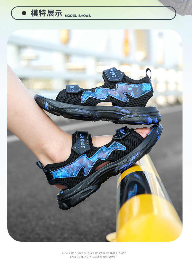 2024 년 여름 새로운 폭발 소년 샌들 벨크로 캐주얼 소년 통기성 할로우 아웃 대형 어린이를위한 미끄럼 방지 샌들