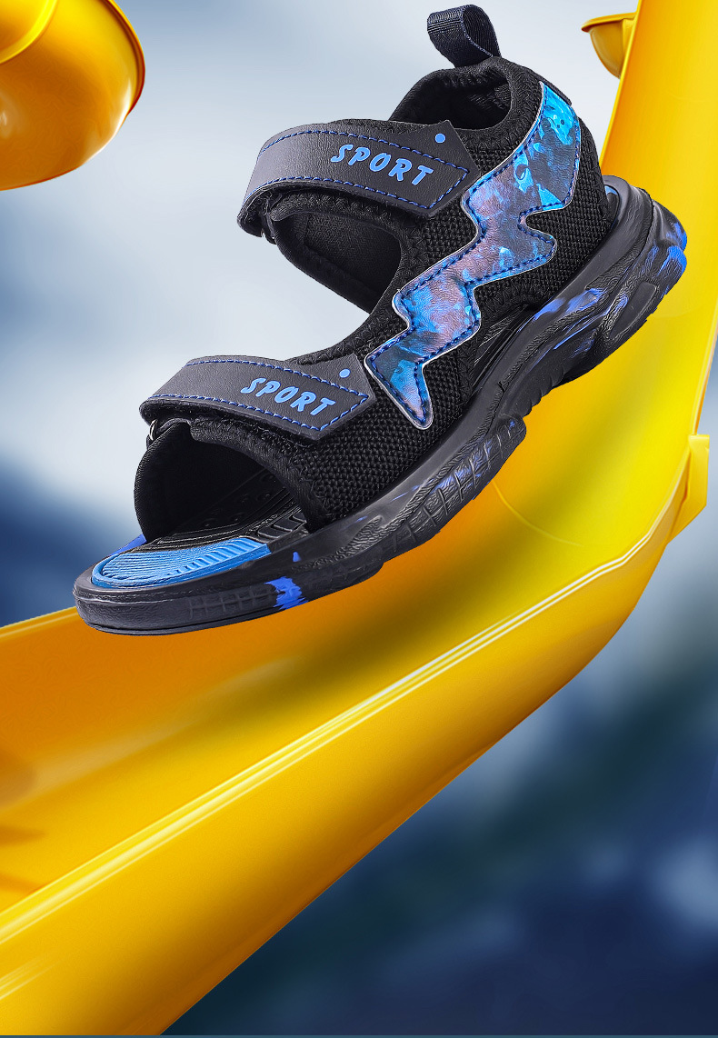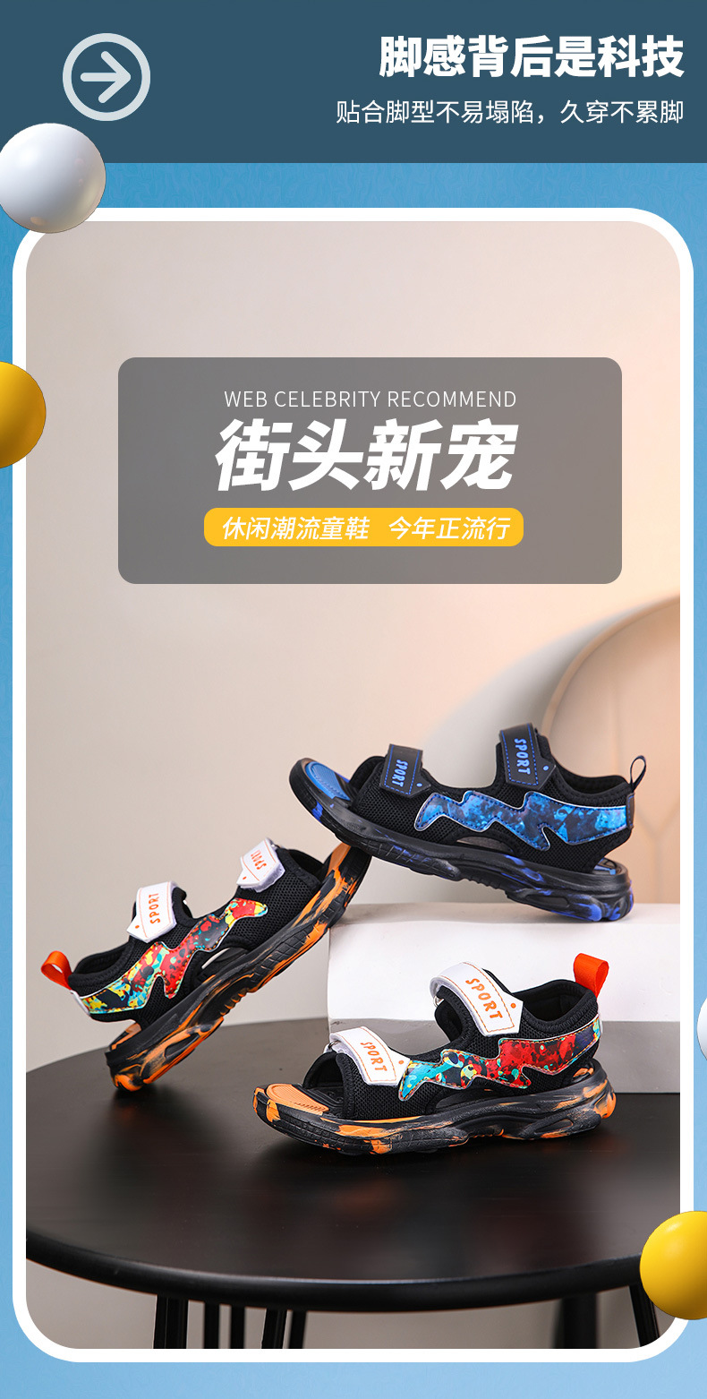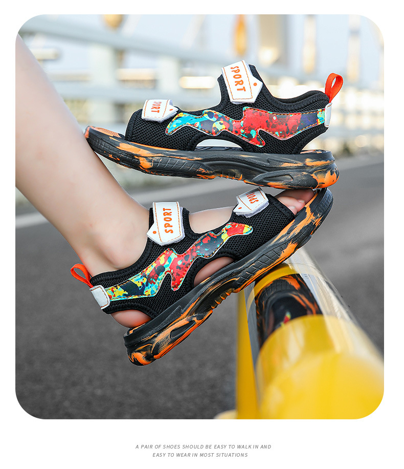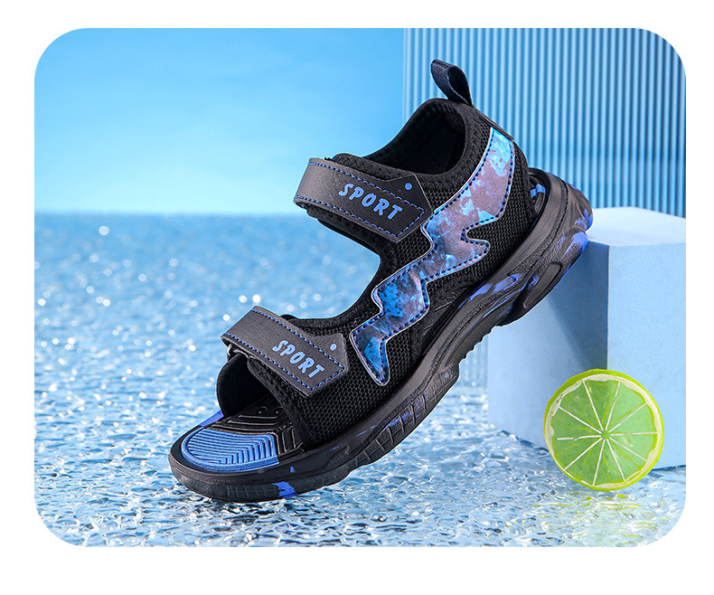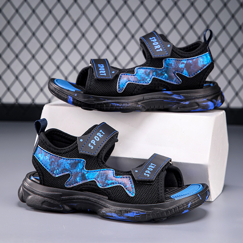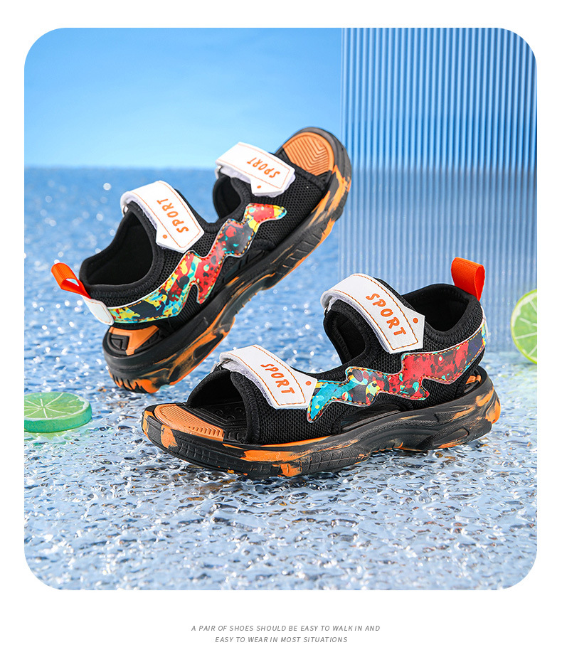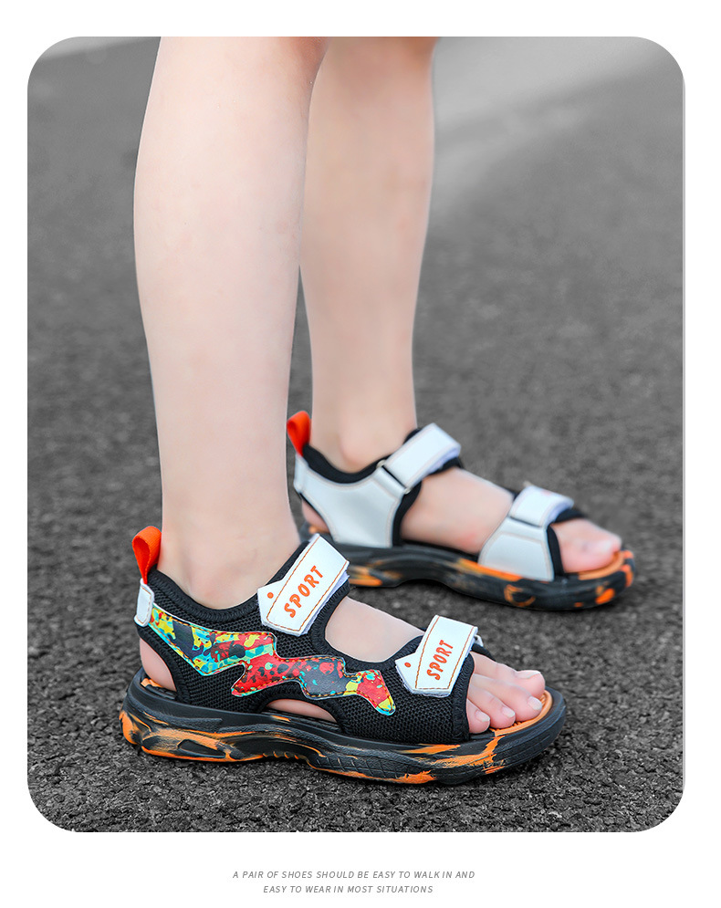2024 년 여름 새로운 폭발 소년 샌들 벨크로 캐주얼 소년 통기성 할로우 아웃 대형 어린이를위한 미끄럼 방지 샌들