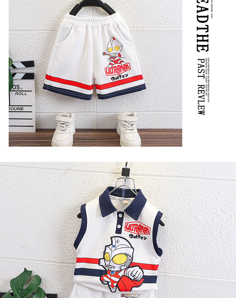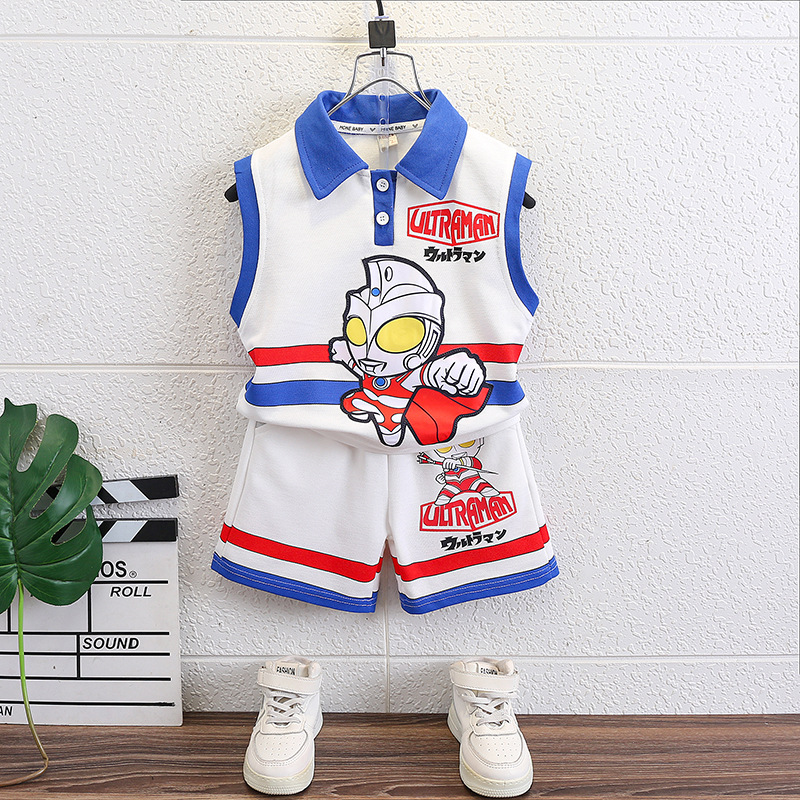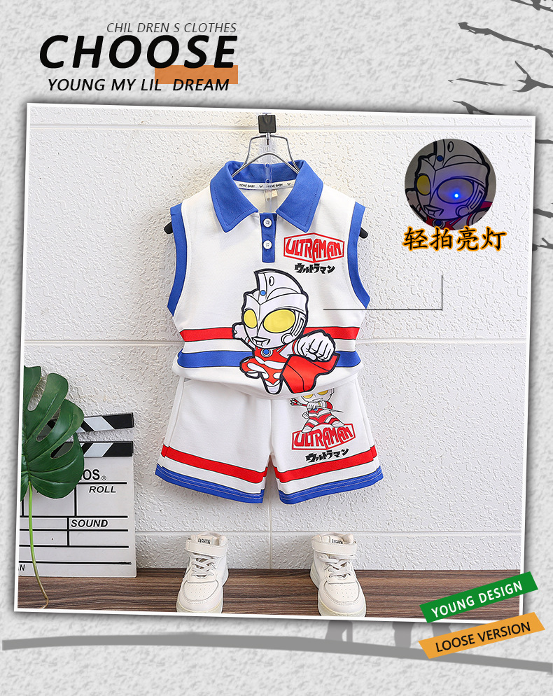 울트라 맨 조명 옷 소년 여름 옷 세트 2024 새로운 어린이 만화 잘 생긴 두 조각 남자의 보물