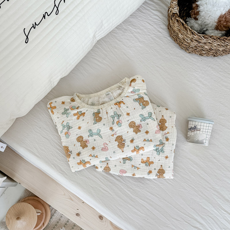 2024 어린이 에어컨 홈 의류 소년과 소녀를위한 더블 레이어 코튼 원사 잠옷 순면 봄과 여름 얇은 네프티 긴 소매 세트
