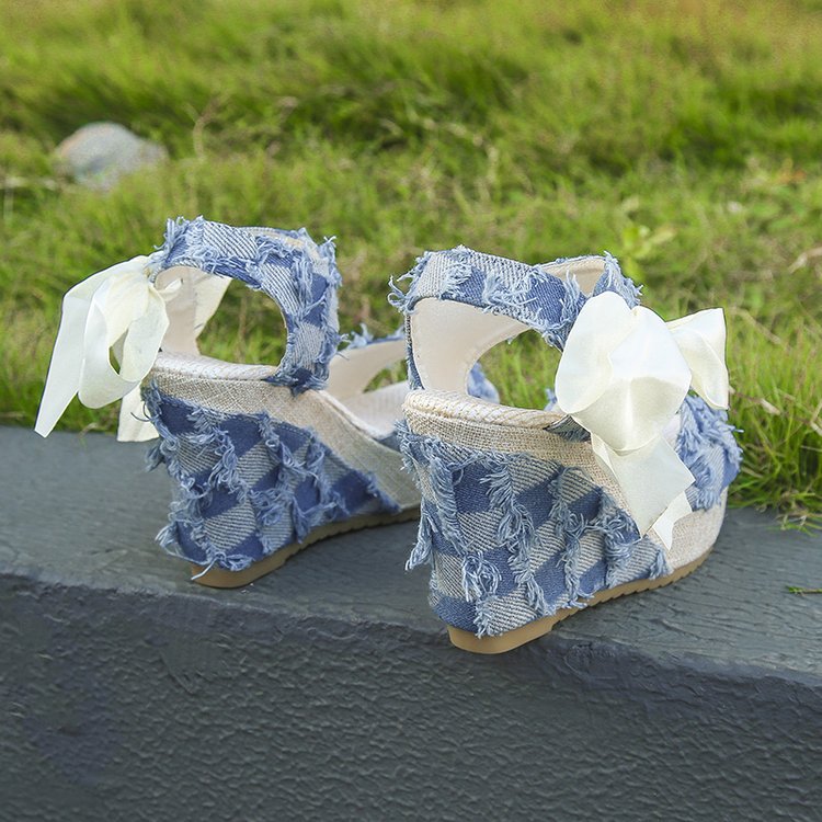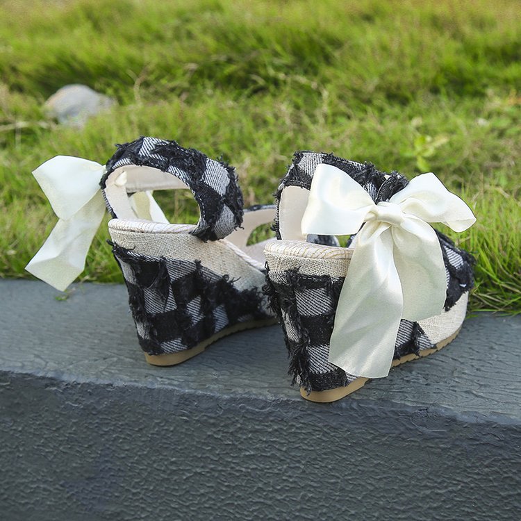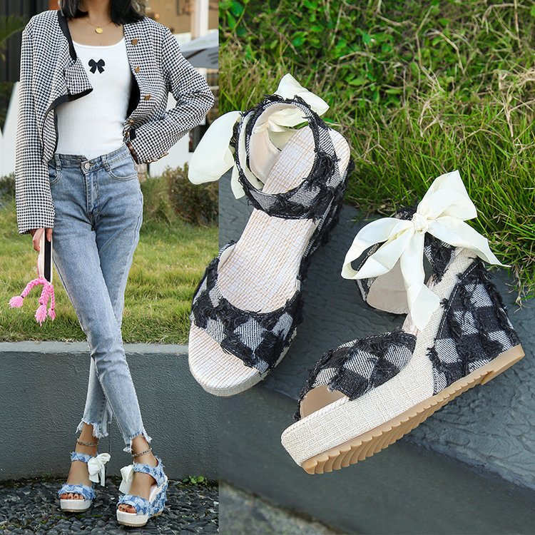민족 스타일 쐐기 물고기 발가락 샌들 여성 여름 새로운 도착 활 레이스 업 컬러 짠 플랫폼 굽 샌들