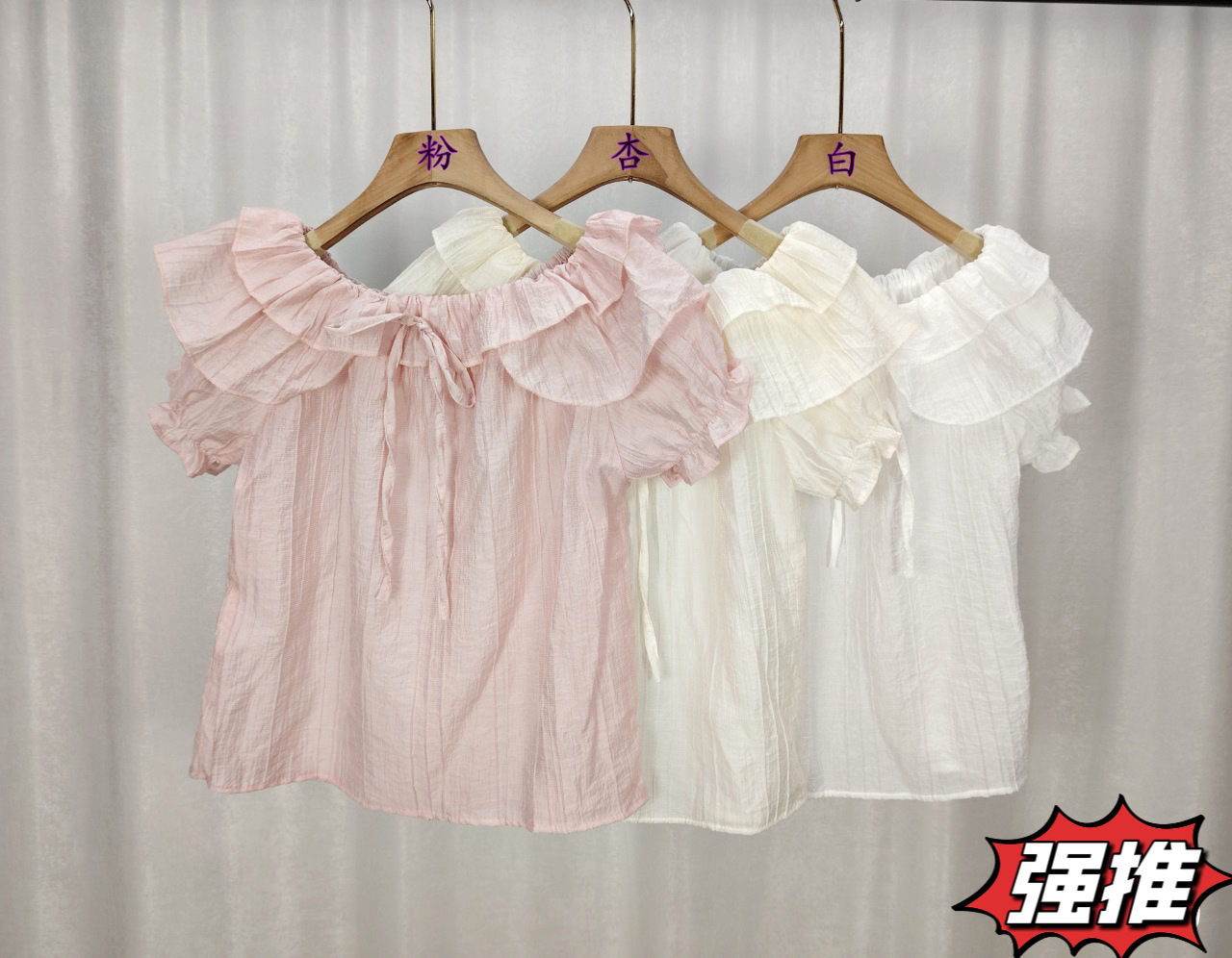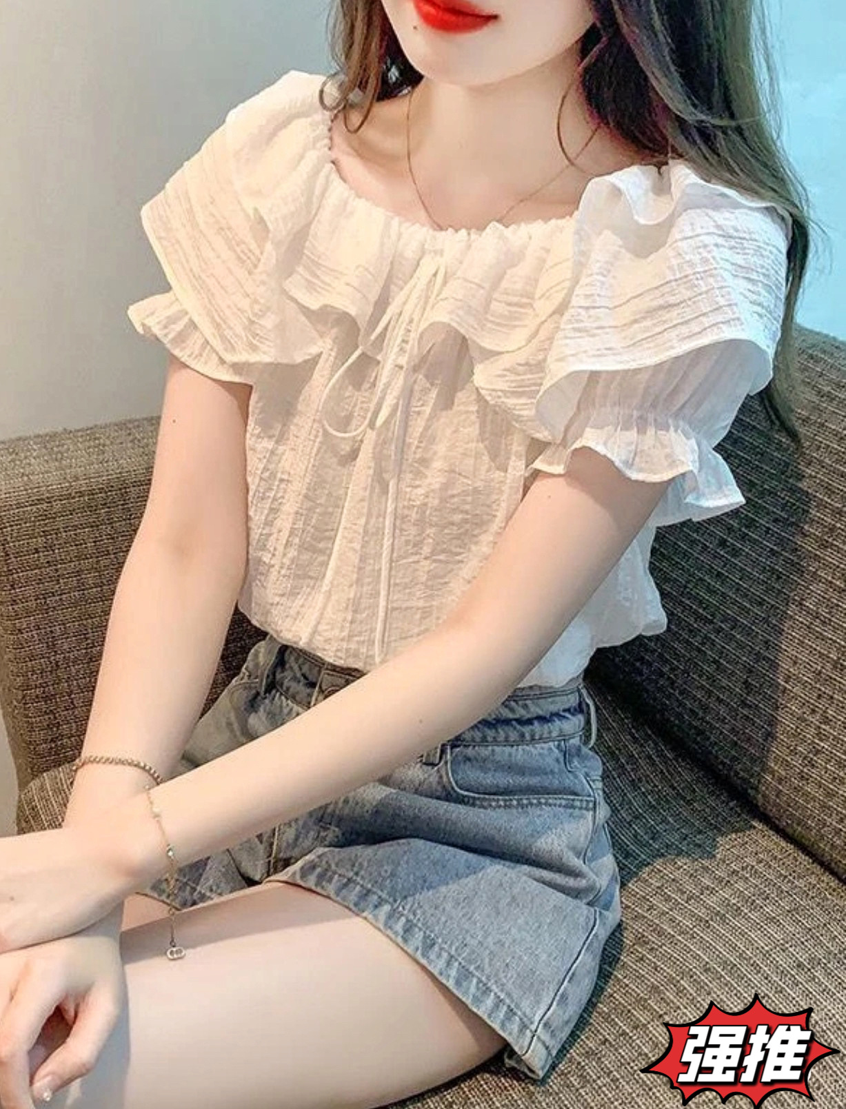 프랑스 러플 숄더 셔츠 여성용 반팔 2024 여름 느슨한 배를 덮는 외국 스타일 예쁜 시폰 탑