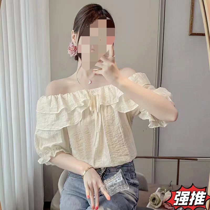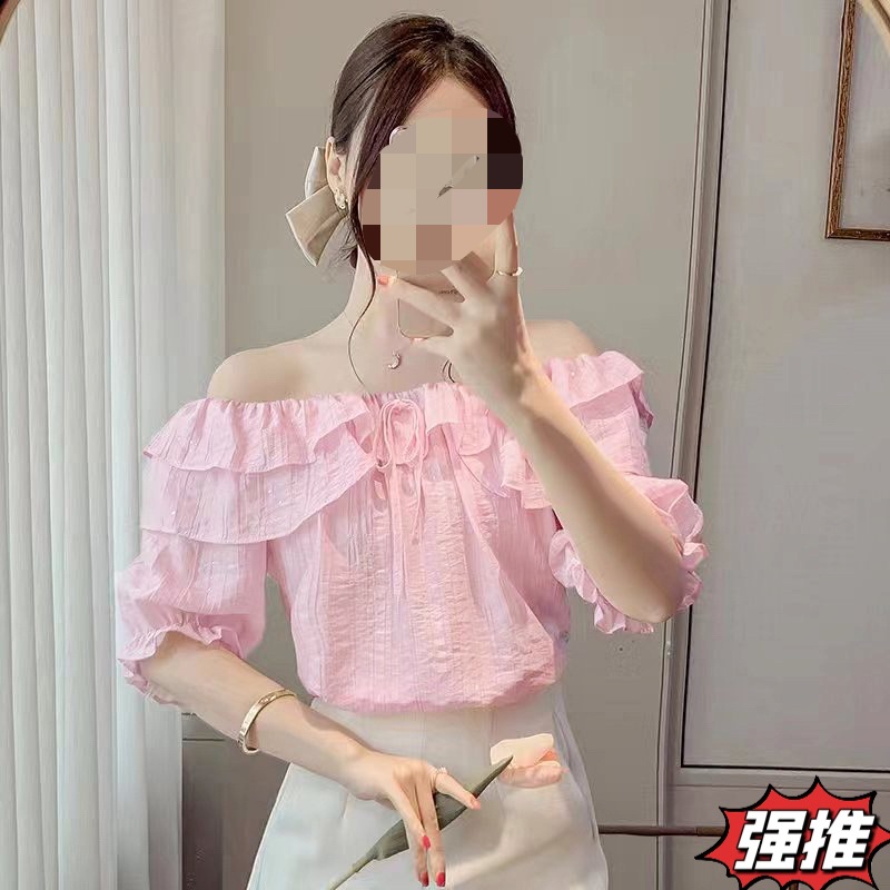 프랑스 러플 숄더 셔츠 여성용 반팔 2024 여름 느슨한 배를 덮는 외국 스타일 예쁜 시폰 탑스토어 가기