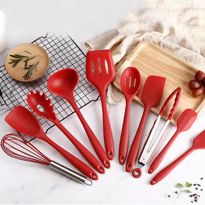 뜨거운 판매 실리콘 주방용품 10 조각 세트 실리콘 냄비 삽 숟가락 수프 스푼 비 스틱 요리 삽 스푼 세트 주방 용품