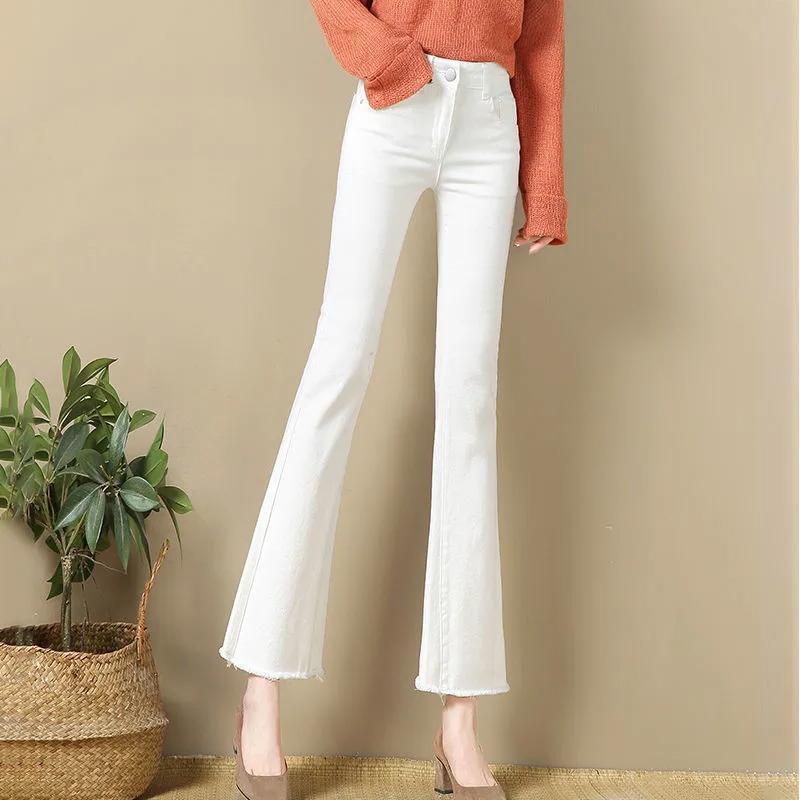 화이트 마이크로 라 청바지 여성의 2024 가을 겨울 기모 높은 허리 높은 슬림 연기 튜브 작은 뿔 청바지