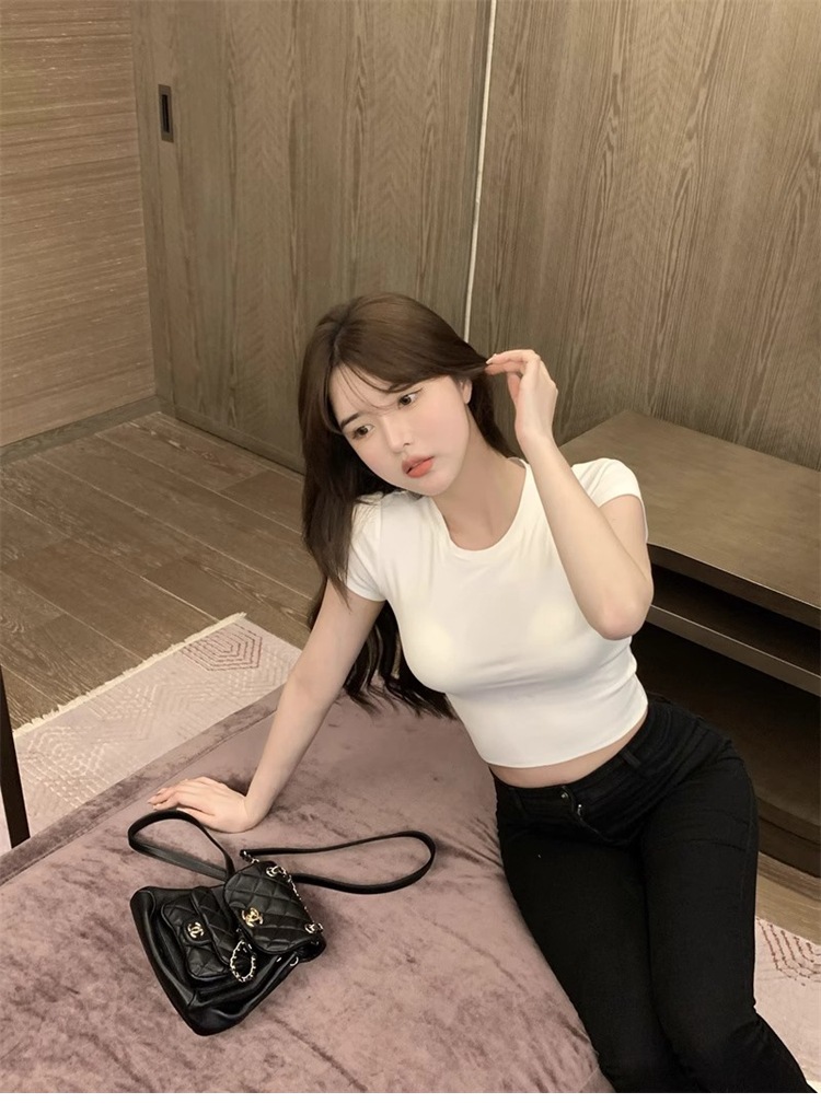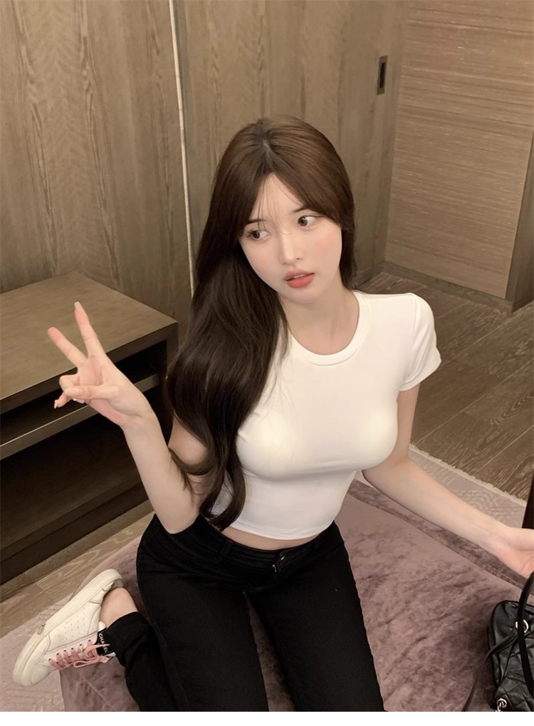 순수한 욕망 스타일 슬림 티셔츠 여성용 달콤한 스파이스 소녀 꽉 어깨 짧은 소매 섹시한 둥근 목 높은 허리 짧은 여름 탑스토어 가기