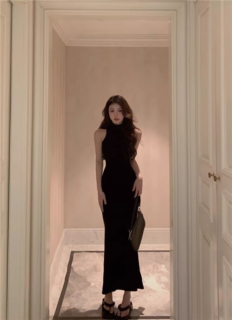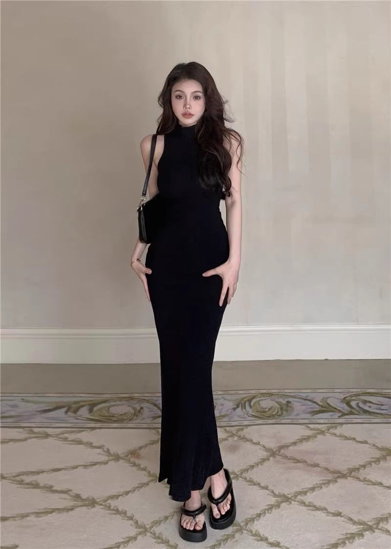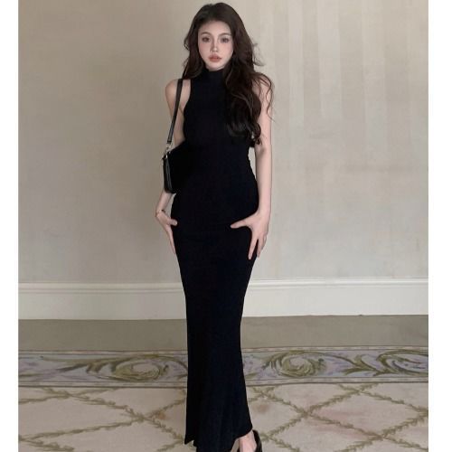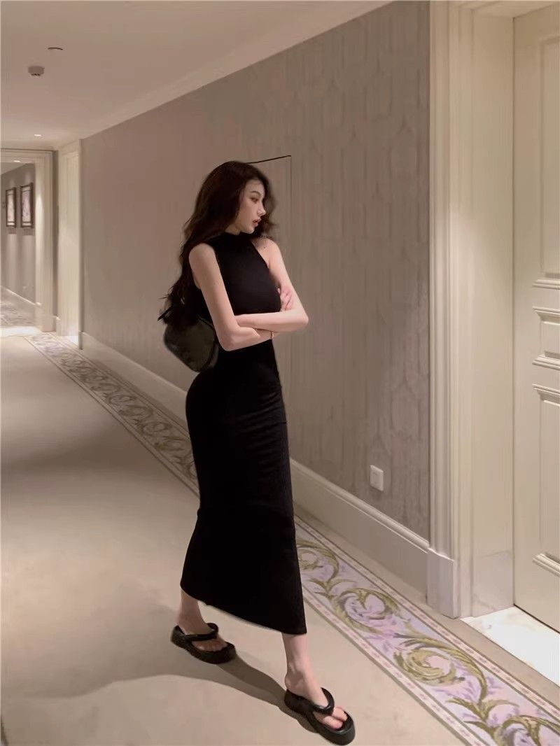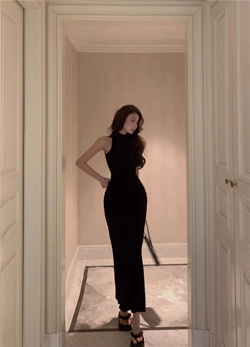 원피스 여성 한국식 여름 틈새 새로운 순수 하이 엔드 민소매 디자인 타이트한 피규어 아첨하는 긴 원피스