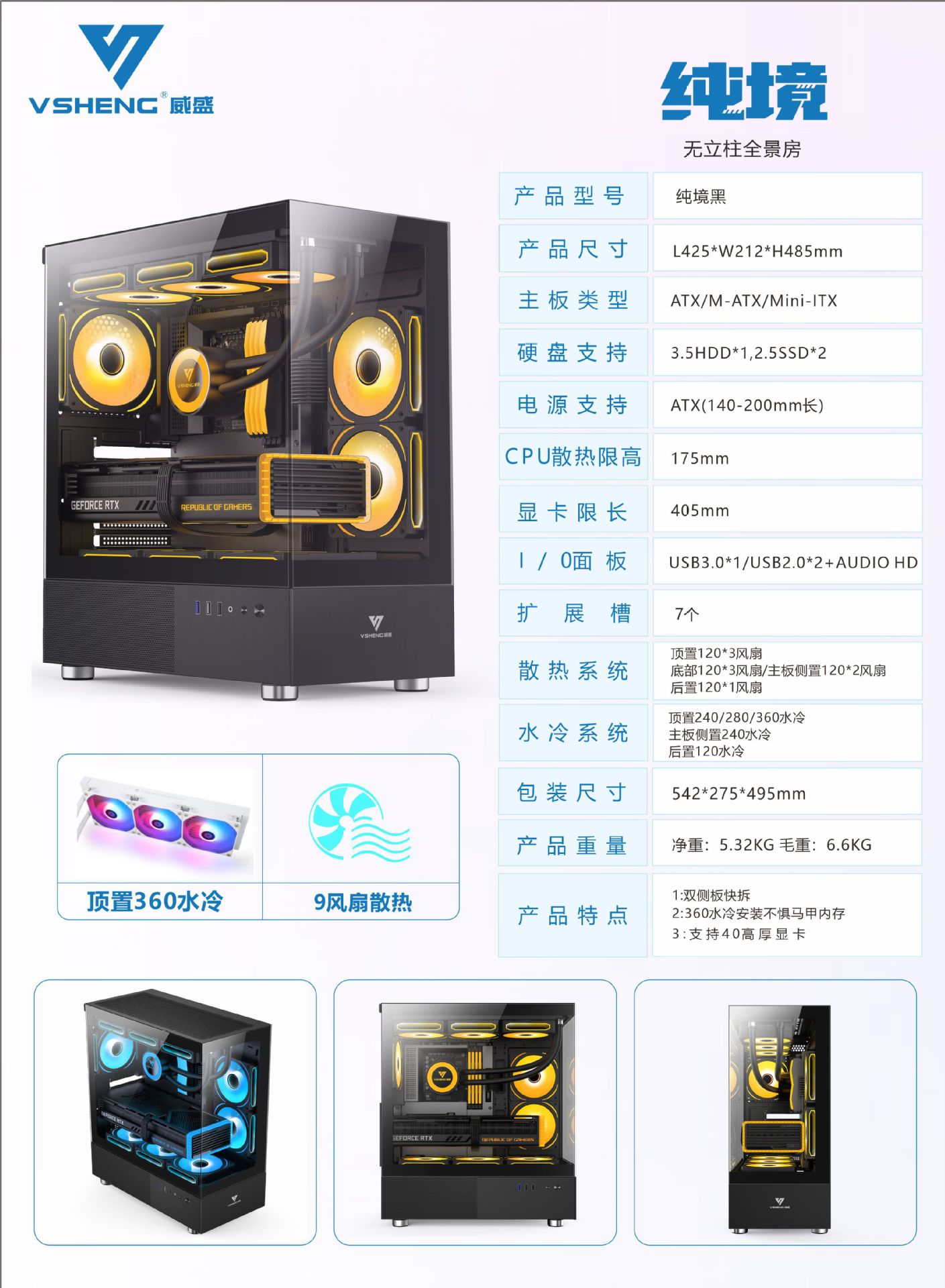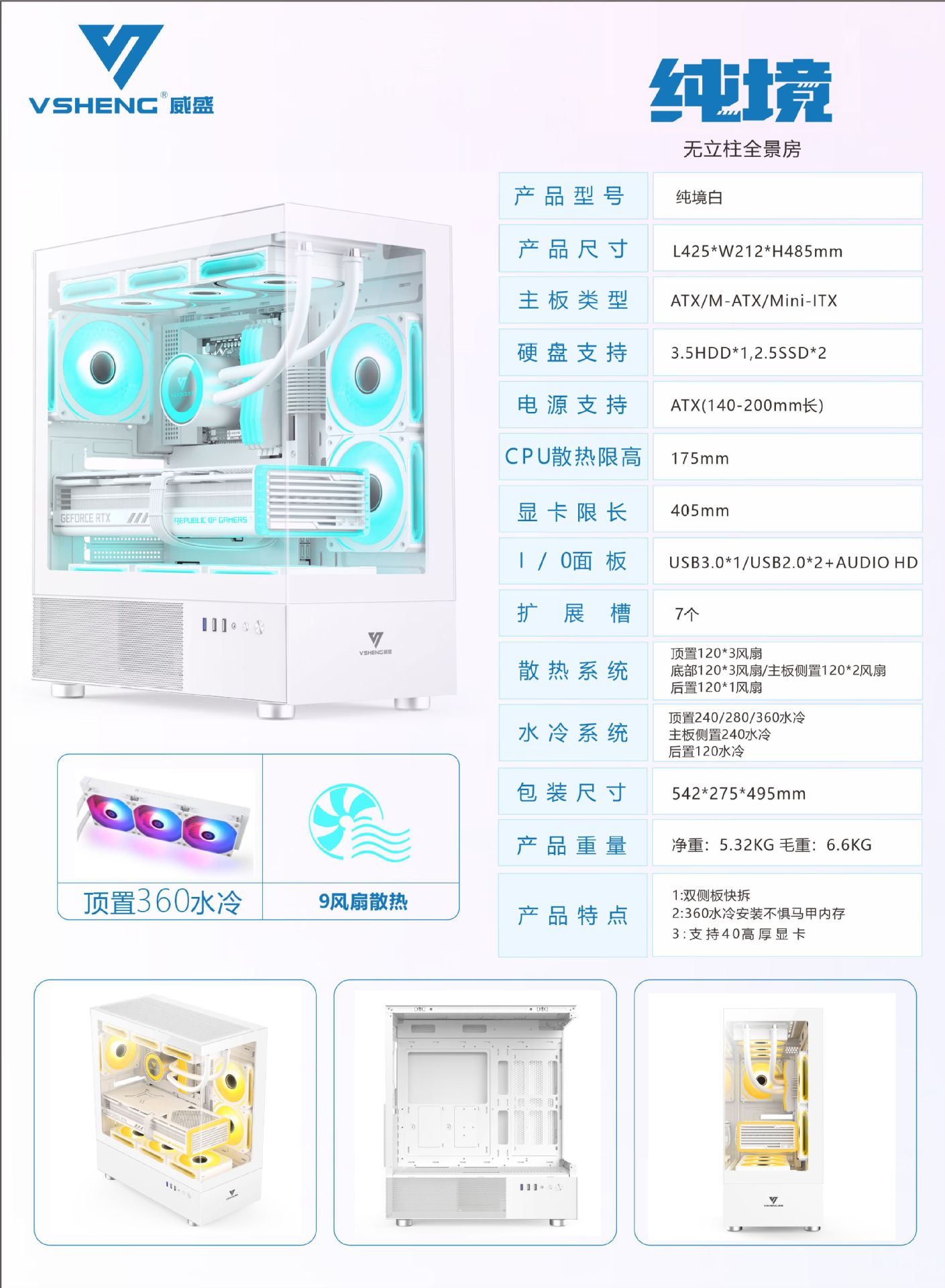 A-포스트가 없는 WEISHENG 순수 미러 컴퓨터 케이스 EATX/ATX 화이트 바다 전망 룸 360 수냉식 케이스 데스크탑
