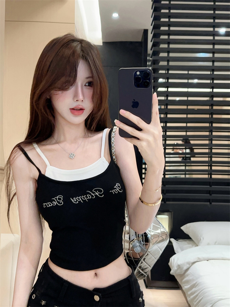 핫걸 자수 페이크 투피스 백리스 슬립탑 이너웨어 여성용 일체형 브라패드 내장 숏탑 아우터웨어