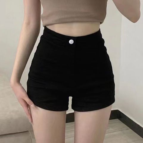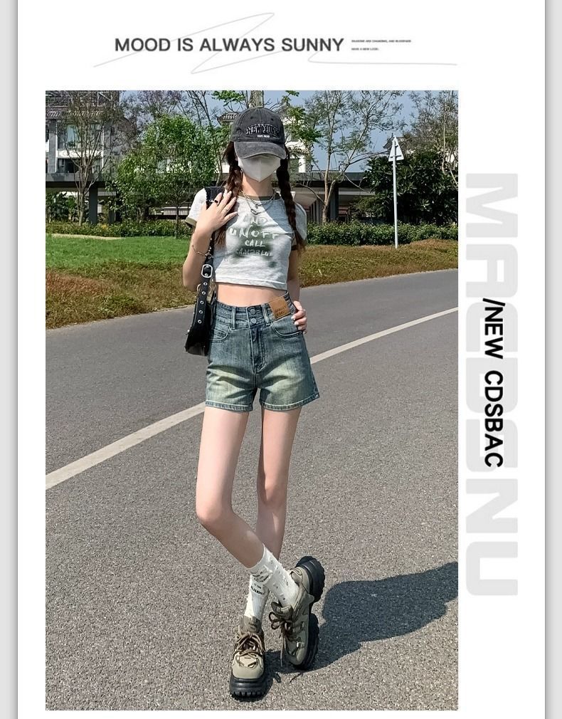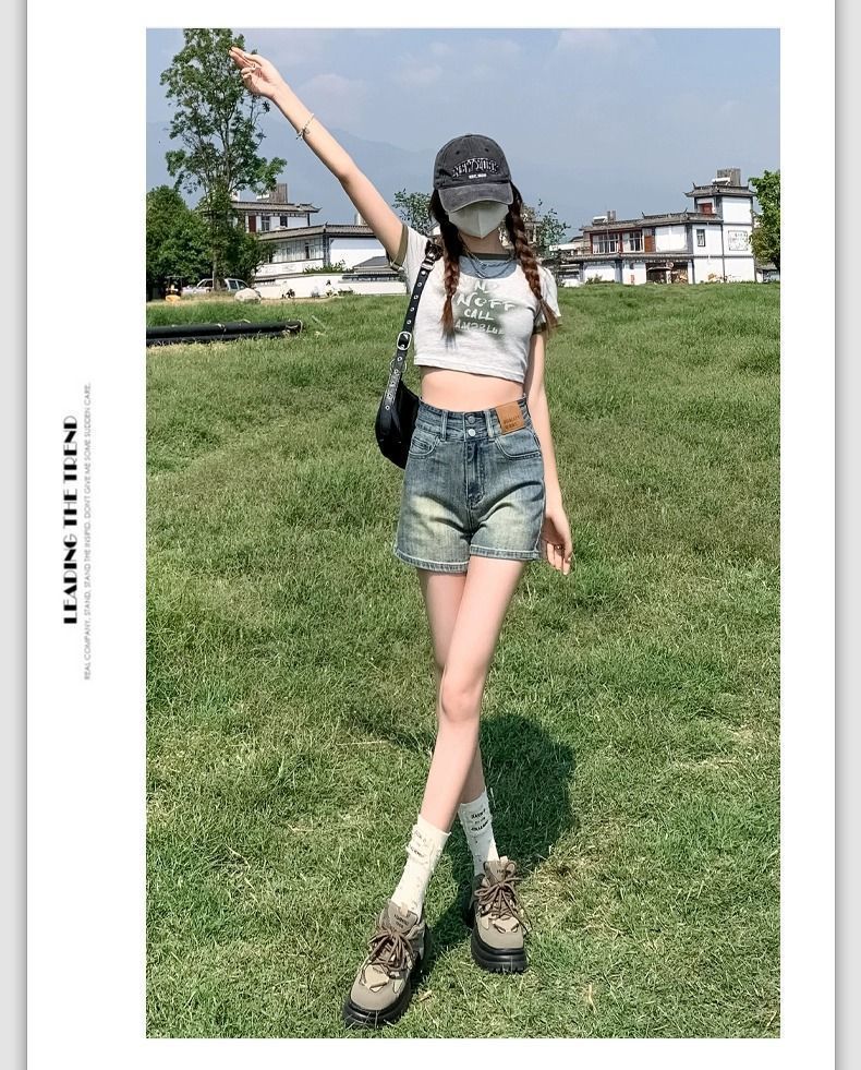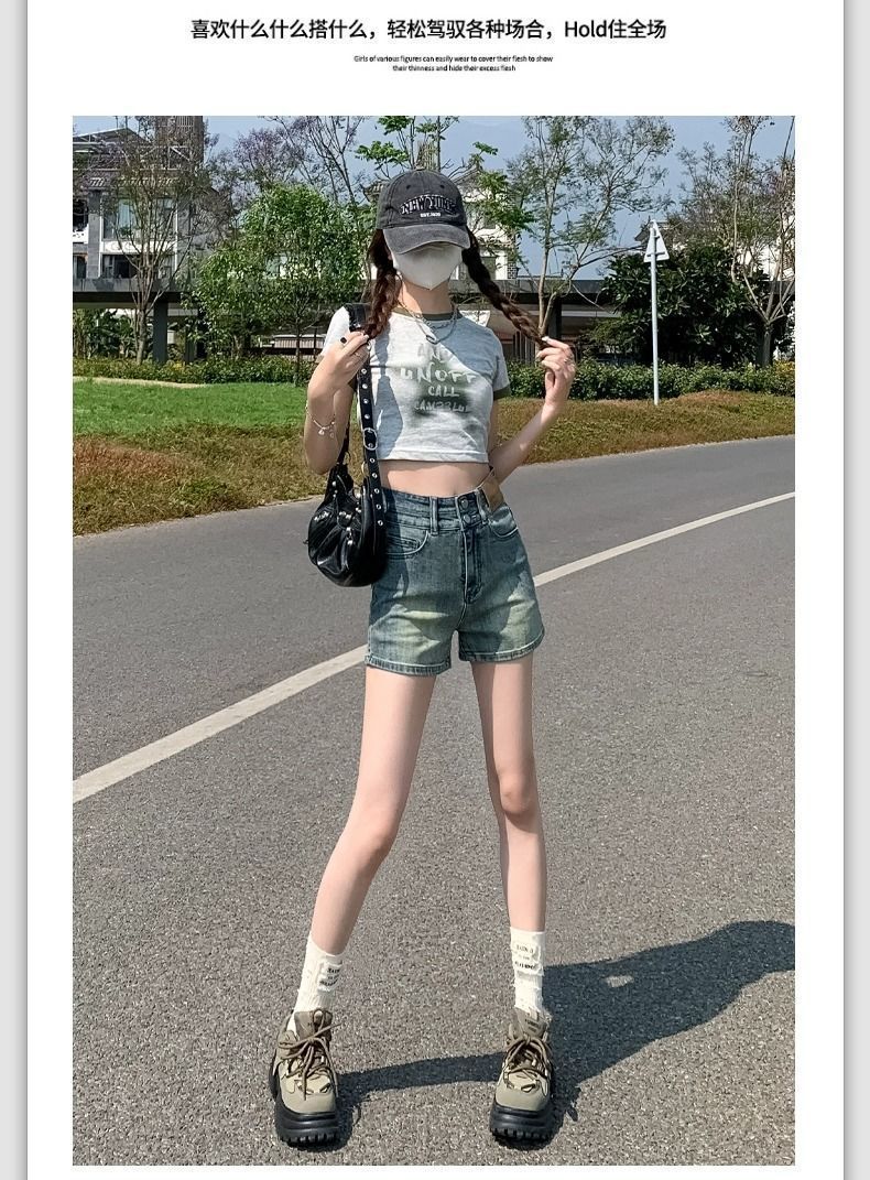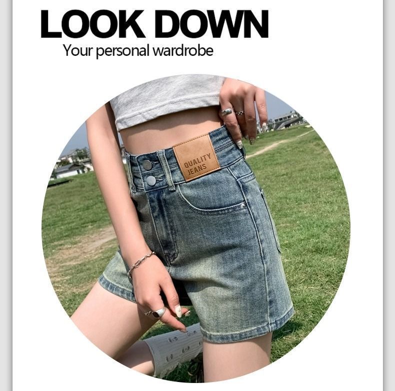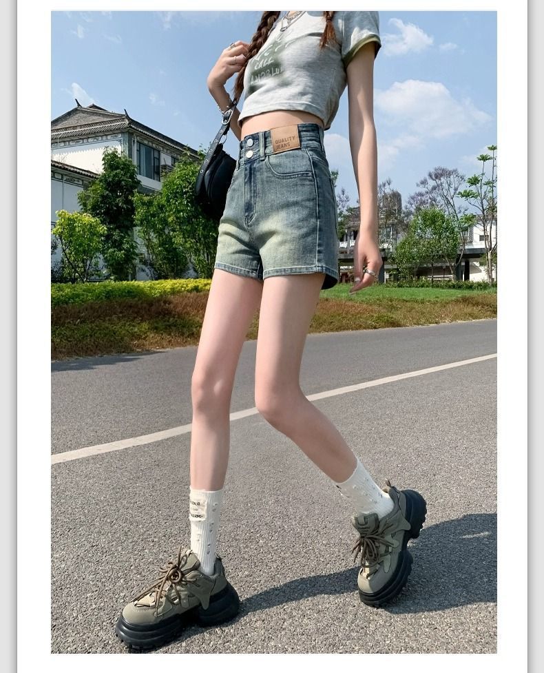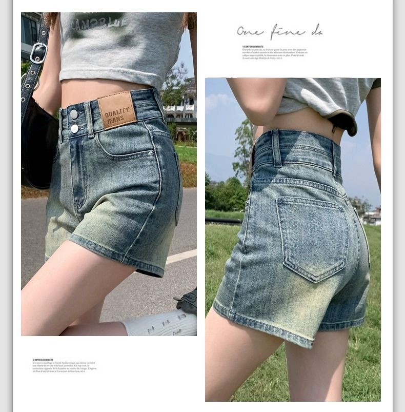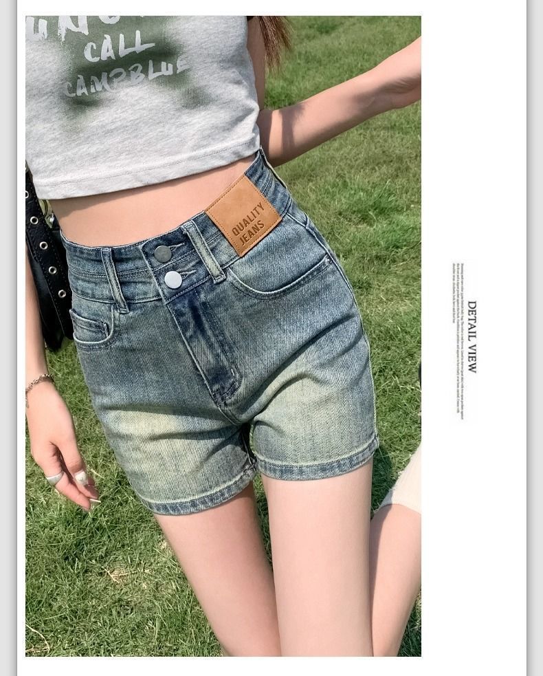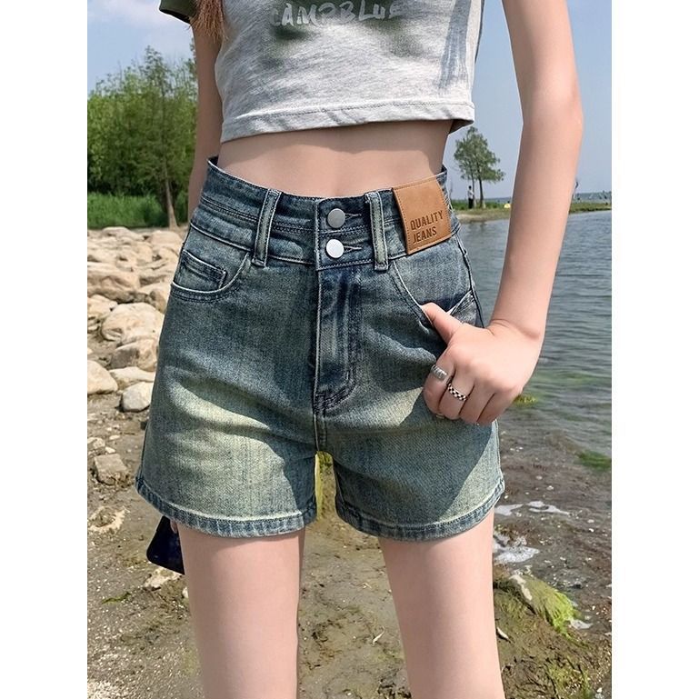 빈티지 더블 버클 데님 반바지 여성 여름 얇은 핫 트렌디 핫 팬츠 높은 허리 및 슬리밍 디자인 센스 A 자 모양의 넓은 다리스토어 가기