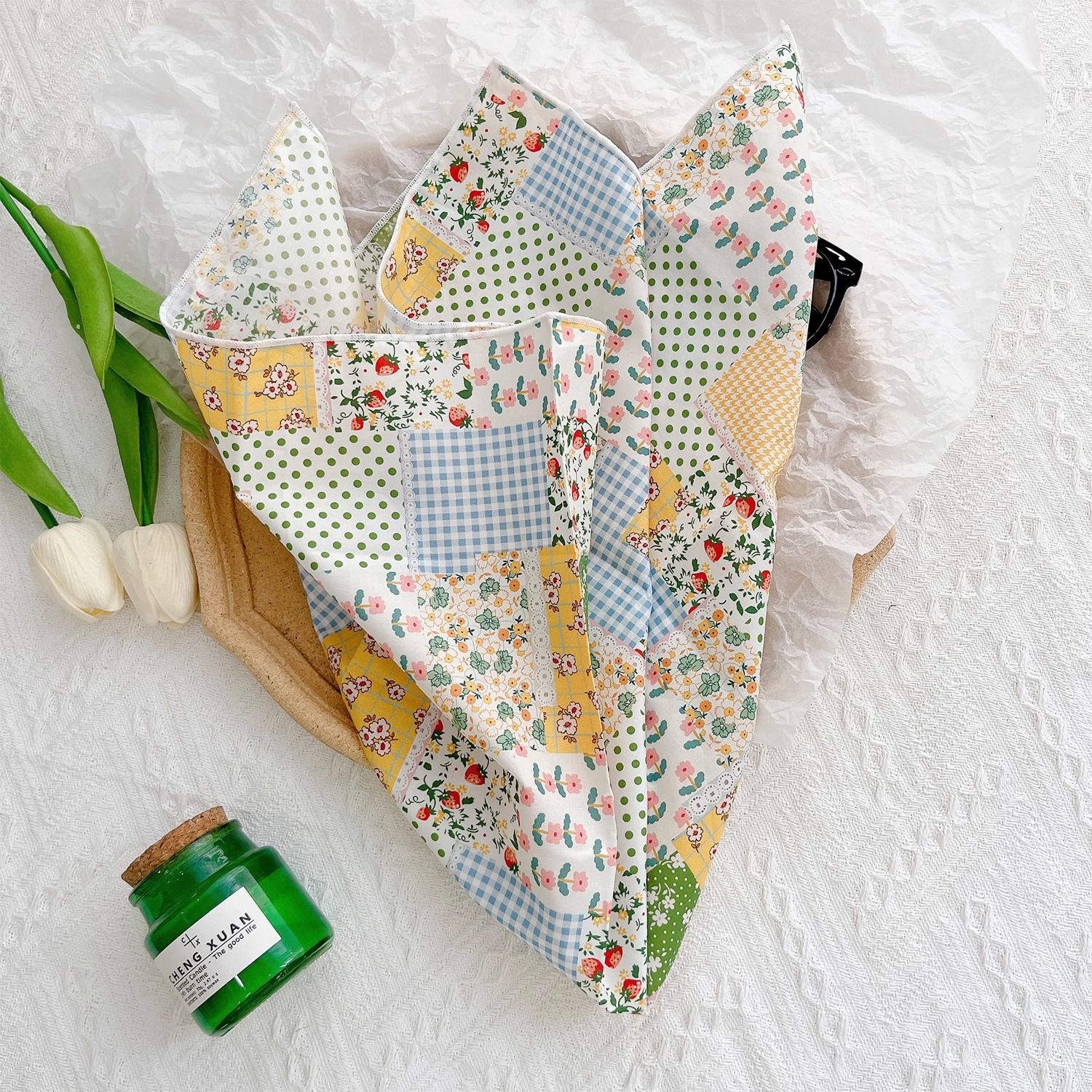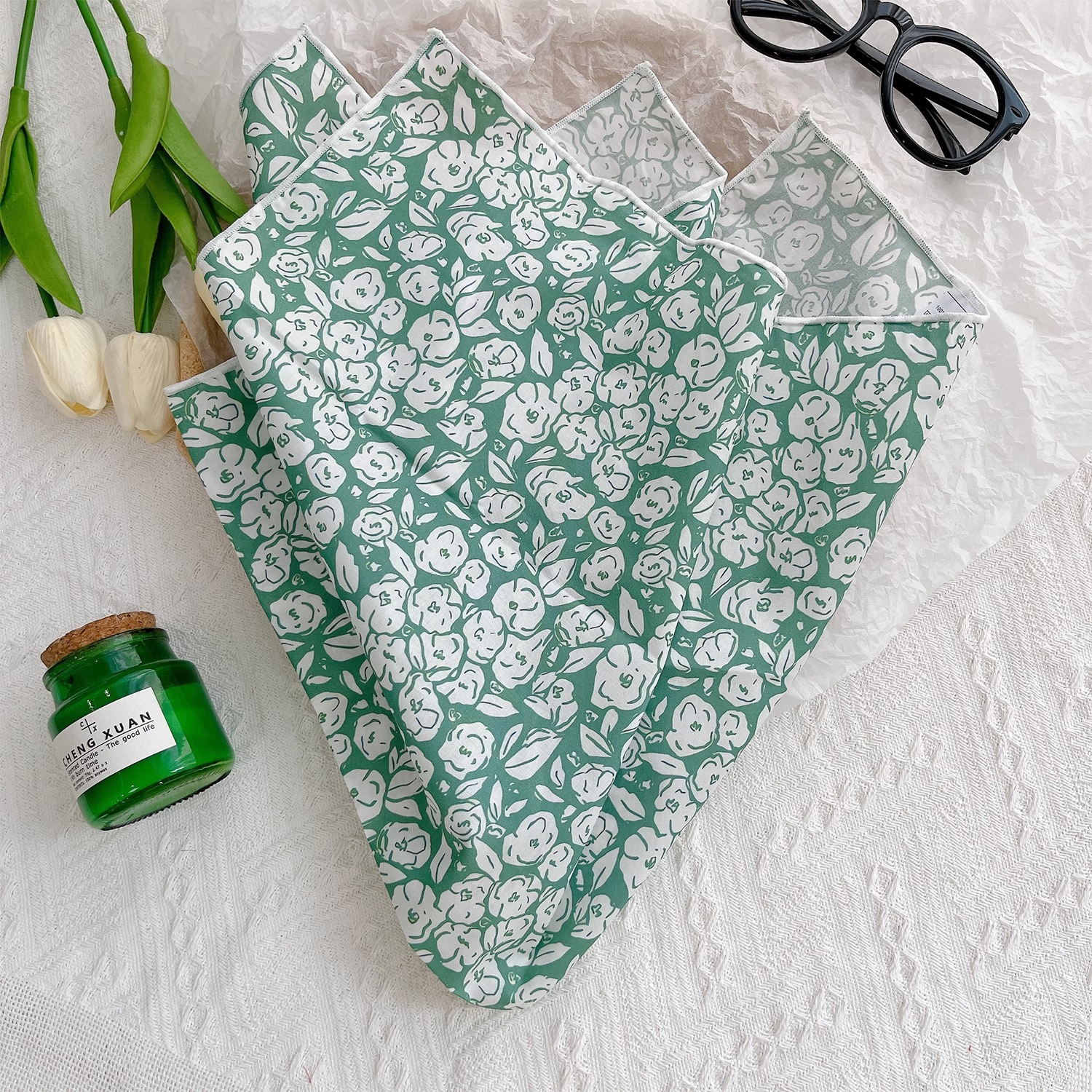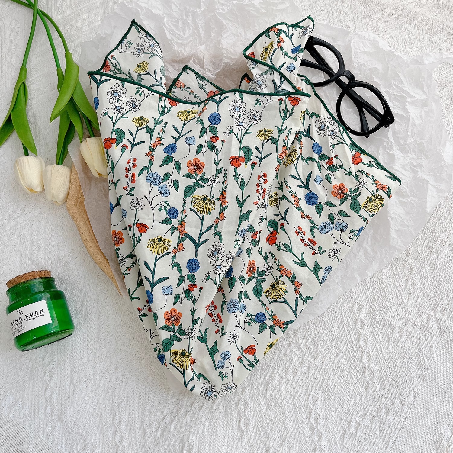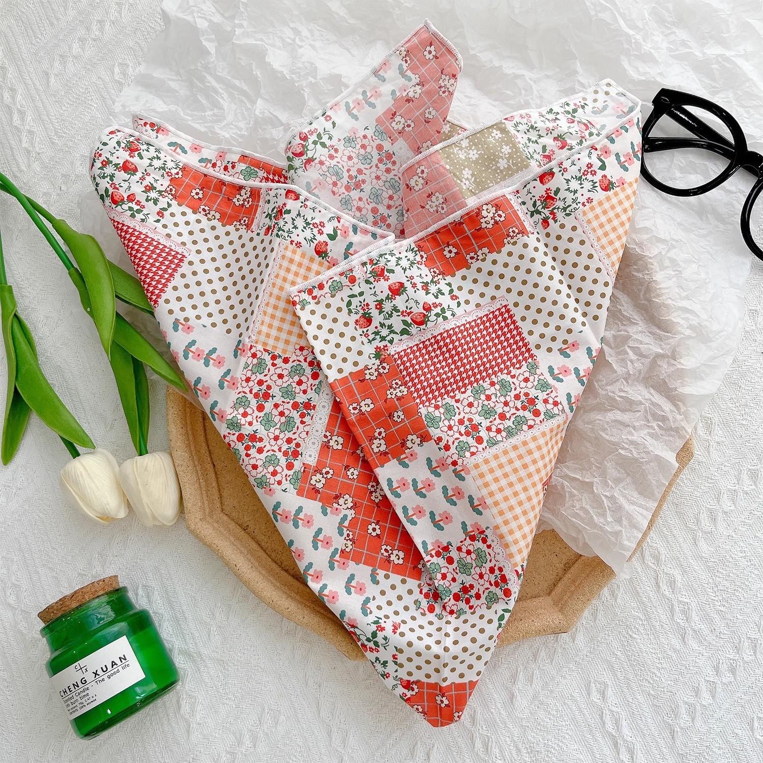 작은 꽃무늬 한국 스타일 봄 여름 신상 순면 작은 사각 스카프, 여성용 머리 스카프, 목 스카프, 얇은 스카프
