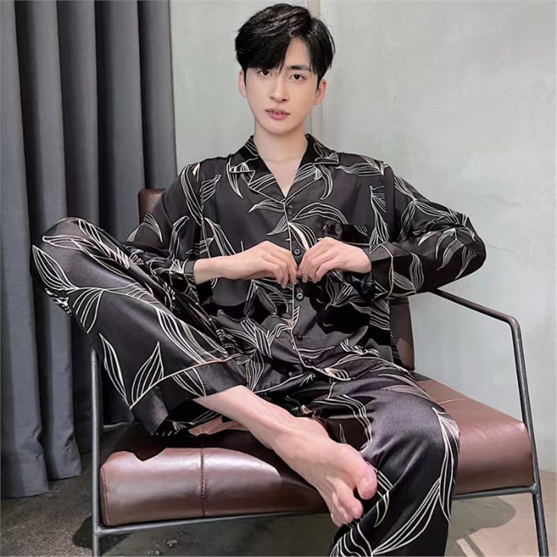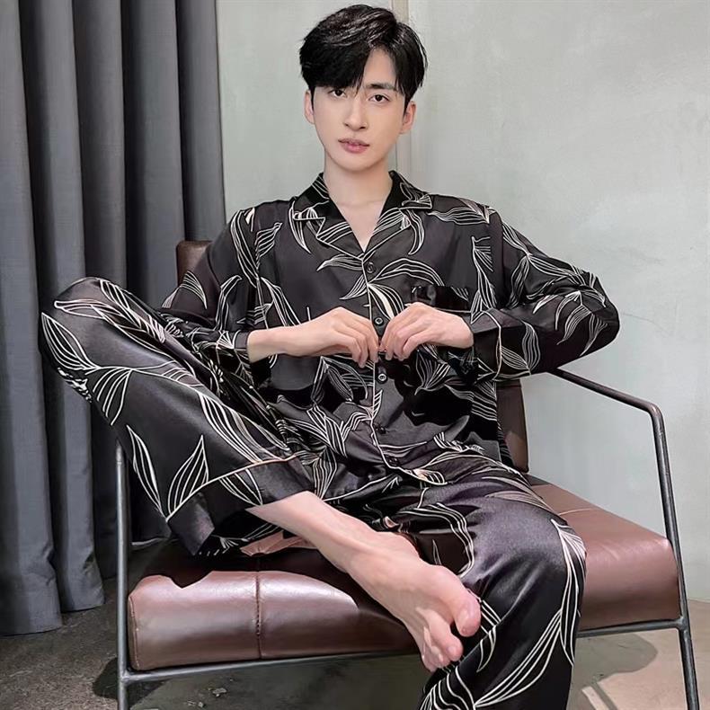 대외 무역 봄과 가을 남성 잠옷 아이스 실크 긴 소매 줄무늬 카디건 세트 겉옷 하이 엔드 라이트 럭셔리 홈 옷
