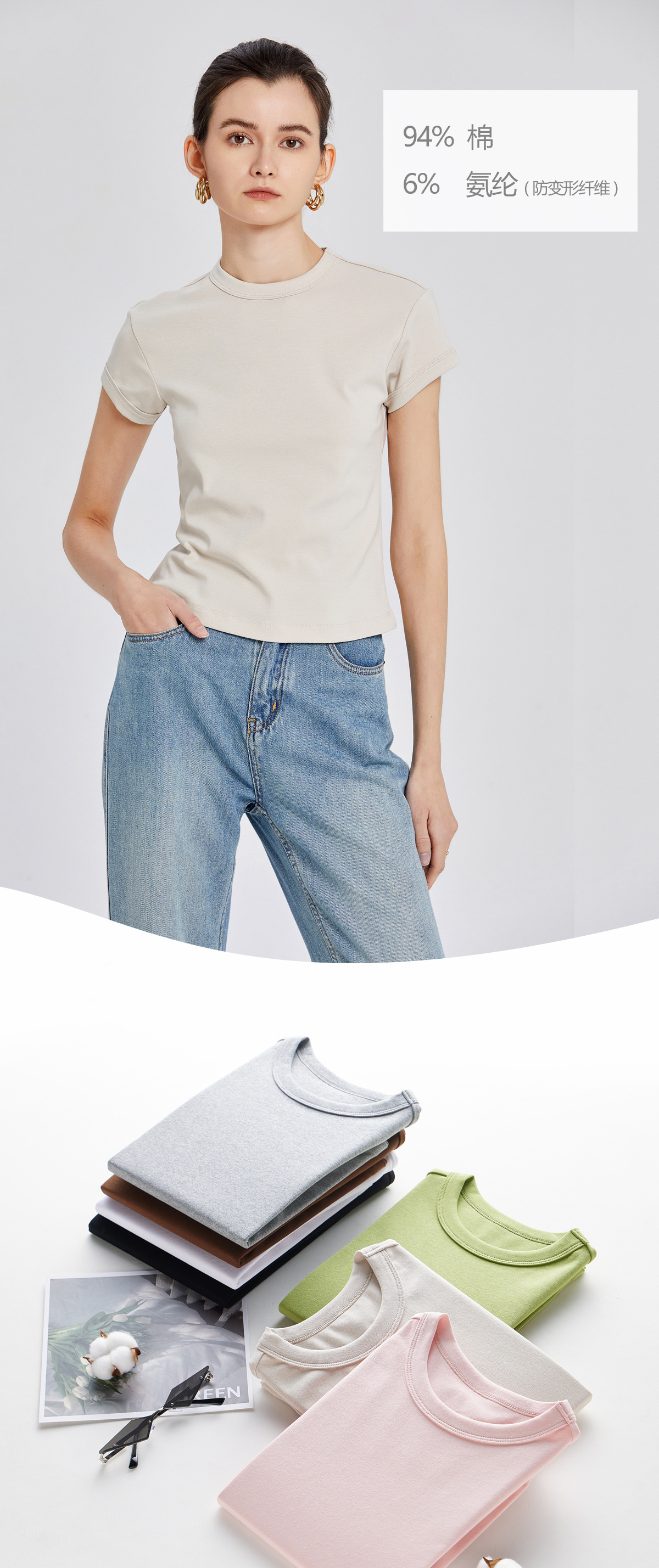 캐주얼 통근 탄성 라운드 넥 슬림 핏 숄더베이스 티셔츠 여성용 심플한 슬림 24 년 여름 뉴 톱 여성스토어 가기