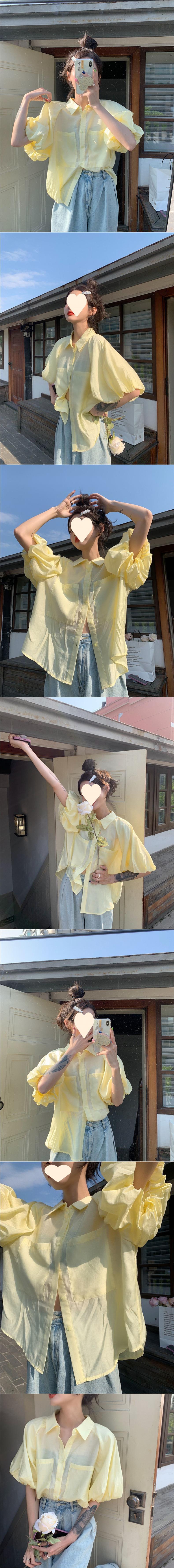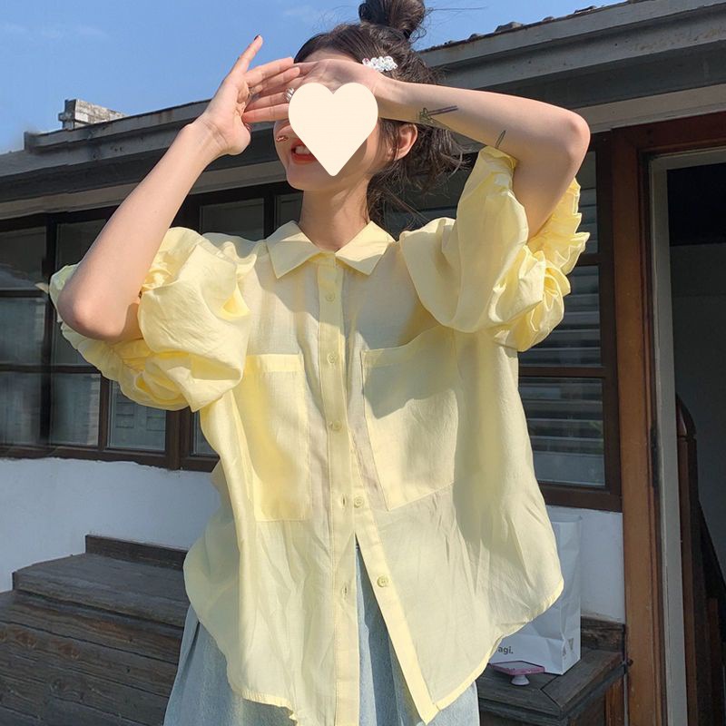 프랑스 스타일 세련된 달콤한 단색 최고 디자인 센스 쉬폰 셔츠 여성의 요정 버블 짧은 소매 셔츠 여름 트렌드스토어 가기