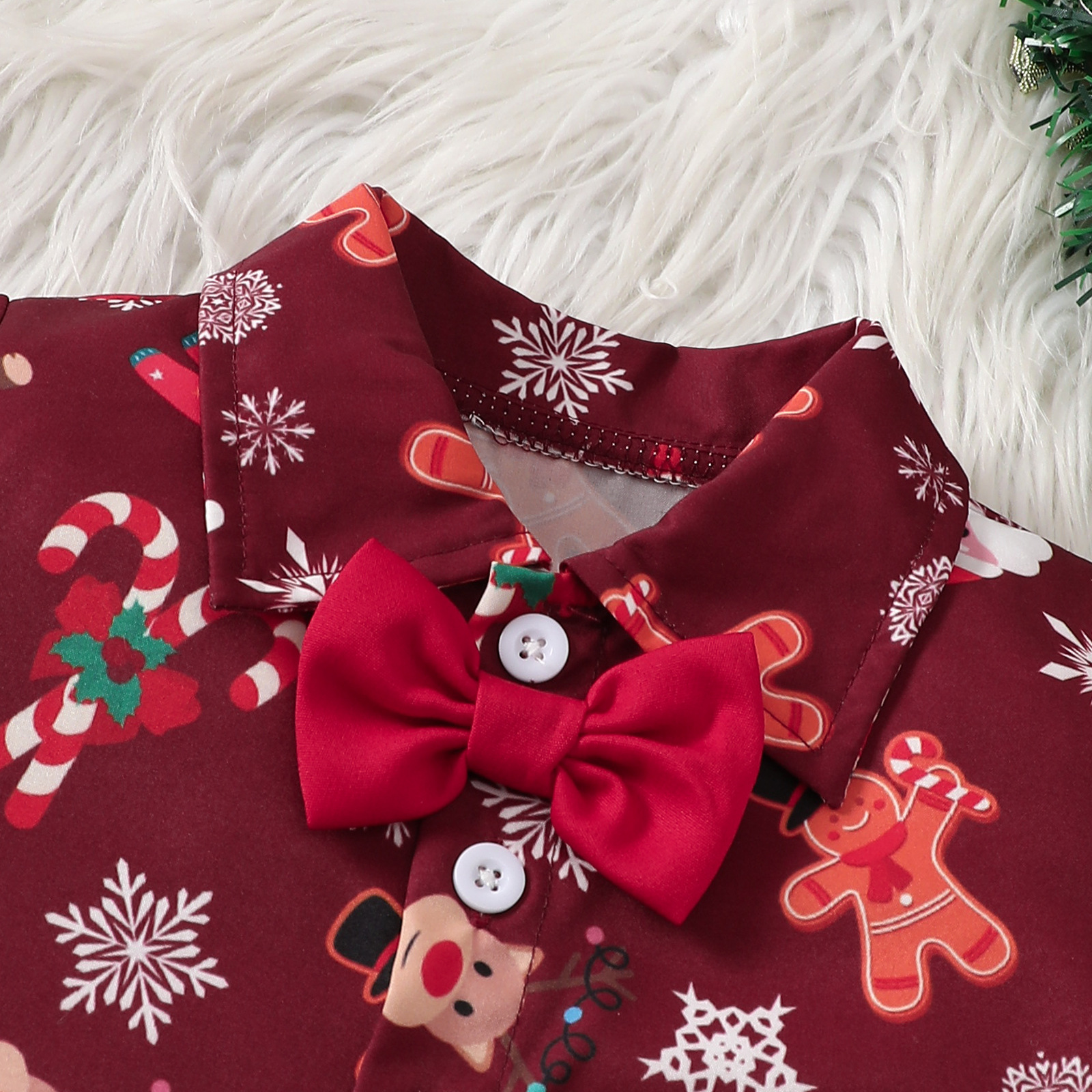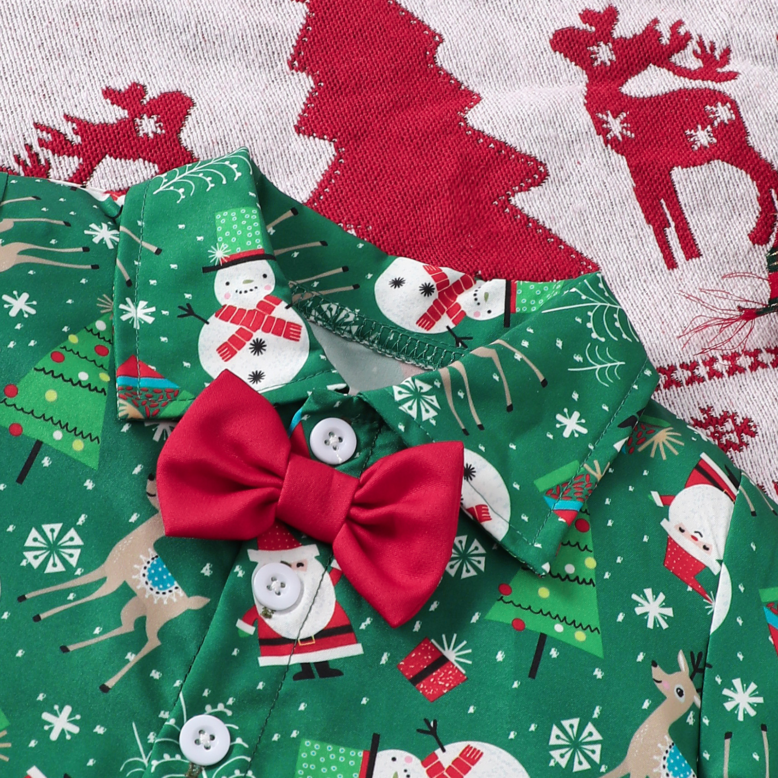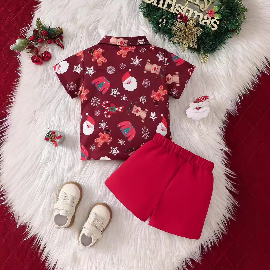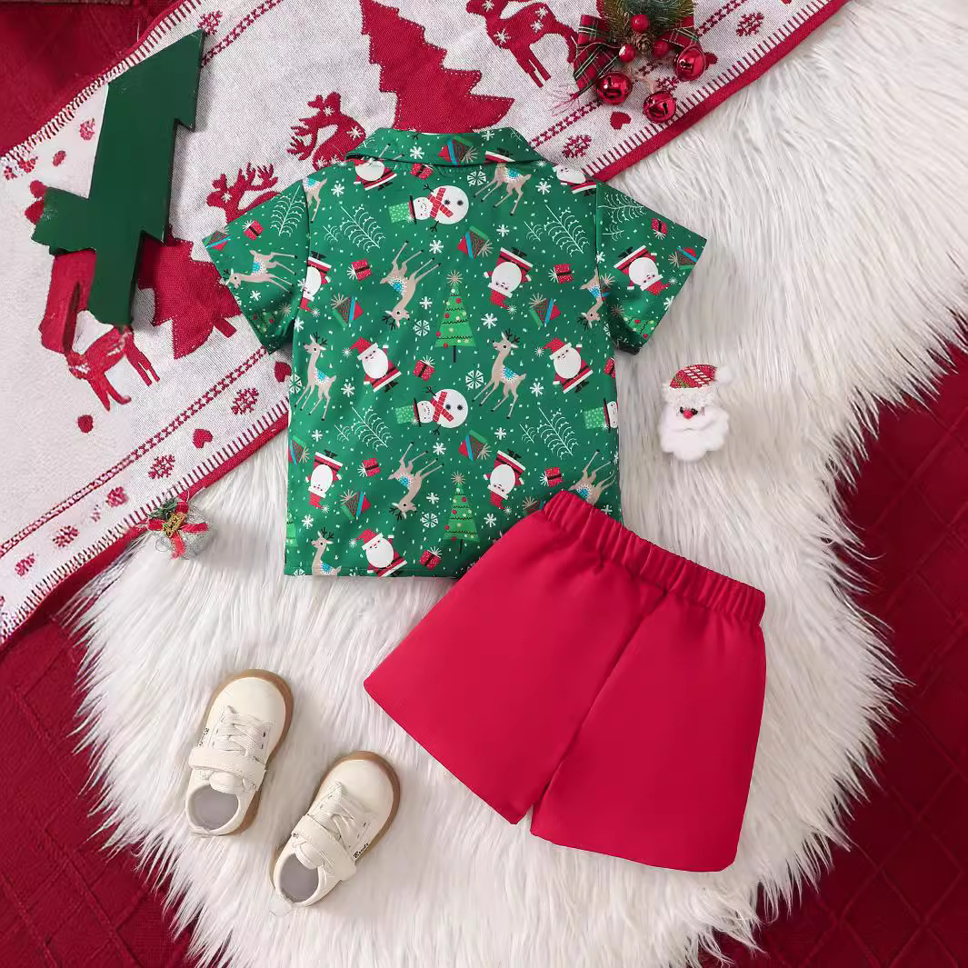 크리스마스 아동복 2024 여름 새로운 중소 소년 만화 크리스마스 프린트 짧은 소매 셔츠 반바지 투피스 세트