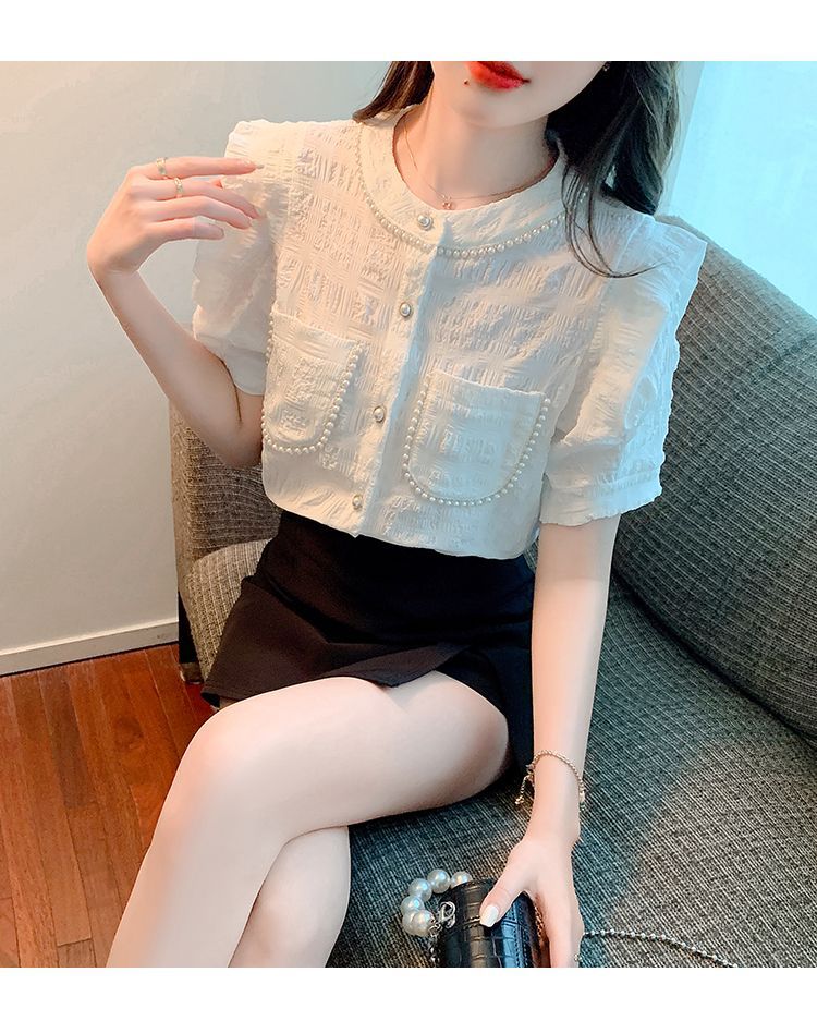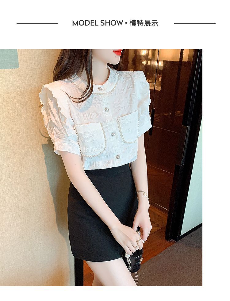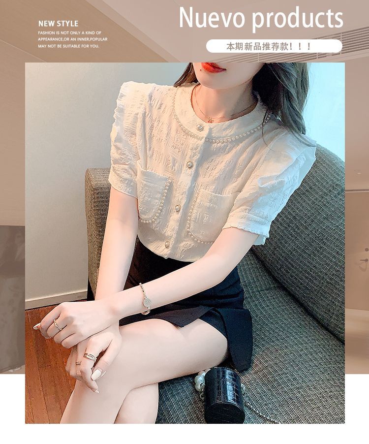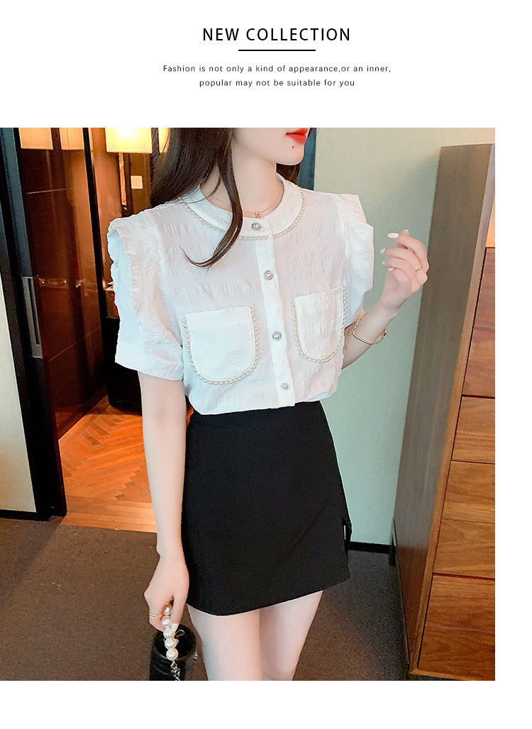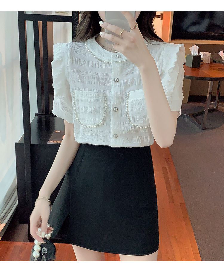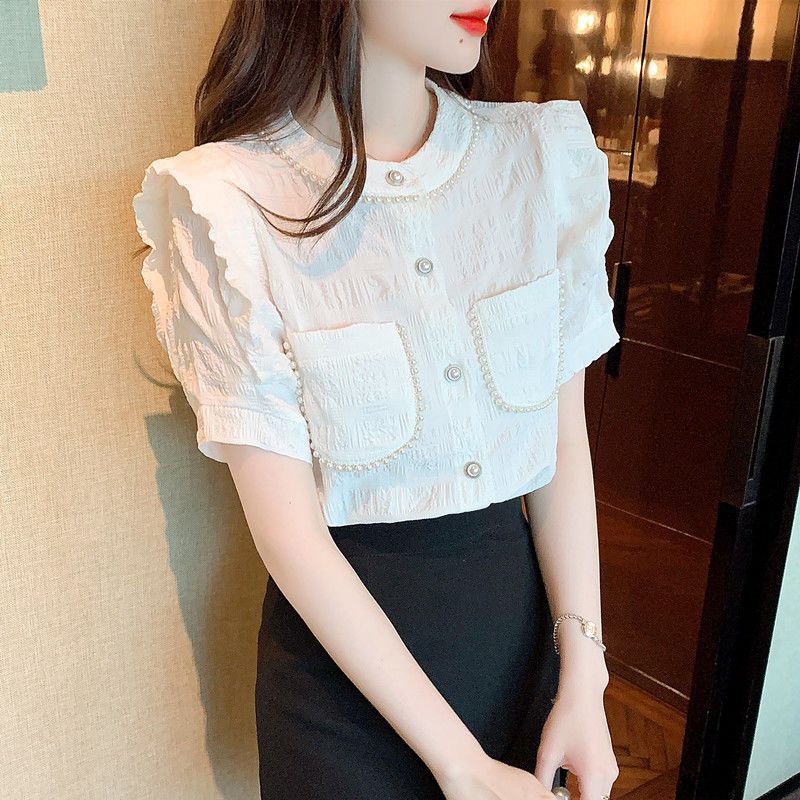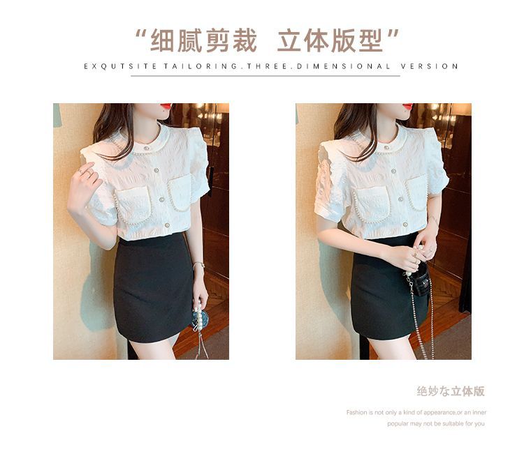 프랑스 스타일 샤넬 스타일 짧은 소매 셔츠 여성 여름 디자인 요정 화이트 플라잉 슬리브 달콤한 나이 감소 쉬폰 셔츠 탑스토어 가기