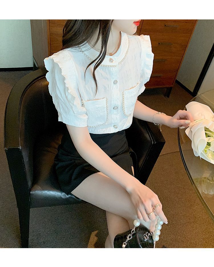 프랑스 스타일 샤넬 스타일 짧은 소매 셔츠 여성 여름 디자인 요정 화이트 플라잉 슬리브 달콤한 나이 감소 쉬폰 셔츠 탑