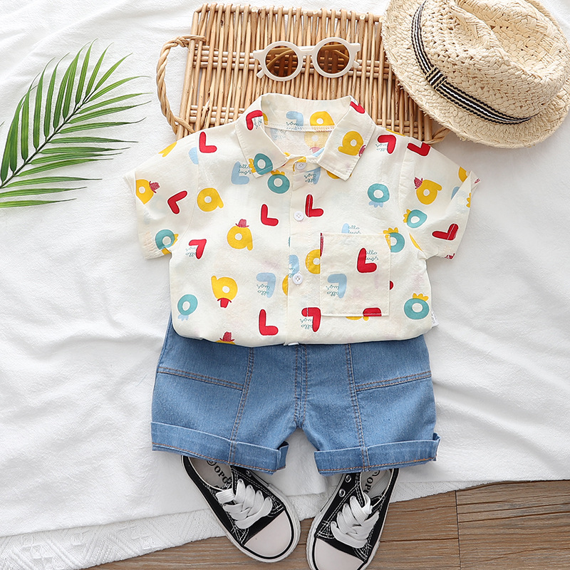 남학생 여름 착용 세트 2024 새로운 스타일 어린이 서양식 남성 여름 아기 셔츠 반팔 투피스 캐주얼 트렌디