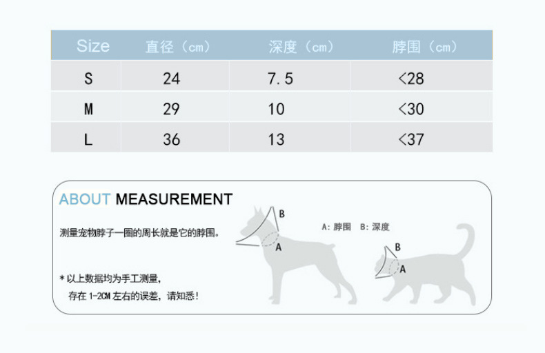 • S: 지름 24cm (목둘레 28cm 이내 적용 가능) 고양이 1.5-3kg / 개 0.5-2kg