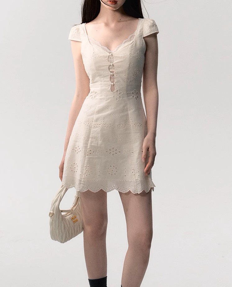 OAKMO/ "욱신 거리는 시간" 크림 흰색 간단한 슬림 레이스 스티칭 원피스 여성의 여름 질감