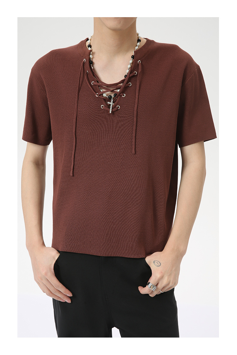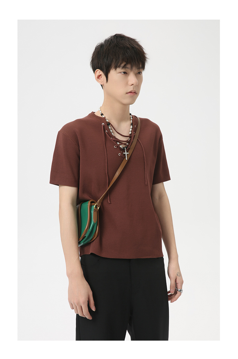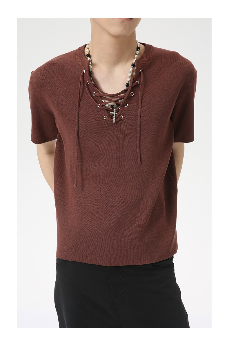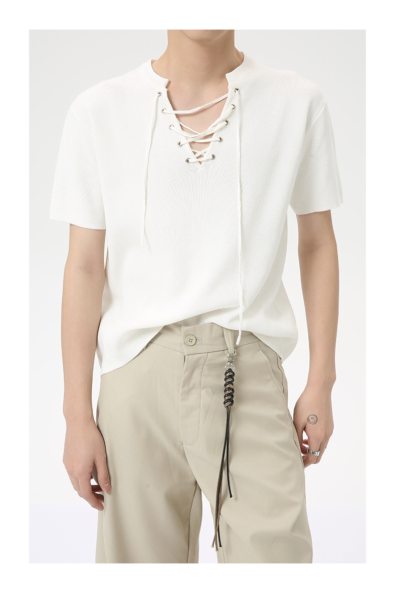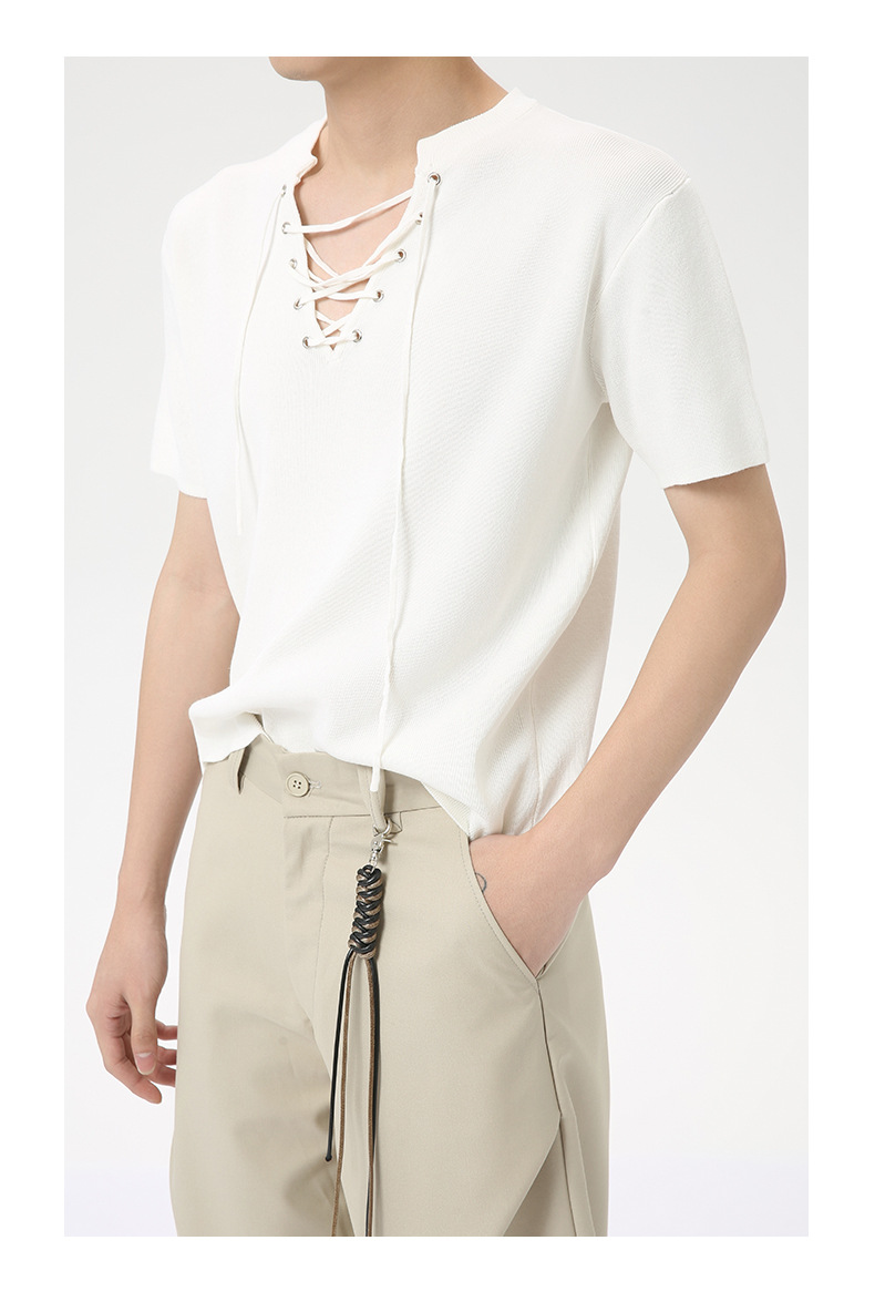 MTLCLOTHES 남성용 | 2024 년 여름 새로운 틈새 V 넥 드로우 스트링 디자인 순수 컬러 니트 재킷