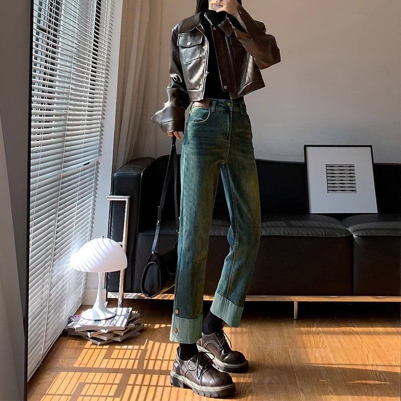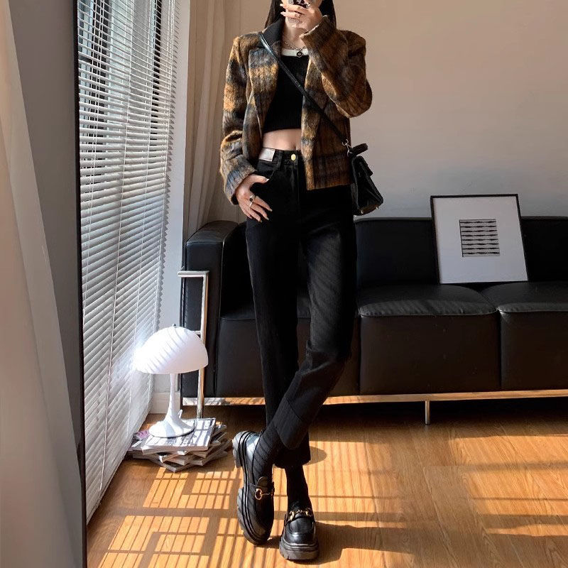 틈새 레트로 스트레이트 다리 바지 스트레치 높은 허리 청바지 여성의 2024 새로운 느슨한 홍콩 스타일 자른 파이프 바지스토어 가기